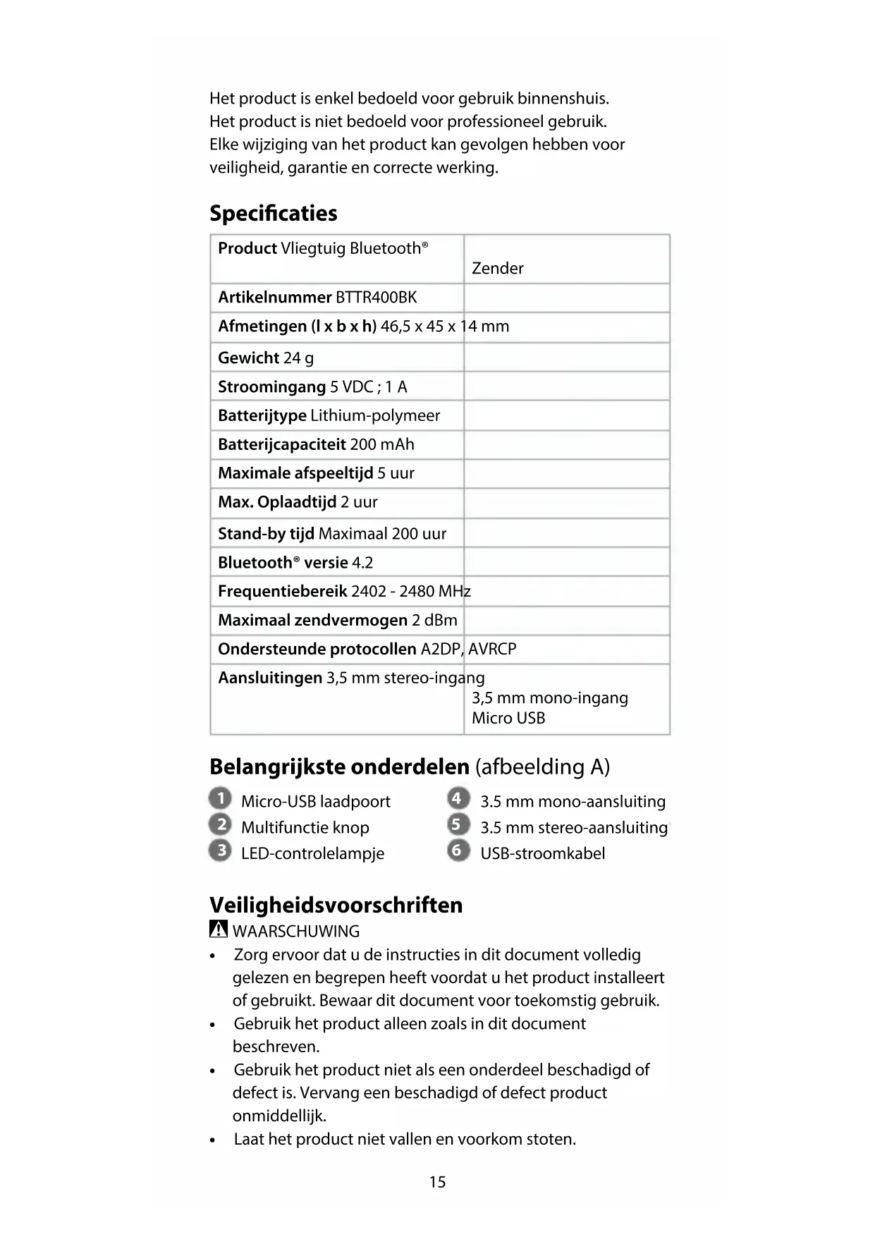 Verkorte handleiding Vliegtuig Bluetooth® Zender BTTR400BK Zie voor meer informatie de uitgebreide handleiding online: ned.is/bttr400bk Bedoeld gebruik De BTTR400BK kan worden aangesloten op de audio-uitgang in een vliegtuig om het geluid naar uw draadloze Bluetooth-hoofdtelefoon over te brengen.15 Het product is enkel bedoeld voor gebruik binnenshuis. Het product is niet bedoeld voor professioneel gebruik. Elke wijziging van het product kan gevolgen hebben voor veiligheid, garantie en correcte werking. Specicaties Product Vliegtuig Bluetooth® Zender Artikelnummer BTTR400BK Afmetingen (l x b x h) 46,5 x 45 x 14 mm Gewicht 24 g Stroomingang 5 VDC ; 1 A Batterijtype Lithium-polymeer Batterijcapaciteit 200 mAh Maximale afspeeltijd 5 uur Max. Oplaadtijd 2 uur Stand-by tijd Maximaal 200 uur Bluetooth® versie 4.2 Frequentiebereik 2402 - 2480 MHz Maximaal zendvermogen 2 dBm Ondersteunde protocollen A2DP, AVRCP Aansluitingen 3,5 mm stereo-ingang 3,5 mm mono-ingang Micro USB Belangrijkste onderdelen (afbeelding A)