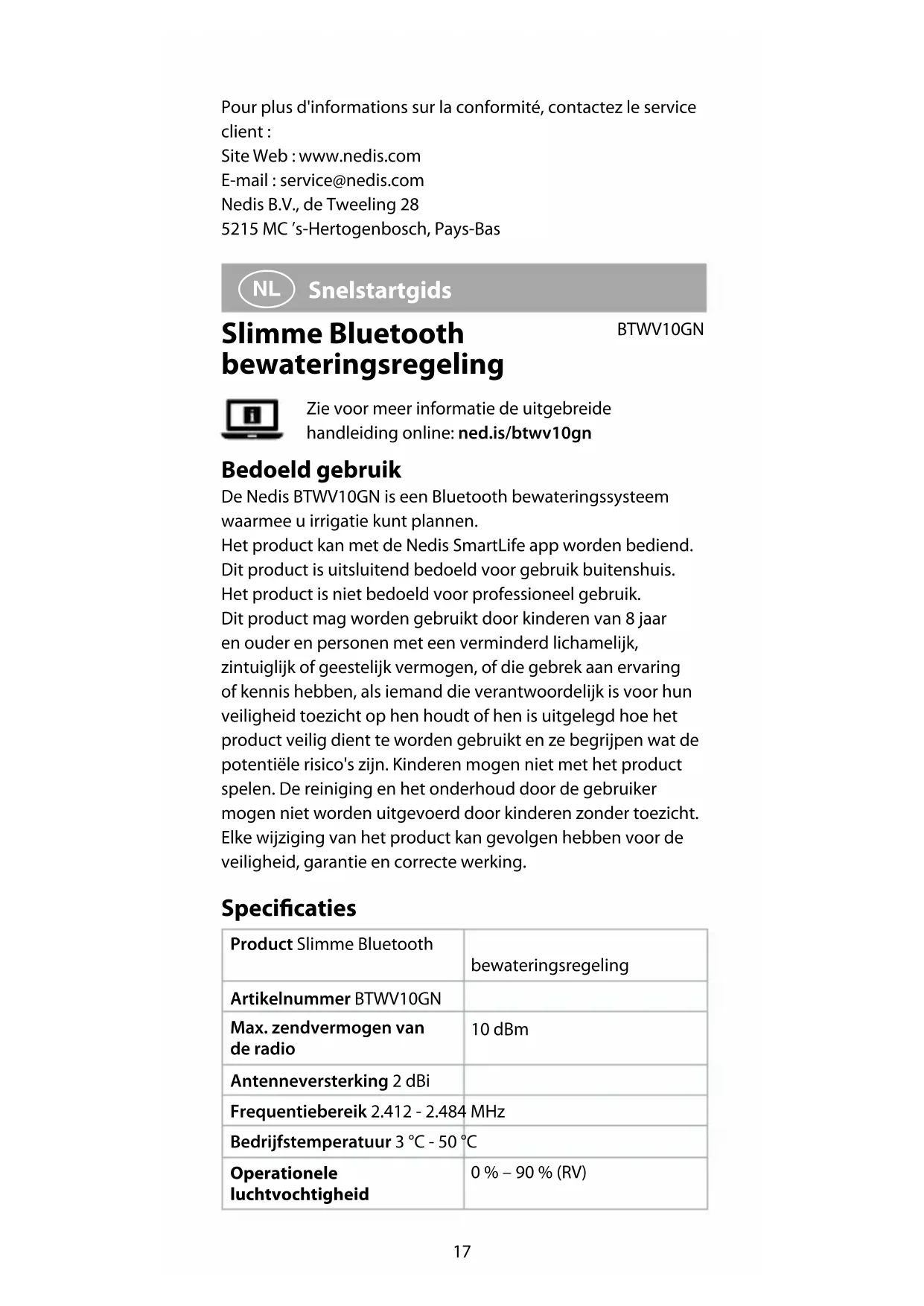 Snelstartgids Slimme Bluetooth bewateringsregeling BTWV10GN Zie voor meer informatie de uitgebreide handleiding online: ned.is/btwv10gn Bedoeld gebruik De Nedis BTWV10GN is een Bluetooth bewateringssysteem waarmee u irrigatie kunt plannen. Het product kan met de Nedis SmartLife app worden bediend. Dit product is uitsluitend bedoeld voor gebruik buitenshuis. Het product is niet bedoeld voor professioneel gebruik. Dit product mag worden gebruikt door kinderen van 8 jaar en ouder en personen met een verminderd lichamelijk, zintuiglijk of geestelijk vermogen, of die gebrek aan ervaring of kennis hebben, als iemand die verantwoordelijk is voor hun veiligheid toezicht op hen houdt of hen is uitgelegd hoe het product veilig dient te worden gebruikt en ze begrijpen wat de potentiële risico's zijn. Kinderen mogen niet met het product spelen. De reiniging en het onderhoud door de gebruiker mogen niet worden uitgevoerd door kinderen zonder toezicht. Elke wijziging van het product kan gevolgen hebben voor de veiligheid, garantie en correcte werking. Specicaties Product Slimme Bluetooth bewateringsregeling Artikelnummer BTWV10GN Max. zendvermogen van de radio 10 dBm Antenneversterking 2 dBi Frequentiebereik 2.412 - 2.484 MHz Bedrijfstemperatuur 3 °C - 50 °C Operationele luchtvochtigheid 0 % – 90 % (RV)18 Operationele waterdruk 0,5 - 8 bar (10 - 120 PSI) Operationeel waterdebiet 5 - 35 L/min Waterdicht IP54 Bewateringsfrequentie Elke dag of een willekeurige dag Bewateringstijden Max. 3 keer per dag Bewateringsduur 1 min - 11 uur 59 min Vernevelingsduur 5 s - 59 s Max. intervaltijd 15 min 59 s Vernevelingsperiode 1 min - 11 uur 59 min Batterijtype 4 x AA (niet meegeleverd) Belangrijkste onderdelen (afbeelding A) 1 Statusindicatie LED 2 Bedieningsknop 3 Ruimte voor de batterijhouder 4 Batterijcompartiment 5 Waterlter 6 Watertoevoer 7 Wateruitvoer App-overzicht (afbeelding B) 1 Laatste waterverbruik 2 Batterijstatus / Momenteel actieve modus / Resterende tijd tot volgende irrigatie 3 Handmatige modus 4 Parameter 5 Schakel tussen Celsius en Fahrenheit. 6 Irrigatieschema's aanpassen 7 Sensor 8 Details en instructies Veiligheidsvoorschriften