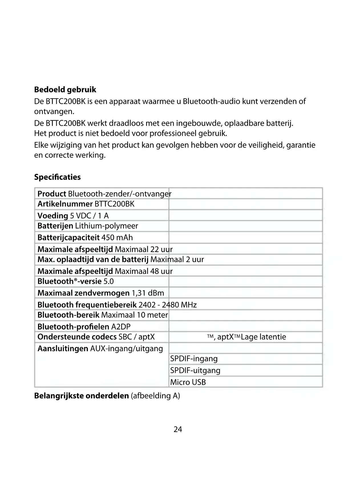 Snelstartgids Bluetooth-zender/-ontvanger BTTC200BK Zie voor meer informatie de uitgebreide handleiding online: ned.is/bttc200bk24 Bedoeld gebruik De BTTC200BK is een apparaat waarmee u Bluetooth-audio kunt verzenden of ontvangen. De BTTC200BK werkt draadloos met een ingebouwde, oplaadbare batterij. Het product is niet bedoeld voor professioneel gebruik. Elke wijziging van het product kan gevolgen hebben voor de veiligheid, garantie en correcte werking. Specicaties Product Bluetooth-zender/-ontvanger Artikelnummer BTTC200BK Voeding 5 VDC / 1 A Batterijen Lithium-polymeer Batterijcapaciteit 450 mAh Maximale afspeeltijd Maximaal 22 uur Max. oplaadtijd van de batterij Maximaal 2 uur Maximale afspeeltijd Maximaal 48 uur Bluetooth®-versie 5.0 Maximaal zendvermogen 1,31 dBm Bluetooth frequentiebereik 2402 - 2480 MHz Bluetooth-bereik Maximaal 10 meter Bluetooth-proelen A2DP Ondersteunde codecs SBC / aptX