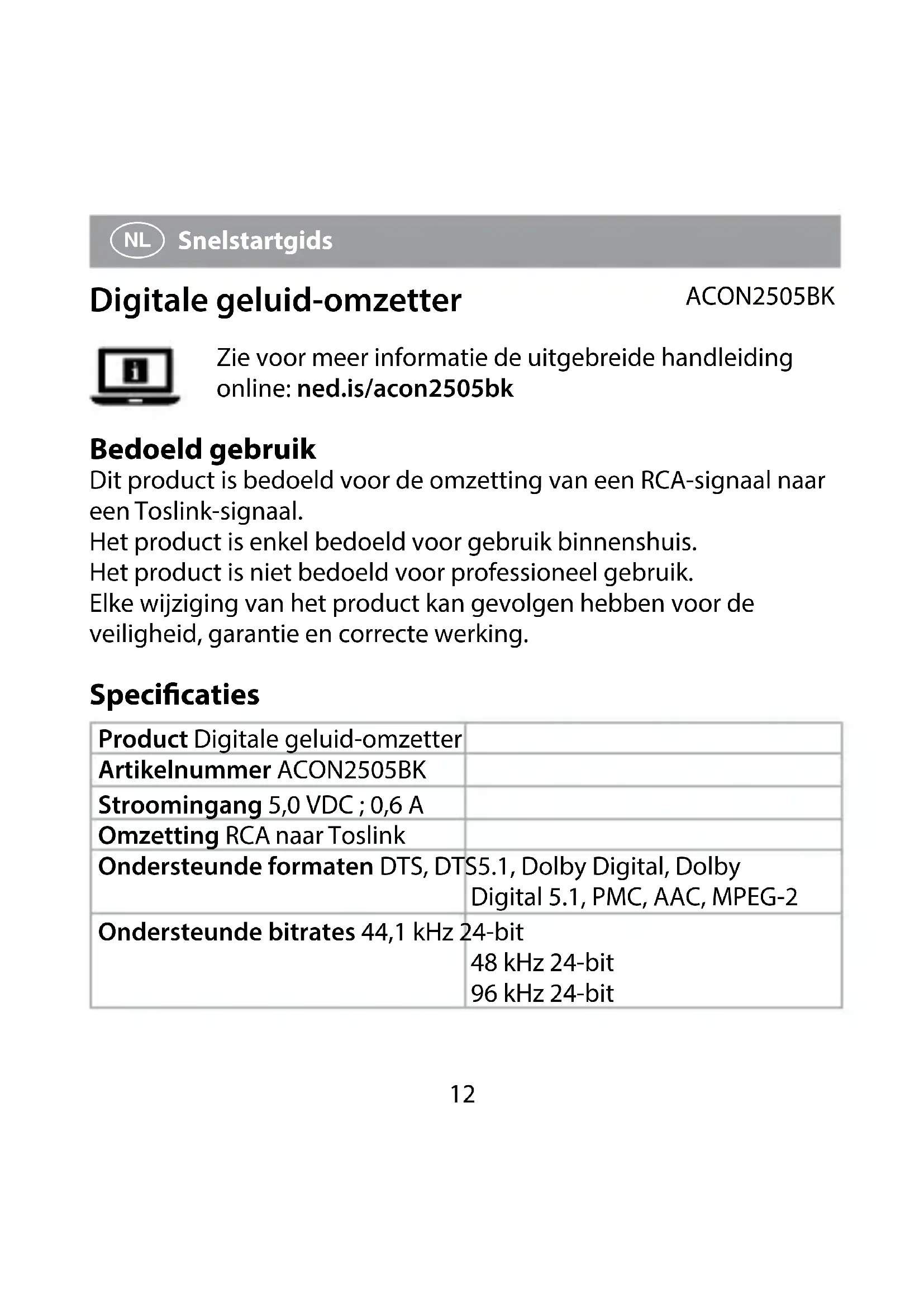Snelstartgids Digitale geluid-omzetter ACON2505BK Zie voor meer informatie de uitgebreide handleiding online: ned.is/acon2505bk Bedoeld gebruik Dit product is bedoeld voor de omzetting van een RCA-signaal naar een Toslink-signaal. Het product is enkel bedoeld voor gebruik binnenshuis. Het product is niet bedoeld voor professioneel gebruik. Elke wijziging van het product kan gevolgen hebben voor de veiligheid, garantie en correcte werking. Specicaties Product Digitale geluid-omzetter Artikelnummer ACON2505BK Stroomingang 5,0 VDC ; 0,6 A Omzetting RCA naar Toslink Ondersteunde formaten DTS, DTS5.1, Dolby Digital, Dolby Digital 5.1, PMC, AAC, MPEG-2 Ondersteunde bitrates 44,1 kHz 24-bit 48 kHz 24-bit 96 kHz 24-bit13 Belangrijkste onderdelen (afbeelding A)