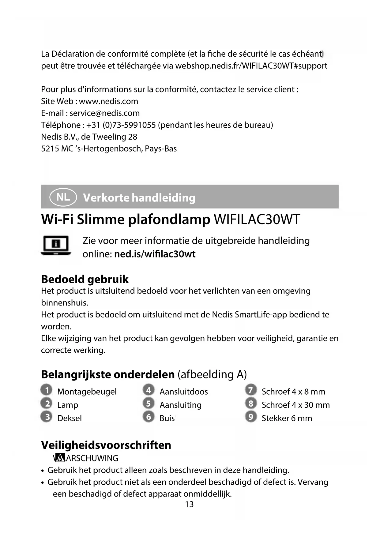Verkorte handleiding Wi-Fi Slimme plafondlamp WIFILAC30WT Zie voor meer informatie de uitgebreide handleiding online: ned.is/wilac30wt Bedoeld gebruik Het product is uitsluitend bedoeld voor het verlichten van een omgeving binnenshuis.Het product is bedoeld om uitsluitend met de Nedis SmartLife-app bediend te worden.Elke wijziging van het product kan gevolgen hebben voor veiligheid, garantie en correcte werking. Belangrijkste onderdelen (afbeelding A)