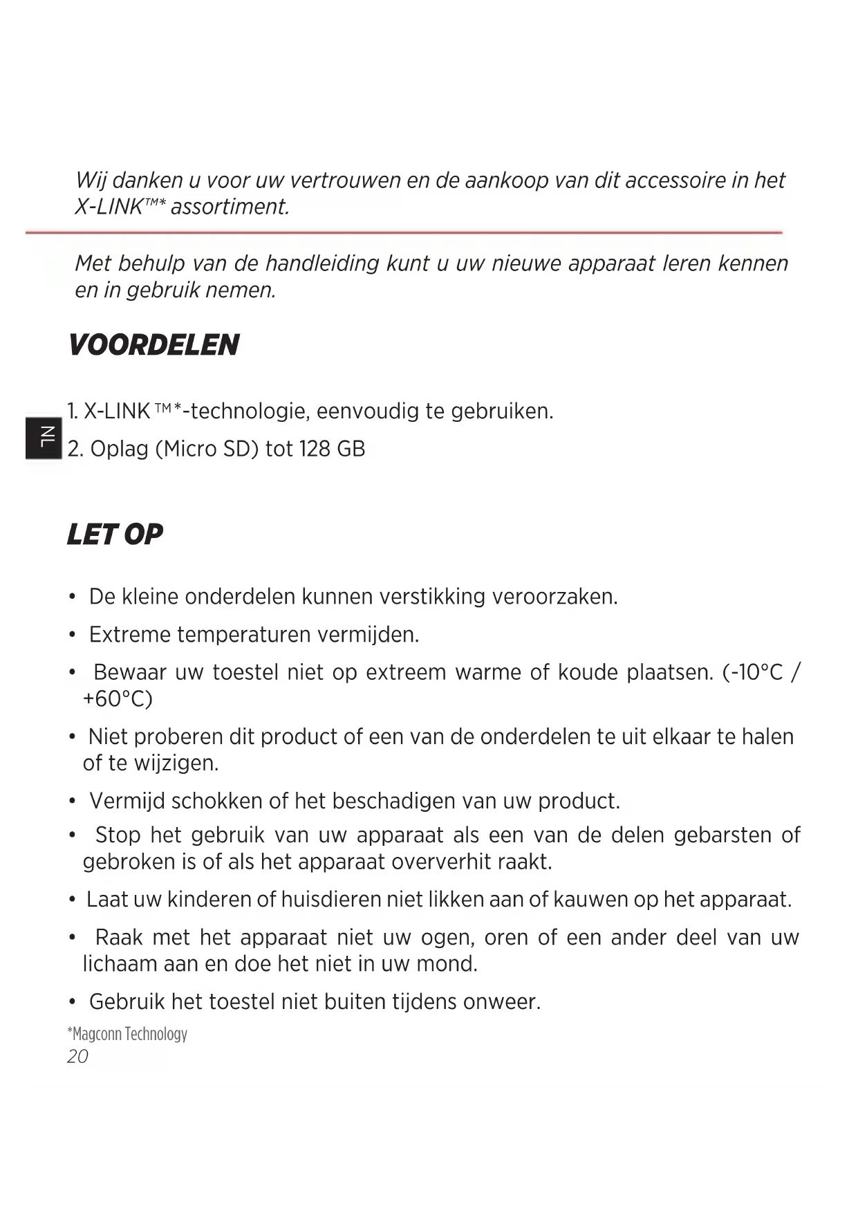 - Gebruik het toestel niet buiten tijdens onweer. Wij danken u voor uw vertrouwen en de aankoop van dit accessoire in het X-LINK™* assortiment. Met behulp van de handleiding kunt u uw nieuwe apparaat leren kennen en in gebruik nemen.