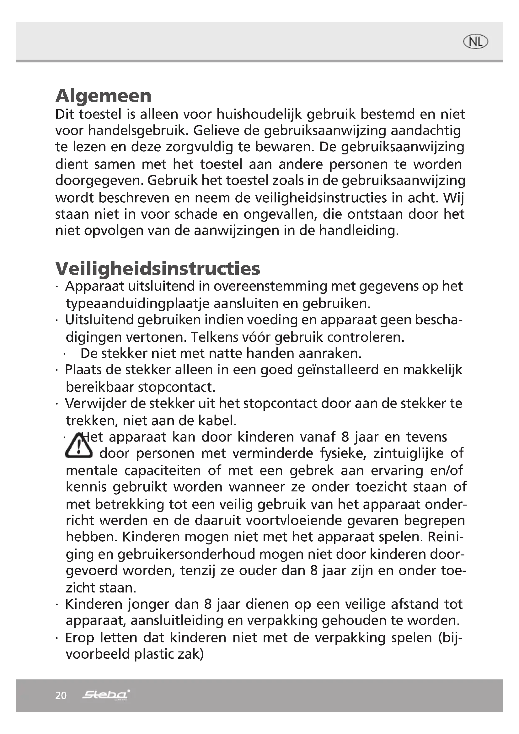 Correcte afvalverwijdering van dit product Versleten apparaten onmiddellijk onbruikbaar maken. Binnen de Europese Unie duidt dit symbool erop dat dit product niet samen met huishoudelijk afval verwijderd mag worden. Oude apparaten bevatten waardevolle, recycleerbare materialen, die aan recycling onderworpen moe- ten worden om het milieu c.q. de menselijke gezondheid niet door een onge- controleerde afvalverwijdering te schaden. Gelieve oude apparaten daarom via ge- schikte inzamelsystemen te verwijderen of het apparaat met het oog op de afvalverwijdering terug naar de afzender (waar u het product gekocht hebt) te zenden. De afzender zal dan het apparaat aan een stoffelijke recycling onderwer- pen. Evacuatie van de verpakking Verpakkingsmateriaal niet gewoon wegwerpen, maar aan recycling onderwerpen. Verpakkingen van papier, karton en gegolfd karton in verzamelcentra voor oud pa- pier afgeven. Onderdelen van kunststofverpakkingen en folie dienen eveneens in de daarvoor bestemde verzamelbakken gedeponeerd te worden. In de voorbeelden voor de kunststofbenaming staat: PE voor poly- ethyleen, het kencijfer 02 voor PE-HD, 04 voor PE-LD, PP voor poly- propyleen, PS voor polystyreen. Klantenserviceafdeling: Indien uw apparaat tegen de verwachting in dan toch al eens de klantenserviceaf- deling nodig heeft, gelieve u dan tot onderstaand adres te richten. Wij zullen dan in geval van garantie voor de afhaling zorgen. Het apparaat moet transporteerbaar verpakt zijn. Ongefrankeerde pakjes kunnen niet aanvaard worden! STEBA Elektrogeräte GmbH & Co KG Pointstr. 2, 96129 Strullendorf / Germany Verkopen-Tel.: 09543 / 449-17 / -18, Service-Tel.: 09543 / 449-44, Fax: 09543 / 449-19 e-Mail: elektro@steba.com Internet: http://www.steba.com Opgelet! Elektrische apparaten mogen uitsluitend door vakkundig geschoolde elek- triciens gerepareerd worden, omdat er door ondeskundige reparaties aanzienlijke gevolgschade kan ontstaan.25