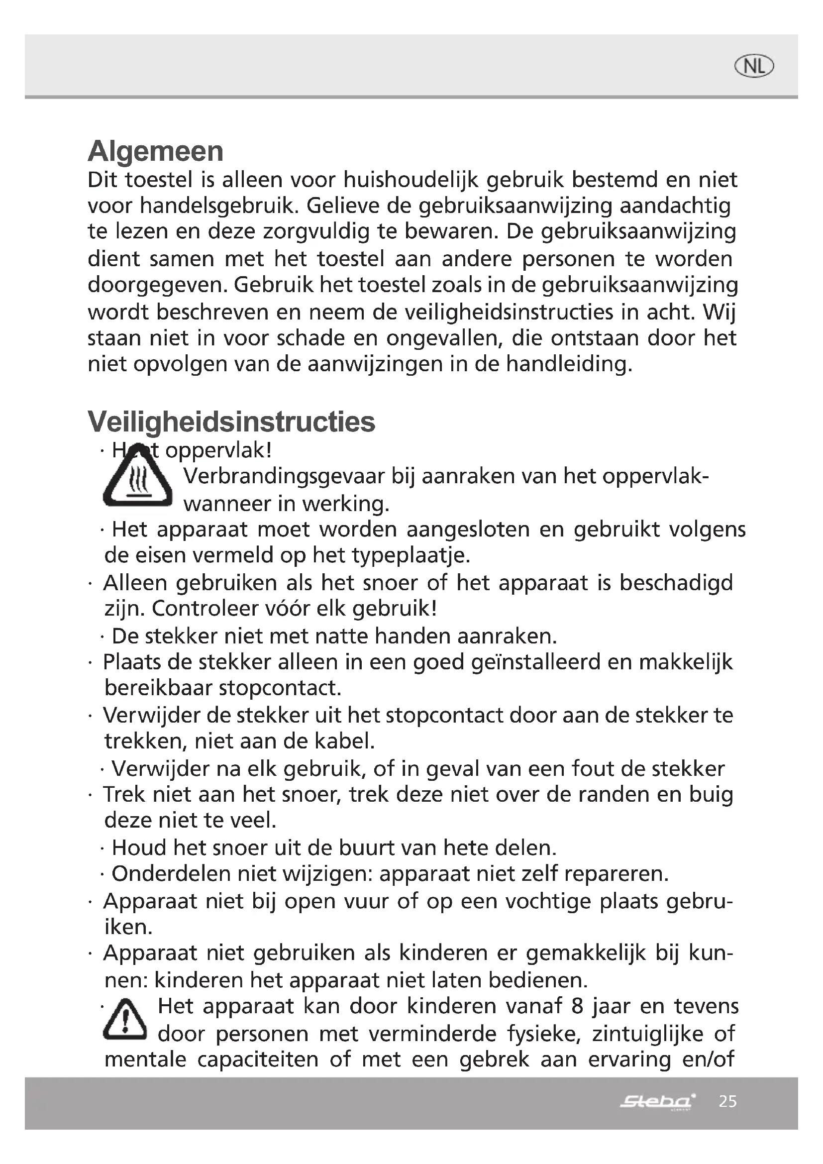 L›appareil doit être observé lors de l›utilisation. ∙24 Evacuation correcte de ce produit: Rendre les appareils ayant fait leur temps immédiatement inutilisables Au sein de l’EU, ce symbole indique que ce produit ne doit pas être évacué avec les déchets mécaniques. Les vieux appareils contiennent des matériaux qui peuvent être recyclés et qui devraient être déposés à des centres de récu- pération et afin de ne pas altérer l’environnement, voire la santé des personnes par une élimintation des déchets non-contrôlée. Veuillez donc évacuer les appareils usés par des systèmes de collecte bien appropriés ou envoyez-lea opoù vous l’avez acheté en vue d’évacuation. L’appareil sera alors amené à la récupération des matériaux. Service Après-Vente: Si contre toute attente, votre appareil devait avoir besoin du SAV, veuillez alors vous adres- ser à l’adresse suivante. Nous en organiserons alors d’enlèvement. Des paquets non affranchis ne pourront pas être pris en charge. STEBA Elektrogeräte GmbH & Co KG Pointstr. 2, 96129 Strullendorf / Germany Distribution-Tél.: 09543 / 449-17 / -18, Service-Tél.: 09543 / 449-44, Fax: 09543 / 449-19 e-Mail: elektro@steba.com Internet: http://www.steba.com Attention! Les appareils électriques ne seront réparés que par du personnel électricien qualifié étant donné que des réparations non-conformes peuvent avoir des conséquences graves.25 Algemeen Dit toestel is alleen voor huishoudelijk gebruik bestemd en niet voor handelsgebruik. Gelieve de gebruiksaanwijzing aandachtig te lezen en deze zorgvuldig te bewaren. De gebruiksaanwijzing dient samen met het toestel aan andere personen te worden doorgegeven. Gebruik het toestel zoals in de gebruiksaanwijzing wordt beschreven en neem de veiligheidsinstructies in acht. Wij staan niet in voor schade en ongevallen, die ontstaan door het niet opvolgen van de aanwijzingen in de handleiding. Veiligheidsinstructies ∙ Heet oppervlak! Verbrandingsgevaar bij aanraken van het oppervlak- wanneer in werking. ∙ Het apparaat moet worden aangesloten en gebruikt volgens de eisen vermeld op het typeplaatje. ∙ Alleen gebruiken als het snoer of het apparaat is beschadigd zijn. Controleer vóór elk gebruik! ∙ De stekker niet met natte handen aanraken. ∙ Plaats de stekker alleen in een goed geïnstalleerd en makkelijk bereikbaar stopcontact. ∙ Verwijder de stekker uit het stopcontact door aan de stekker te trekken, niet aan de kabel. ∙ Verwijder na elk gebruik, of in geval van een fout de stekker ∙ Trek niet aan het snoer, trek deze niet over de randen en buig deze niet te veel. ∙ Houd het snoer uit de buurt van hete delen. ∙ Onderdelen niet wijzigen: apparaat niet zelf repareren. ∙ Apparaat niet bij open vuur of op een vochtige plaats gebru- iken. ∙ Apparaat niet gebruiken als kinderen er gemakkelijk bij kun- nen: kinderen het apparaat niet laten bedienen.