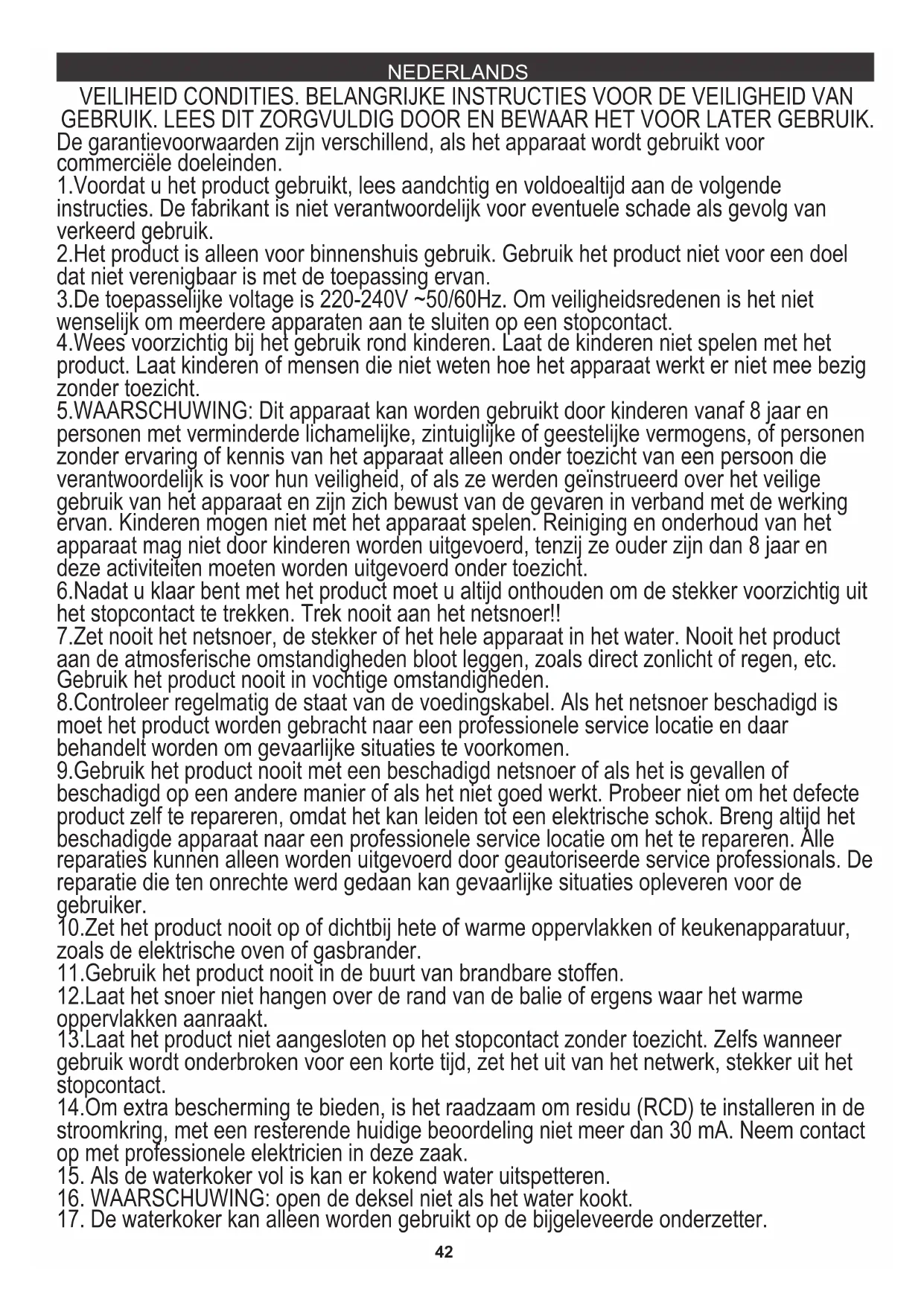 Kalkinkerrostumat vedenkeittimen sisällä tulisi poistaa säännöllisesti. Takuu ei kata tätä toimintaa. Säännöllisen kalkinpoiston puute johtaa vedenkeittimen vaurioitumiseen ja takuun menettämiseen. Kalkinpoistoon käytettävä valmisteita, jotka on erityisesti suunniteltu tätä tarkoitusta varten kalkinpoistoaineita koskevien ohjeiden mukaisesti. Kalkinpoiston jälkeen huuhtele vedenkeitin huolellisesti kolme kertaa. Poista suodatin (6) tarpeen mukaan huuhtelemiseksi juoksevan veden alla. Teho: 1850 - 2 200W TEKNISET TIEDOT: Laite on valmistettu I suojausluokassa ja vaatii maadoituksen. Tuotteen tuotekilvessä on CE merkintä Laite täyttää direktiivien vaatimukset: Matalajännitesähkölaitteet (LVD) Elektromagneettinen yhteensopivuus (EMC) Kantakaamme huolta ympäristöstä. Pahvipakkauksen pyydämme laittamaan paperikierrätykseen. Polyeteenipussit (PE) tulee laittaa muovien kierrätysastiaan. Loppuun käytetyt laitteet tulee toimittaa asianmukaiseen keräyspisteeseen, koska laitteen sisältämät vaaralliset aineosat voivat olla ympäristölle vahingollisia. Sähkölaite tulee toimittaa siten, että sen uudelleenkäyttö on estetty. Jos laitteessa on paristo, paristo tulee poistaa ja toimittaa erillisesti keräyspisteeseen.42 VEILIHEID CONDITIES. BELANGRIJKE INSTRUCTIES VOOR DE VEILIGHEID VAN GEBRUIK. LEES DIT ZORGVULDIG DOOR EN BEWAAR HET VOOR LATER GEBRUIK. 2.Het product is alleen voor binnenshuis gebruik. Gebruik het product niet voor een doel dat niet verenigbaar is met de toepassing ervan. 4.Wees voorzichtig bij het gebruik rond kinderen. Laat de kinderen niet spelen met het product. Laat kinderen of mensen die niet weten hoe het apparaat werkt er niet mee bezig zonder toezicht. 8.Controleer regelmatig de staat van de voedingskabel. Als het netsnoer beschadigd is moet het product worden gebracht naar een professionele service locatie en daar behandelt worden om gevaarlijke situaties te voorkomen. 10.Zet het product nooit op of dichtbij hete of warme oppervlakken of keukenapparatuur, zoals de elektrische oven of gasbrander. 11.Gebruik het product nooit in de buurt van brandbare stoffen. 9.Gebruik het product nooit met een beschadigd netsnoer of als het is gevallen of beschadigd op een andere manier of als het niet goed werkt. Probeer niet om het defecte product zelf te repareren, omdat het kan leiden tot een elektrische schok. Breng altijd het beschadigde apparaat naar een professionele service locatie om het te repareren. Alle reparaties kunnen alleen worden uitgevoerd door geautoriseerde service professionals. De reparatie die ten onrechte werd gedaan kan gevaarlijke situaties opleveren voor de gebruiker. 12.Laat het snoer niet hangen over de rand van de balie of ergens waar het warme oppervlakken aanraakt. 5.WAARSCHUWING: Dit apparaat kan worden gebruikt door kinderen vanaf 8 jaar en personen met verminderde lichamelijke, zintuiglijke of geestelijke vermogens, of personen zonder ervaring of kennis van het apparaat alleen onder toezicht van een persoon die verantwoordelijk is voor hun veiligheid, of als ze werden geïnstrueerd over het veilige gebruik van het apparaat en zijn zich bewust van de gevaren in verband met de werking ervan. Kinderen mogen niet met het apparaat spelen. Reiniging en onderhoud van het apparaat mag niet door kinderen worden uitgevoerd, tenzij ze ouder zijn dan 8 jaar en deze activiteiten moeten worden uitgevoerd onder toezicht. 1.Voordat u het product gebruikt, lees aandchtig en voldoealtijd aan de volgende instructies. De fabrikant is niet verantwoordelijk voor eventuele schade als gevolg van verkeerd gebruik. 13.Laat het product niet aangesloten op het stopcontact zonder toezicht. Zelfs wanneer gebruik wordt onderbroken voor een korte tijd, zet het uit van het netwerk, stekker uit het stopcontact. 14.Om extra bescherming te bieden, is het raadzaam om residu (RCD) te installeren in de stroomkring, met een resterende huidige beoordeling niet meer dan 30 mA. Neem contact op met professionele elektricien in deze zaak.