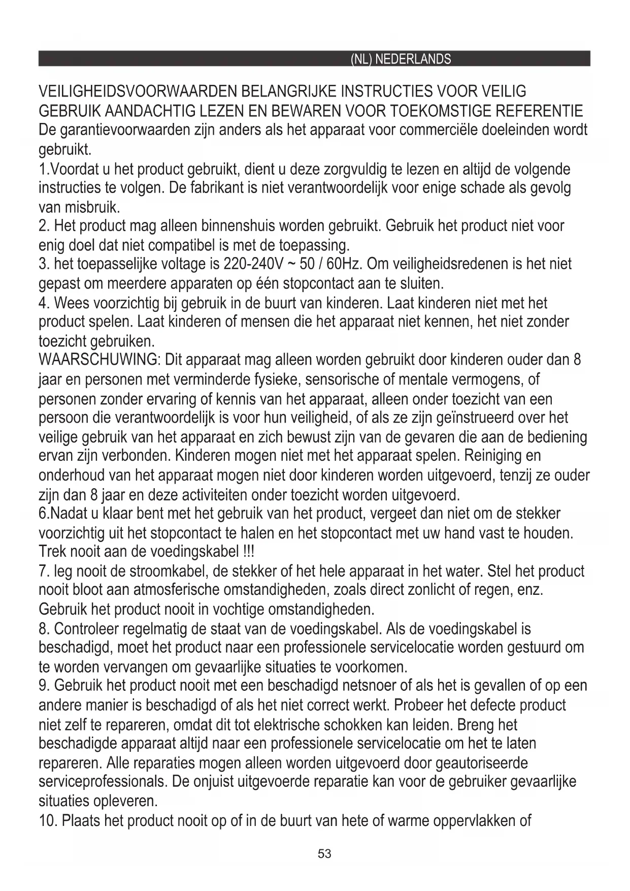 1.Voordat u het product gebruikt, dient u deze zorgvuldig te lezen en altijd de volgende instructies te volgen. De fabrikant is niet verantwoordelijk voor enige schade als gevolg van misbruik. WAARSCHUWING: Dit apparaat mag alleen worden gebruikt door kinderen ouder dan 8 jaar en personen met verminderde fysieke, sensorische of mentale vermogens, of personen zonder ervaring of kennis van het apparaat, alleen onder toezicht van een persoon die verantwoordelijk is voor hun veiligheid, of als ze zijn geïnstrueerd over het veilige gebruik van het apparaat en zich bewust zijn van de gevaren die aan de bediening ervan zijn verbonden. Kinderen mogen niet met het apparaat spelen. Reiniging en onderhoud van het apparaat mogen niet door kinderen worden uitgevoerd, tenzij ze ouder zijn dan 8 jaar en deze activiteiten onder toezicht worden uitgevoerd. 6.Nadat u klaar bent met het gebruik van het product, vergeet dan niet om de stekker voorzichtig uit het stopcontact te halen en het stopcontact met uw hand vast te houden. Trek nooit aan de voedingskabel !!! De garantievoorwaarden zijn anders als het apparaat voor commerciële doeleinden wordt gebruikt.