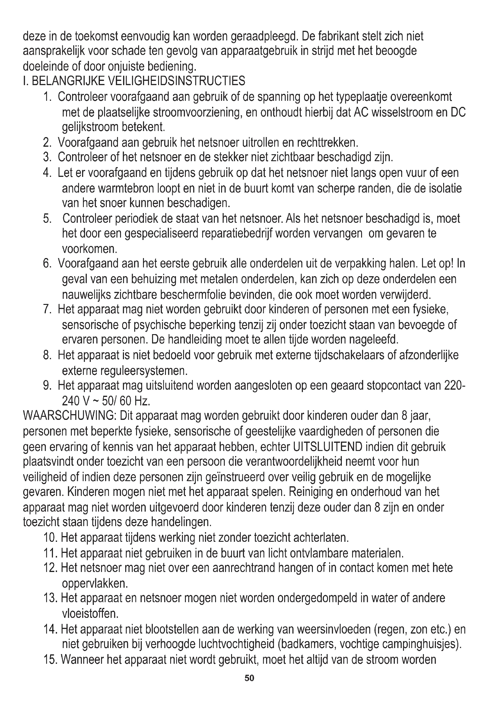het door een gespecialiseerd reparatiebedrijf worden vervangen om gevaren te voorkomen. WAARSCHUWING: Dit apparaat mag worden gebruikt door kinderen ouder dan 8 jaar, personen met beperkte fysieke, sensorische of geestelijke vaardigheden of personen die geen ervaring of kennis van het apparaat hebben, echter UITSLUITEND indien dit gebruik plaatsvindt onder toezicht van een persoon die verantwoordelijkheid neemt voor hun veiligheid of indien deze personen zijn geïnstrueerd over veilig gebruik en de mogelijke gevaren. Kinderen mogen niet met het apparaat spelen. Reiniging en onderhoud van het apparaat mag niet worden uitgevoerd door kinderen tenzij deze ouder dan 8 zijn en onder toezicht staan tijdens deze handelingen.