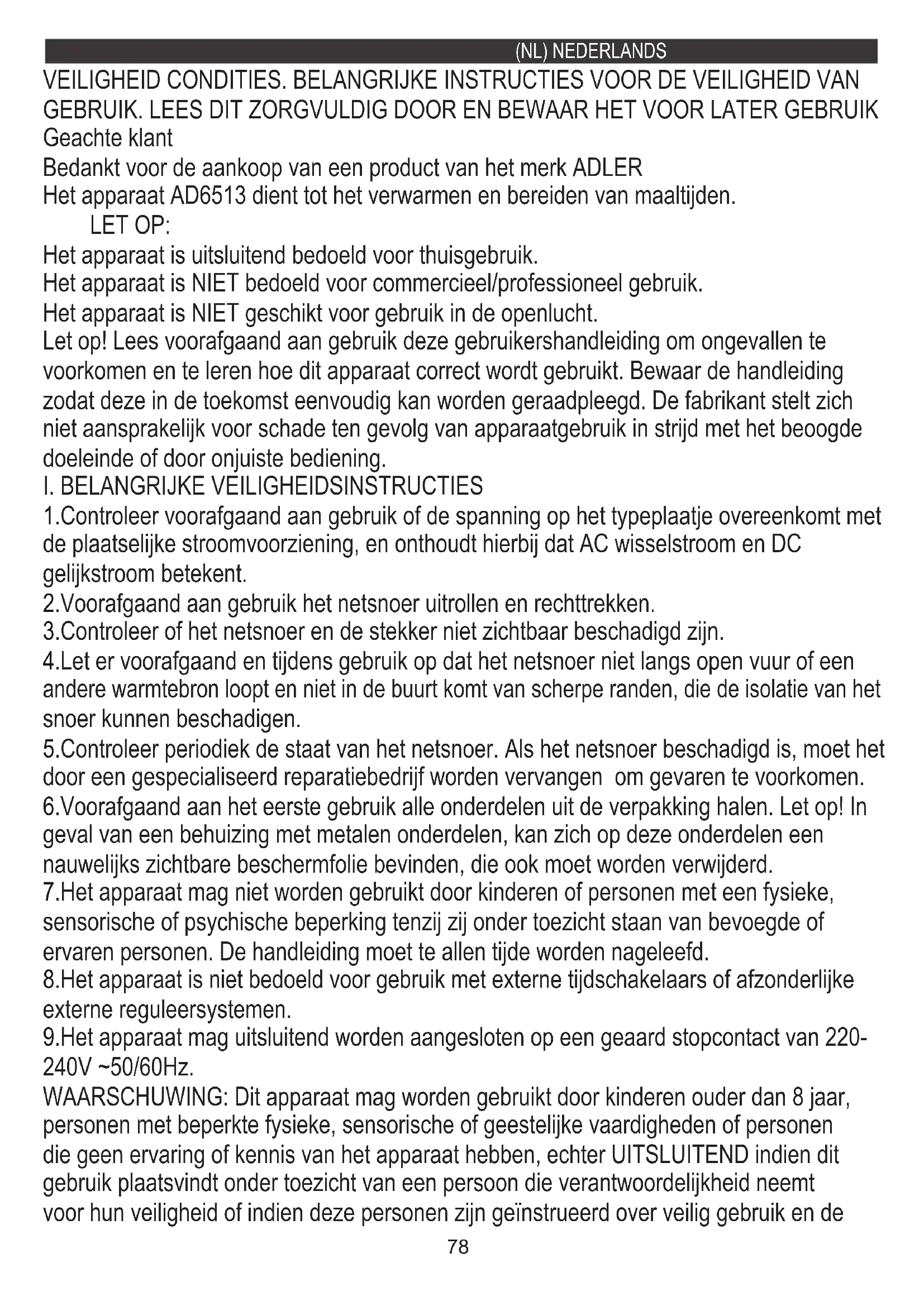 Let op! Lees voorafgaand aan gebruik deze gebruikershandleiding om ongevallen te voorkomen en te leren hoe dit apparaat correct wordt gebruikt. Bewaar de handleiding zodat deze in de toekomst eenvoudig kan worden geraadpleegd. De fabrikant stelt zich niet aansprakelijk voor schade ten gevolg van apparaatgebruik in strijd met het beoogde doeleinde of door onjuiste bediening. 9.Het apparaat mag uitsluitend worden aangesloten op een geaard stopcontact van 220- 240V ~50/60Hz. 6.Voorafgaand aan het eerste gebruik alle onderdelen uit de verpakking halen. Let op! In geval van een behuizing met metalen onderdelen, kan zich op deze onderdelen een nauwelijks zichtbare beschermfolie bevinden, die ook moet worden verwijderd. 5.Controleer periodiek de staat van het netsnoer. Als het netsnoer beschadigd is, moet het door een gespecialiseerd reparatiebedrijf worden vervangen om gevaren te voorkomen. 8.Het apparaat is niet bedoeld voor gebruik met externe tijdschakelaars of afzonderlijke externe reguleersystemen. 2.Voorafgaand aan gebruik het netsnoer uitrollen en rechttrekken. WAARSCHUWING: Dit apparaat mag worden gebruikt door kinderen ouder dan 8 jaar, personen met beperkte fysieke, sensorische of geestelijke vaardigheden of personen die geen ervaring of kennis van het apparaat hebben, echter UITSLUITEND indien dit gebruik plaatsvindt onder toezicht van een persoon die verantwoordelijkheid neemt voor hun veiligheid of indien deze personen zijn geïnstrueerd over veilig gebruik en de 1.Controleer voorafgaand aan gebruik of de spanning op het typeplaatje overeenkomt met de plaatselijke stroomvoorziening, en onthoudt hierbij dat AC wisselstroom en DC gelijkstroom betekent. 3.Controleer of het netsnoer en de stekker niet zichtbaar beschadigd zijn. 7.Het apparaat mag niet worden gebruikt door kinderen of personen met een fysieke, sensorische of psychische beperking tenzij zij onder toezicht staan van bevoegde of ervaren personen. De handleiding moet te allen tijde worden nageleefd. Geachte klant Bedankt voor de aankoop van een product van het merk ADLER LET OP: Het apparaat is uitsluitend bedoeld voor thuisgebruik. VEILIGHEID CONDITIES. BELANGRIJKE INSTRUCTIES VOOR DE VEILIGHEID VAN GEBRUIK. LEES DIT ZORGVULDIG DOOR EN BEWAAR HET VOOR LATER GEBRUIK Het apparaat AD6513 dient tot het verwarmen en bereiden van maaltijden.