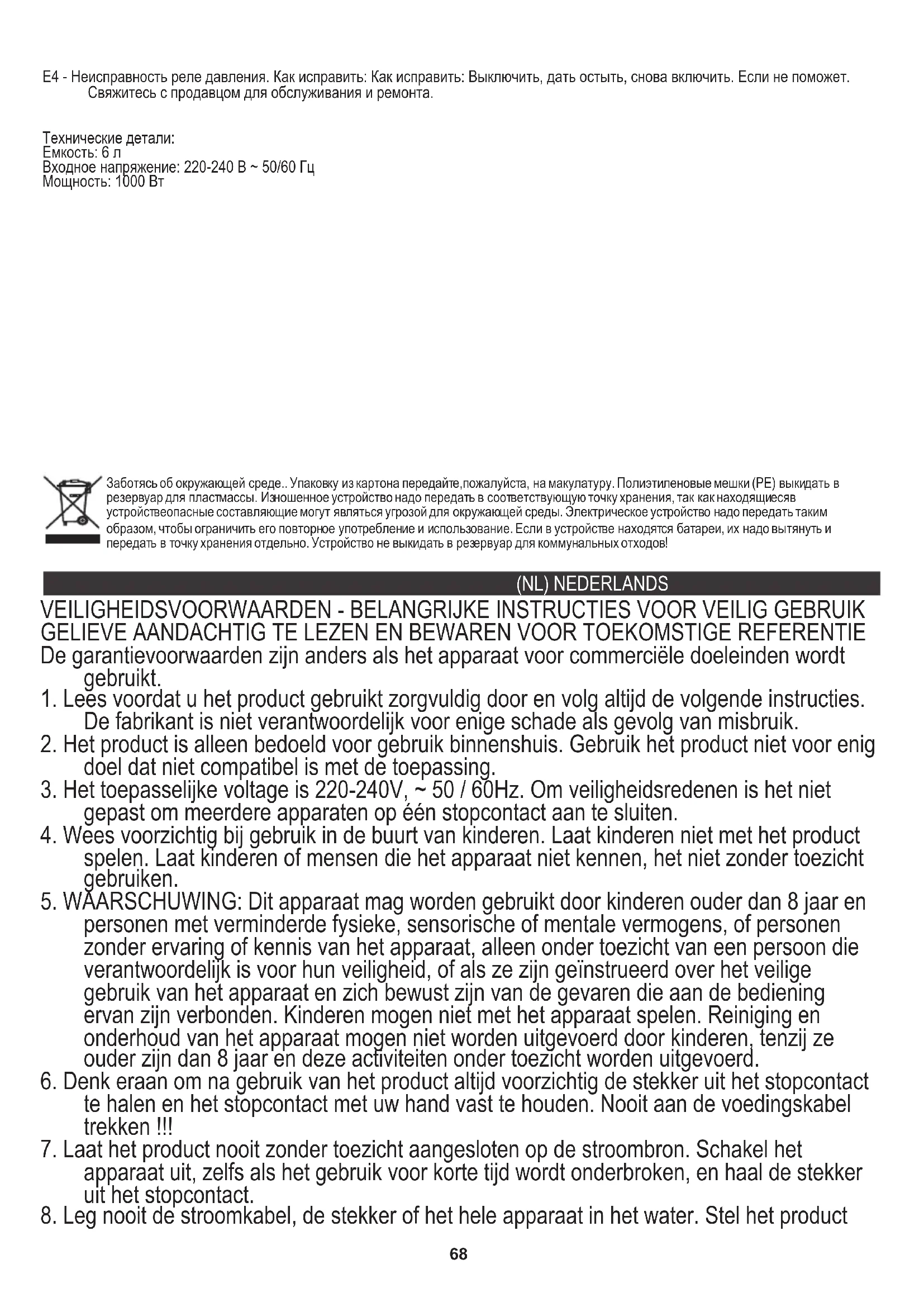 We geven om het milieu. We vragen u om de kartonnen verpakkingen te storten bij het oud papier. Polyethyleen zakken (PE) storten in de container voor plastic . Versleten apparatuur afgeven bij het juiste verzamelpunkt, als in het apparatuur gevaarlijke elementen zitten kan dat een bedreiging zijn voor het milieu. Elektrisch apparatuur moet worden geretourneerd om het hergebruik te verminderen. Als in het apparatur batterijen ziiten, horen die verwijderd te worden en appart af te worden gegeven bij het juiste verzamelpunkt. (DK) DANSKI Reden 1: Er zitten etensresten op de afdichtring van de drukklep. Oplossing: Reinig de klepafdichtring. Reden 2: Afdichtring van de drukklep kapot. Oplossen: Vervang de afdichtring van de drukklep. Vlotterklep werkt niet: Reden 1: Er zitten etensresten op de afdichtring van de vlotterklep. Oplossing: Reinig de klepafdichtring. Reden 2: Afdichtring van de drukklep kapot. Oplossen: neem contact op met de verkoper voor onderhoud en reparatie. Voortdurende afvoer van druk tijdens het werk: Reden 1: Drukbegrenzingsklep niet in verzegelde positie geplaatst. Oplossen: Zet de drukbegrenzingsklep in verzegelde positie. Reden 2: Te weinig water of voer in de pot. Oplossing: voeg water of meer voedsel toe. Reden 3: Drukschakelaar defect. Oplossen: neem contact op met de verkoper voor onderhoud en reparatie. Fouten op het display: E1 - Bodemtemperatuursensor kapot. Oplossen: neem contact op met de verkoper voor onderhoud en reparatie. E2 - Kortsluiting in bodemtemperatuur. Oplossen: uitschakelen, laten afkoelen en weer inschakelen. Als het niet helpt. Neem contact op met de verkoper voor onderhoud en reparatie. E3 - Temperatuur te hoog, niet genoeg water in binnenpot. Oplossen: uitschakelen, laten afkoelen en weer inschakelen. Voeg water toe. Als het niet helpt. Neem contact op met de verkoper voor onderhoud en reparatie. E4 - Drukschakelaar defect. Oplossen: Oplossen: uitschakelen, laten afkoelen, weer inschakelen. Als het niet helpt. Neem contact op met de verkoper voor onderhoud en reparatie.