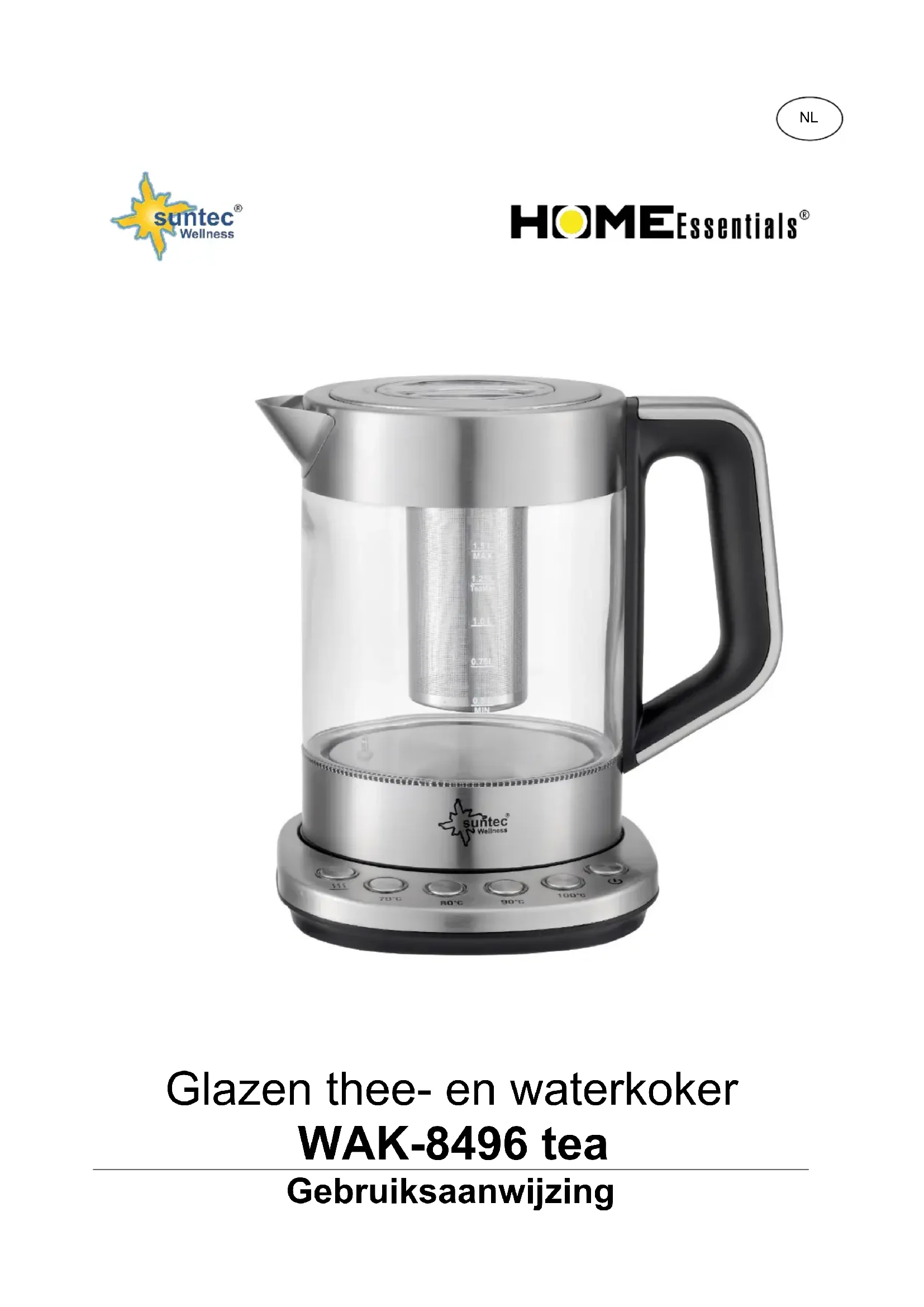 WAK-8496 tea SUNTEC WELLNESS GMBH / HOLZSTRASSE 2 / 40 221 DÜSSELDORF / ALLEMAGNEGlazen thee- en waterkoker WAK-8496 tea Gebruiksaanwijzing NLBedankt voor uw aankoop van dit apparaat van Suntec Wellness. Voor gebruik, gelieve deze handleiding zorgvuldig te lezen. Bewaar dit voor latere raadpleging en geef door aan de nieuwe koper, indien u het toestel geeft aan iemand anders. Veiligheidsvoorzorgen Dit apparaat kan gebruikt worden door kinderen van 8 jaar en ouder en personen met verminderde lichamelijke, zintuiglijke en verstandelijke vermogens of gebrek aan ervaring en kennis als ze onder toezicht staan of worden geïnstrueerd over het gebruik van het apparaat op een veilige manier en begrijpen van de gevaren betrokken. Reiniging en onderhoud door de gebruiker worden niet gemaakt door kinderen zonder toezicht.
