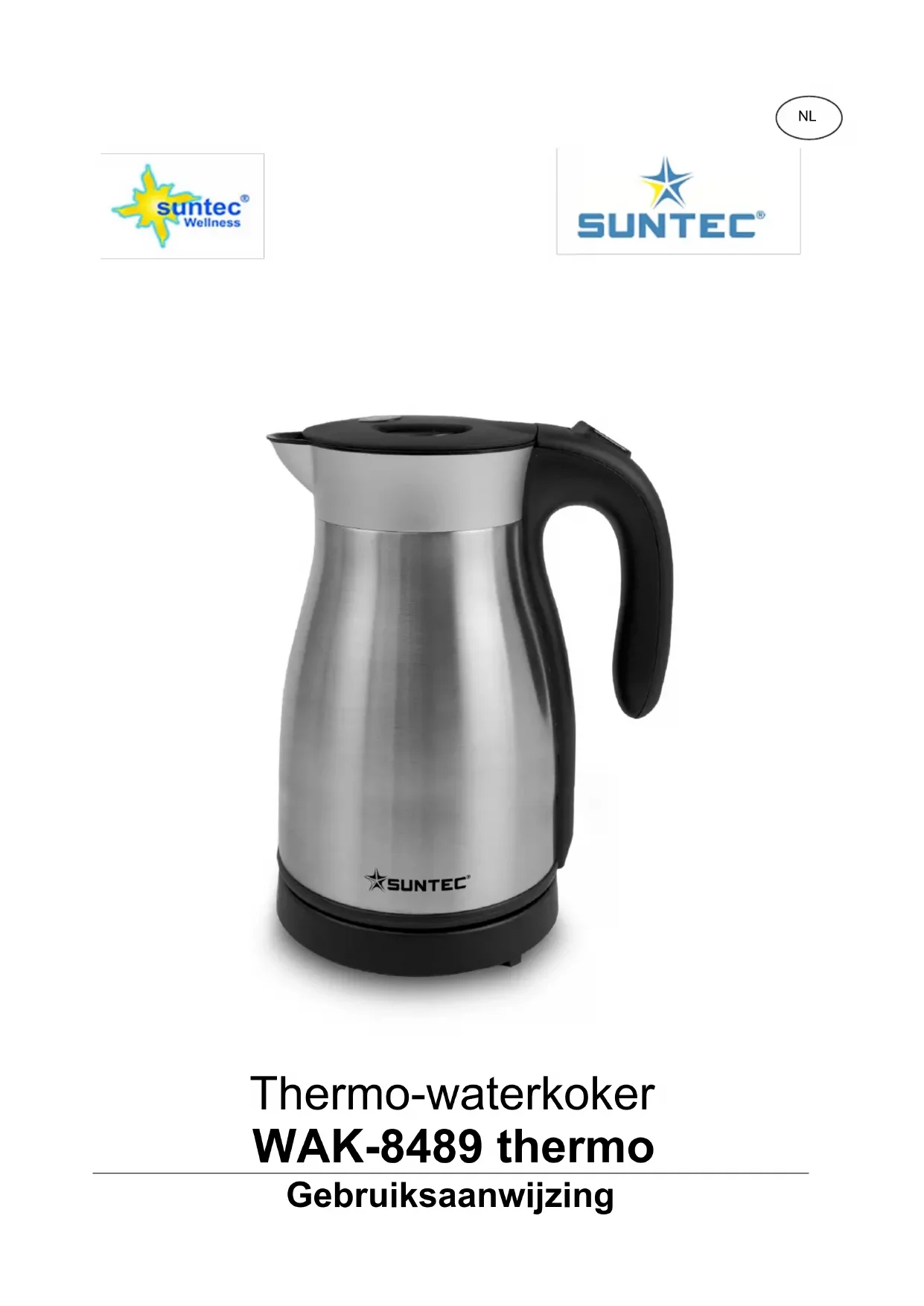 Thermo-waterkoker WAK-8489 thermo GebruiksaanwijzingBedankt voor uw aankoop van dit apparaat van Suntec Wellness. Voor gebruik, gelieve deze handleiding zorgvuldig te lezen. Bewaar dit voor latere raadpleging en geef door aan de nieuwe koper, indien u het toestel geeft aan iemand anders. Veiligheidsvoorzorgen Dit apparaat kan gebruikt worden door kinderen van 8 jaar en ouder en personen met verminderde lichamelijke, zintuiglijke en verstandelijke vermogens of gebrek aan ervaring en kennis als ze onder toezicht staan of worden geïnstrueerd over het gebruik van het apparaat op een veilige manier en begrijpen van de gevaren betrokken. Reiniging en onderhoud door de gebruiker worden niet gemaakt door kinderen zonder toezicht.