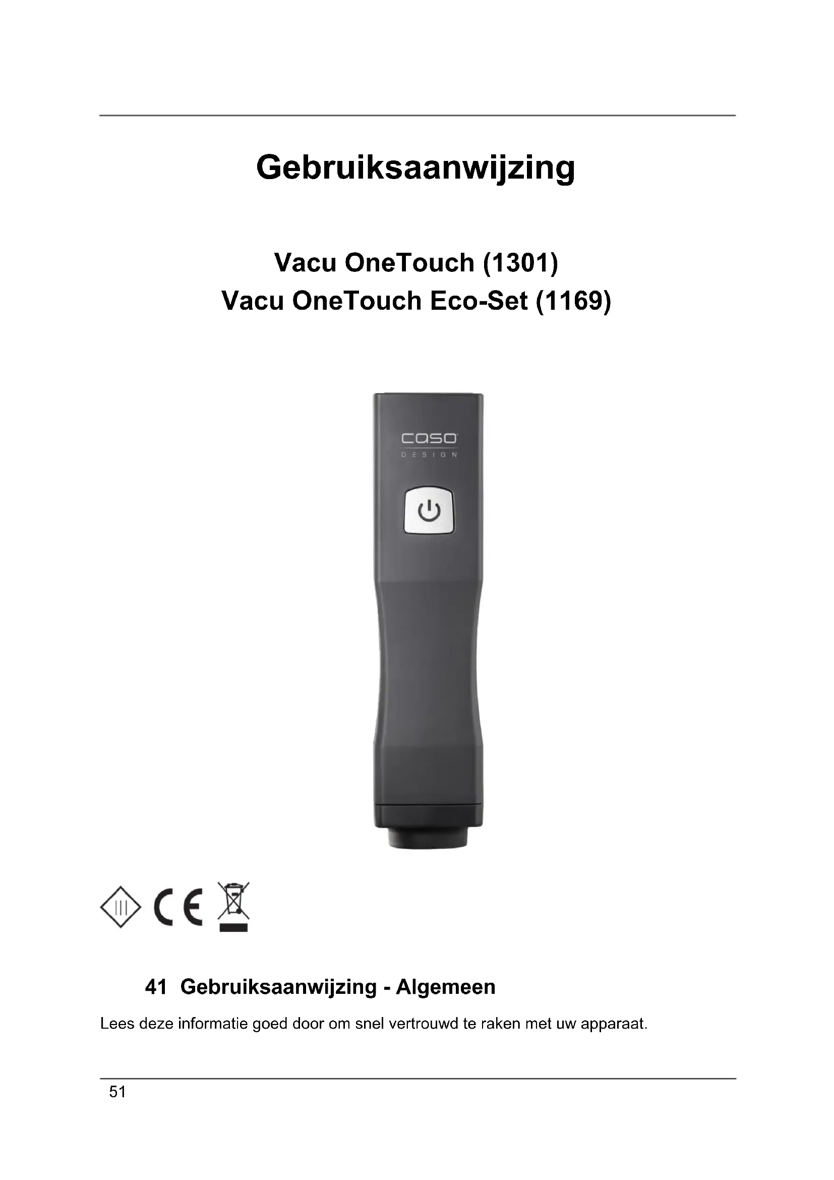 41 Gebruiksaanwijzing - Algemeen Lees deze informatie goed door om snel vertrouwd te raken met uw apparaat. Gebruiksaanwijzing Vacu OneTouch (1301) Vacu OneTouch Eco-Set (1169)52