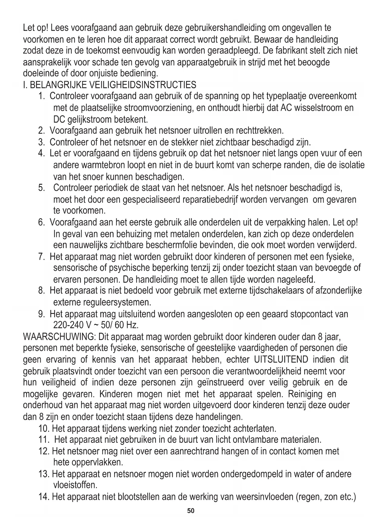 220-240 V ~ 50/ 60 Hz. WAARSCHUWING: Dit apparaat mag worden gebruikt door kinderen ouder dan 8 jaar, personen met beperkte fysieke, sensorische of geestelijke vaardigheden of personen die geen ervaring of kennis van het apparaat hebben, echter UITSLUITEND indien dit gebruik plaatsvindt onder toezicht van een persoon die verantwoordelijkheid neemt voor hun veiligheid of indien deze personen zijn geïnstrueerd over veilig gebruik en de mogelijke gevaren. Kinderen mogen niet met het apparaat spelen. Reiniging en onderhoud van het apparaat mag niet worden uitgevoerd door kinderen tenzij deze ouder dan 8 zijn en onder toezicht staan tijdens deze handelingen.51