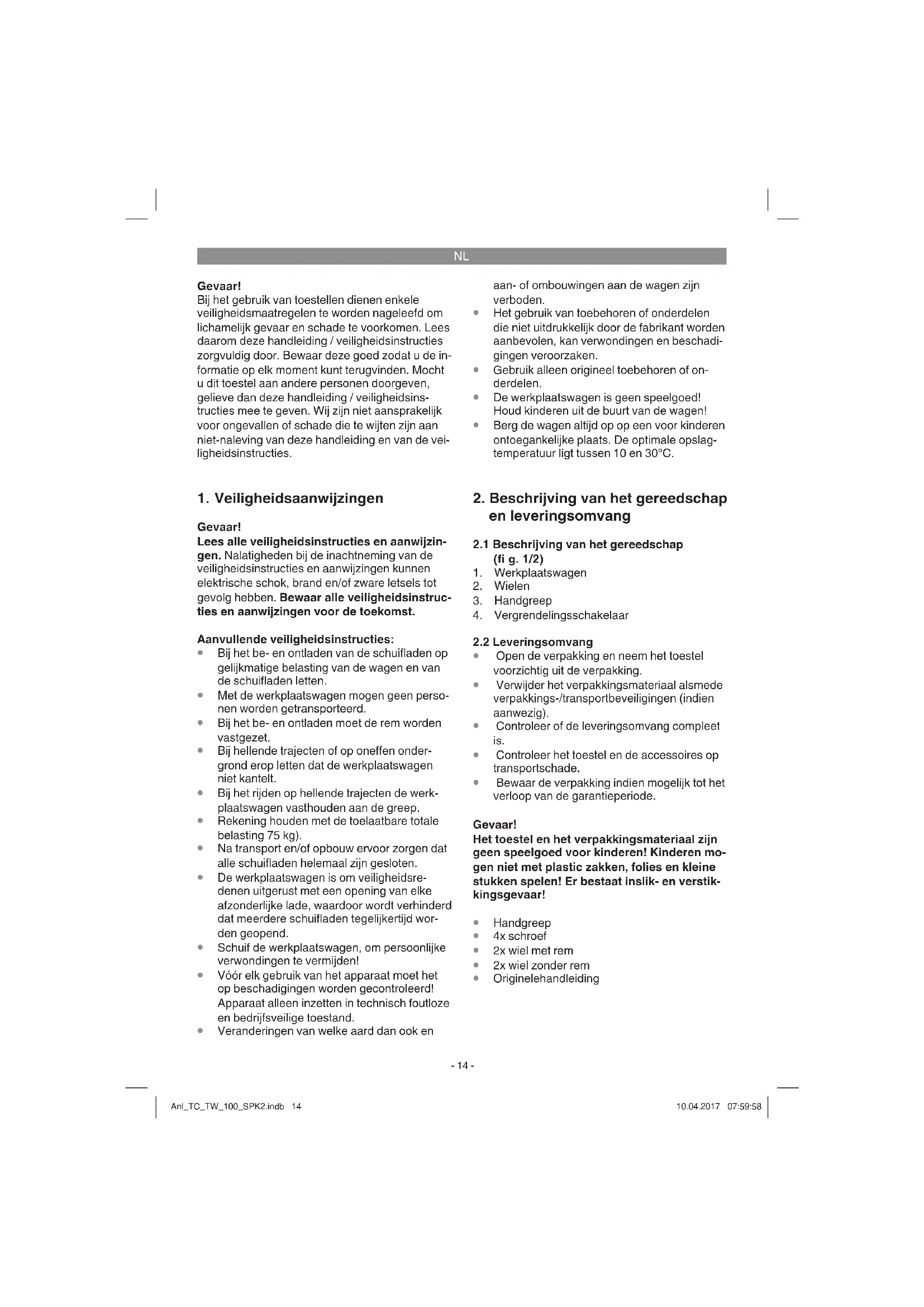 De werkplaatswagen dient voor het opbergen en transporteren van gereedschappen en kleine delen. De wagen kan op verschillende (vaste en vlakke) vloerbedekkingen binnen worden ingezet. De machine mag slechts voor werkzaamheden worden gebruikt waarvoor ze bedoeld is. Elk ander verder gaand gebruik is niet reglementair. Voor daaruit voortvloeiende schade of verwon- dingen van welke aard dan ook is de gebruiker/ bediener, niet de fabrikant, aansprakelijk. Wij wijzen erop dat onze gereedschappen overe- enkomstig hun bestemming niet geconstrueerd zijn voor commercieel, ambachtelijk of industrieel gebruik. Wij geven geen garantie indien het ge- reedschap in ambachtelijke of industriële bedrij- ven alsmede bij gelijk te stellen activiteiten wordt gebruikt.