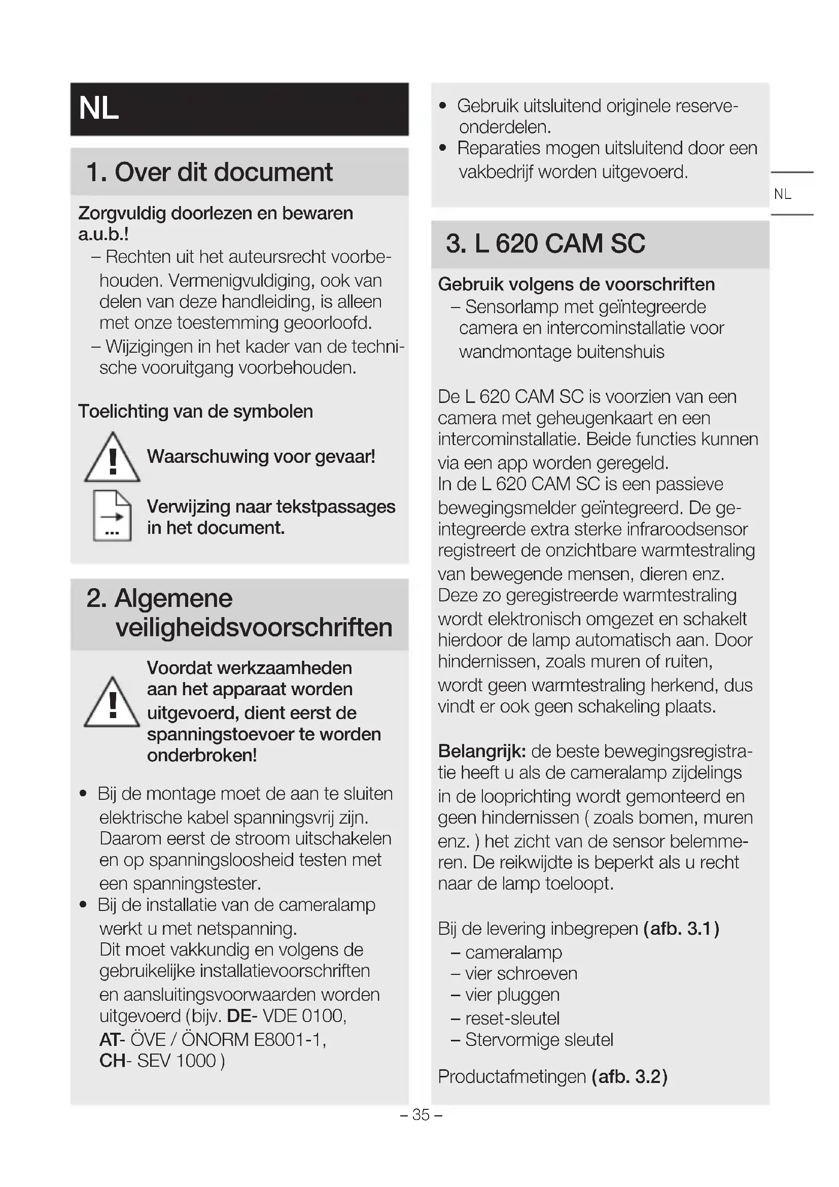 Gebruik volgens de voorschriften – Sensorlamp met geïntegreerde camera en intercominstallatie voor wandmontage buitenshuis De L620CAM SC is voorzien van een camera met geheugenkaart en een intercominstallatie. Beide functies kunnen via een app worden geregeld. In de L620CAM SC is een passieve bewegingsmelder geïntegreerd. De ge- integreerde extra sterke infraroodsensor registreert de onzichtbare warmtestraling van bewegende mensen, dieren enz. Deze zo geregistreerde warmtestraling wordt elektronisch omgezet en schakelt hierdoor de lamp automatisch aan. Door hindernissen, zoals muren of ruiten, wordt geen warmtestraling herkend, dus vindt er ook geen schakeling plaats. Belangrijk: de beste bewegingsregistra- tie heeft u als de cameralamp zijdelings in de looprichting wordt gemonteerd en geen hindernissen ( zoals bomen, muren enz. ) het zicht van de sensor belemme- ren. De reikwijdte is beperkt als u recht naar de lamp toeloopt. Bij de levering inbegrepen ( afb.3.1 ) – cameralamp – vier schroeven – vier pluggen – reset-sleutel – Stervormige sleutel Productafmetingen ( afb.3.2 )