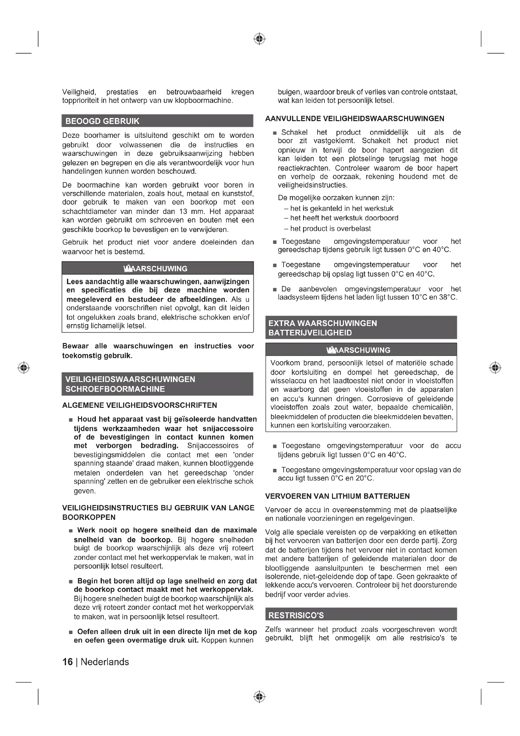 BOORKOPPEN ■ Werk nooit op hogere snelheid dan de maximale snelheid van de boorkop. Bij hogere snelheden buigt de boorkop waarschijnlijk als deze vrij roteert zonder contact met het werkoppervlak te maken, wat in persoonlijk letsel resulteert. ■ Begin het boren altijd op lage snelheid en zorg dat de boorkop contact maakt met het werkoppervlak. Bij hogere snelheden buigt de boorkop waarschijnlijk als deze vrij roteert zonder contact met het werkoppervlak te maken, wat in persoonlijk letsel resulteert. ■ Oefen alleen druk uit in een directe lijn met de kop en oefen geen overmatige druk uit. Koppen kunnen buigen, waardoor breuk of verlies van controle ontstaat, wat kan leiden tot persoonlijk letsel. AANVULLENDE VEILIGHEIDSWAARSCHUWINGEN ■ Schakel het product onmiddellijk uit als de boor zit vastgeklemt. Schakelt het product niet opnieuw in terwijl de boor hapert aangezien dit kan leiden tot een plotselinge terugslag met hoge reactiekrachten. Controleer waarom de boor hapert en verhelp de oorzaak, rekening houdend met de veiligheidsinstructies. De mogelijke oorzaken kunnen zijn: – het is gekanteld in het werkstuk – het heeft het werkstuk doorboord – het product is overbelast ■ Toegestane omgevingstemperatuur voor het gereedschap tijdens gebruik ligt tussen 0°C en 40°C. ■ Toegestane omgevingstemperatuur voor het gereedschap bij opslag ligt tussen 0°C en 40°C. ■ De aanbevolen omgevingstemperatuur voor het laadsysteem tijdens het laden ligt tussen 10°C en 38°C. EXTRA WAARSCHUWINGEN BATTERIJVEILIGHEID WAARSCHUWING Voorkom brand, persoonlijk letsel of materiële schade door kortsluiting en dompel het gereedschap, de wisselaccu en het laadtoestel niet onder in vloeistoffen en waarborg dat geen vloeistoffen in de apparaten en accu‘s kunnen dringen. Corrosieve of geleidende vloeistoffen zoals zout water, bepaalde chemicaliën, bleekmiddelen of producten die bleekmiddelen bevatten, kunnen een kortsluiting veroorzaken. ■ Toegestane omgevingstemperatuur voor de accu tijdens gebruik ligt tussen 0°C en 40°C. ■ Toegestane omgevingstemperatuur voor opslag van de accu ligt tussen 0°C en 20°C.