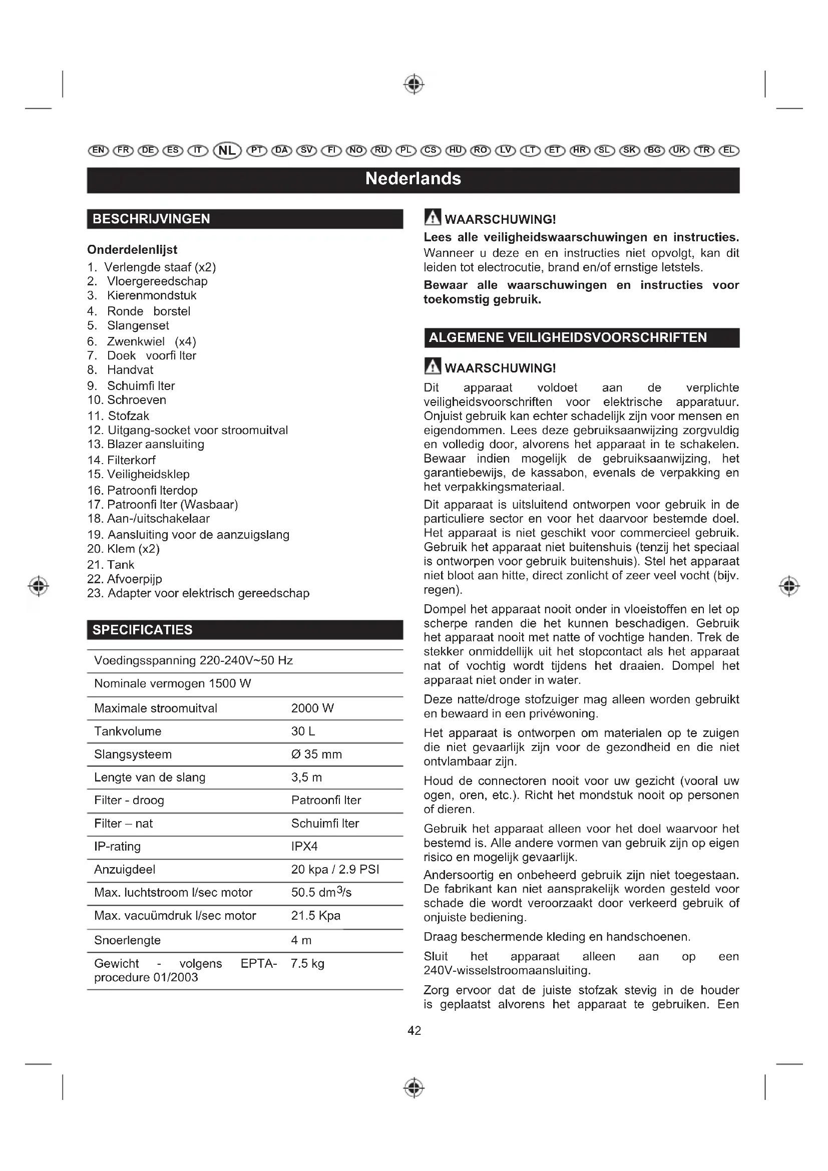 EN FR DE ES IT PT DA SV FI NO RU PL CS HU RO LV LT ET HR SL SK UKBG TR EL WAARSCHUWING! Lees alle veiligheidswaarschuwingen en instructies. Wanneer u deze en en instructies niet opvolgt, kan dit leiden tot electrocutie, brand en/of ernstige letstels. Bewaar alle waarschuwingen en instructies voor toekomstig gebruik. ALGEMENE VEILIGHEIDSVOORSCHRIFTEN WAARSCHUWING! Dit apparaat voldoet aan de verplichte veiligheidsvoorschriften voor elektrische apparatuur. Onjuist gebruik kan echter schadelijk zijn voor mensen en eigendommen. Lees deze gebruiksaanwijzing zorgvuldig en volledig door, alvorens het apparaat in te schakelen. Bewaar indien mogelijk de gebruiksaanwijzing, het garantiebewijs, de kassabon, evenals de verpakking en het verpakkingsmateriaal. Dit apparaat is uitsluitend ontworpen voor gebruik in de particuliere sector en voor het daarvoor bestemde doel. Het apparaat is niet geschikt voor commercieel gebruik. Gebruik het apparaat niet buitenshuis (tenzij het speciaal is ontworpen voor gebruik buitenshuis). Stel het apparaat niet bloot aan hitte, direct zonlicht of zeer veel vocht (bijv. regen). Dompel het apparaat nooit onder in vloeistoffen en let op scherpe randen die het kunnen beschadigen. Gebruik het apparaat nooit met natte of vochtige handen. Trek de stekker onmiddellijk uit het stopcontact als het apparaat nat of vochtig wordt tijdens het draaien. Dompel het apparaat niet onder in water. Deze natte/droge stofzuiger mag alleen worden gebruikt en bewaard in een privéwoning. Het apparaat is ontworpen om materialen op te zuigen die niet gevaarlijk zijn voor de gezondheid en die niet ontvlambaar zijn. Houd de connectoren nooit voor uw gezicht (vooral uw ogen, oren, etc.). Richt het mondstuk nooit op personen of dieren. Gebruik het apparaat alleen voor het doel waarvoor het bestemd is. Alle andere vormen van gebruik zijn op eigen risico en mogelijk gevaarlijk. Andersoortig en onbeheerd gebruik zijn niet toegestaan. De fabrikant kan niet aansprakelijk worden gesteld voor schade die wordt veroorzaakt door verkeerd gebruik of onjuiste bediening. Draag beschermende kleding en handschoenen. Sluit het apparaat alleen aan op een 240V-wisselstroomaansluiting. Zorg ervoor dat de juiste stofzak stevig in de houder is geplaatst alvorens het apparaat te gebruiken. Een BESCHRIJVINGEN Onderdelenlijst
