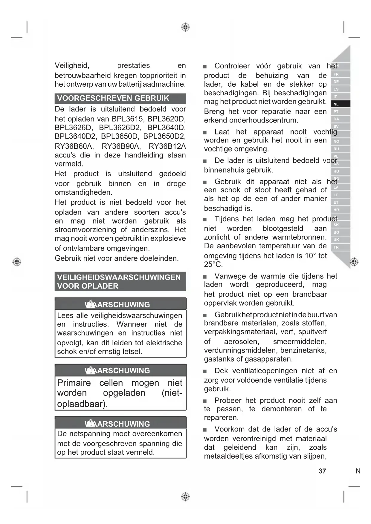 Veiligheid, prestaties en betrouwbaarheid kregen topprioriteit in het ontwerp van uw batterijlaadmachine. VOORGESCHREVEN GEBRUIK De lader is uitsluitend bedoeld voor het opladen van BPL3615, BPL3620D, BPL3626D, BPL3626D2, BPL3640D, BPL3640D2, BPL3650D, BPL3650D2, RY36B60A, RY36B90A, RY36B12A accu's die in deze handleiding staan vermeld. Het product is uitsluitend gedoeld voor gebruik binnen en in droge omstandigheden. Het product is niet bedoeld voor het opladen van andere soorten accu's en mag niet worden gebruik als stroomvoorziening of anderszins. Het mag nooit worden gebruikt in explosieve of ontvlambare omgevingen. Gebruik niet voor andere doeleinden. VEILIGHEIDSWAARSCHUWINGEN VOOR OPLADER WAARSCHUWING Lees alle veiligheidswaarschuwingen en instructies. Wanneer niet de waarschuwingen en instructies niet opvolgt, kan dit leiden tot elektrische schok en/of ernstig letsel. WAARSCHUWING Primaire cellen mogen niet worden opgeladen (niet- oplaadbaar). WAARSCHUWING De netspanning moet overeenkomen met de voorgeschreven spanning die op het product staat vermeld. ■ Controleer vóór gebruik van het product de behuizing van de lader, de kabel en de stekker op beschadigingen. Bij beschadigingen mag het product niet worden gebruikt. Breng het voor reparatie naar een erkend onderhoudscentrum. ■ Laat het apparaat nooit vochtig worden en gebruik het nooit in een vochtige omgeving. ■ De lader is uitsluitend bedoeld voor binnenshuis gebruik. ■ Gebruik dit apparaat niet als het een schok of stoot heeft gehad of als het op de een of ander manier beschadigd is. ■ Tijdens het laden mag het product niet worden blootgesteld aan zonlicht of andere warmtebronnen. De aanbevolen temperatuur van de omgeving tijdens het laden is 10° tot 25°C. ■ Vanwege de warmte die tijdens het laden wordt geproduceerd, mag het product niet op een brandbaar oppervlak worden gebruikt. ■ Gebruik het product niet in de buurt van brandbare materialen, zoals stoffen, verpakkingsmateriaal, verf, spuitverf of aerosolen, smeermiddelen, verdunningsmiddelen, benzinetanks, gastanks of gasapparaten. ■ Dek ventilatieopeningen niet af en zorg voor voldoende ventilatie tijdens gebruik. ■ Probeer het product nooit zelf aan te passen, te demonteren of te repareren. ■ Voorkom dat de lader of de accu's worden verontreinigd met materiaal dat geleidend kan zijn, zoals metaaldeeltjes afkomstig van slijpen,38 | Nederlands snijden of machinale bewerking. ■ Haal de stekker van het product uit het stopcontact als het product niet in gebruik is of wordt gereinigd. ■ Gebruik uitsluitend verlengkabels die zijn goedgekeurd en in goede staat verkeren. ■ Laad geen accu's op die tekenen van lekkage vertonen. Voer deze op de juiste wijze af. ■ Een beschadigde accu mag nooit worden opgeladen. Vervang beschadigde batterijpakken onmiddellijk. ■ Voor elk gebruik controleert u het stroomsnoer op schade. Als er tekenen van schade zijn, moet het door een gekwalificeerde deskundige in een geautoriseerd onderhoudscentrum worden vervangen om mogelijke gevaren te vermijden. EXTRA WAARSCHUWINGEN BATTERIJVEILIGHEID WAARSCHUWING Voorkom brand, persoonlijk letsel of materiële schade door kortsluiting en dompel het gereedschap, de wisselaccu en het laadtoestel niet onder in vloeistoffen en waarborg dat geen vloeistoffen in de apparaten en accu‘s kunnen dringen. Corrosieve of geleidende vloeistoffen zoals zout water, bepaalde chemicaliën, bleekmiddelen of producten die bleekmiddelen bevatten, kunnen een kortsluiting veroorzaken. MILIEUBESCHERMING Zorg dat grondstoffen gerecycleerd worden. Zet daarom een afgedankte elektrische machine niet bij het huishoudafval. Om het milieu te beschermen moeten de machine, de accessoires en de verpakking gesorteerd bij een erkend recyclingcentrum worden aangeleverd. BEDIENING