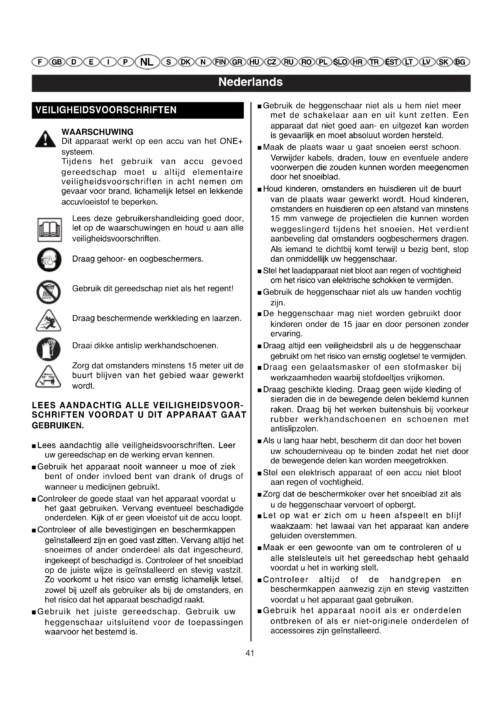 F GB D E I P S DK N FIN GR HU CZ RU RO PL SLO HR TR EST LT LV SK BG BEDIENING GEVAAR Als de tanden in aanraking komen met een elektriciteitsdraad of snoer, RAAK HET SNOEIBLAD DAN NIET AAN! HET KAN ONDER