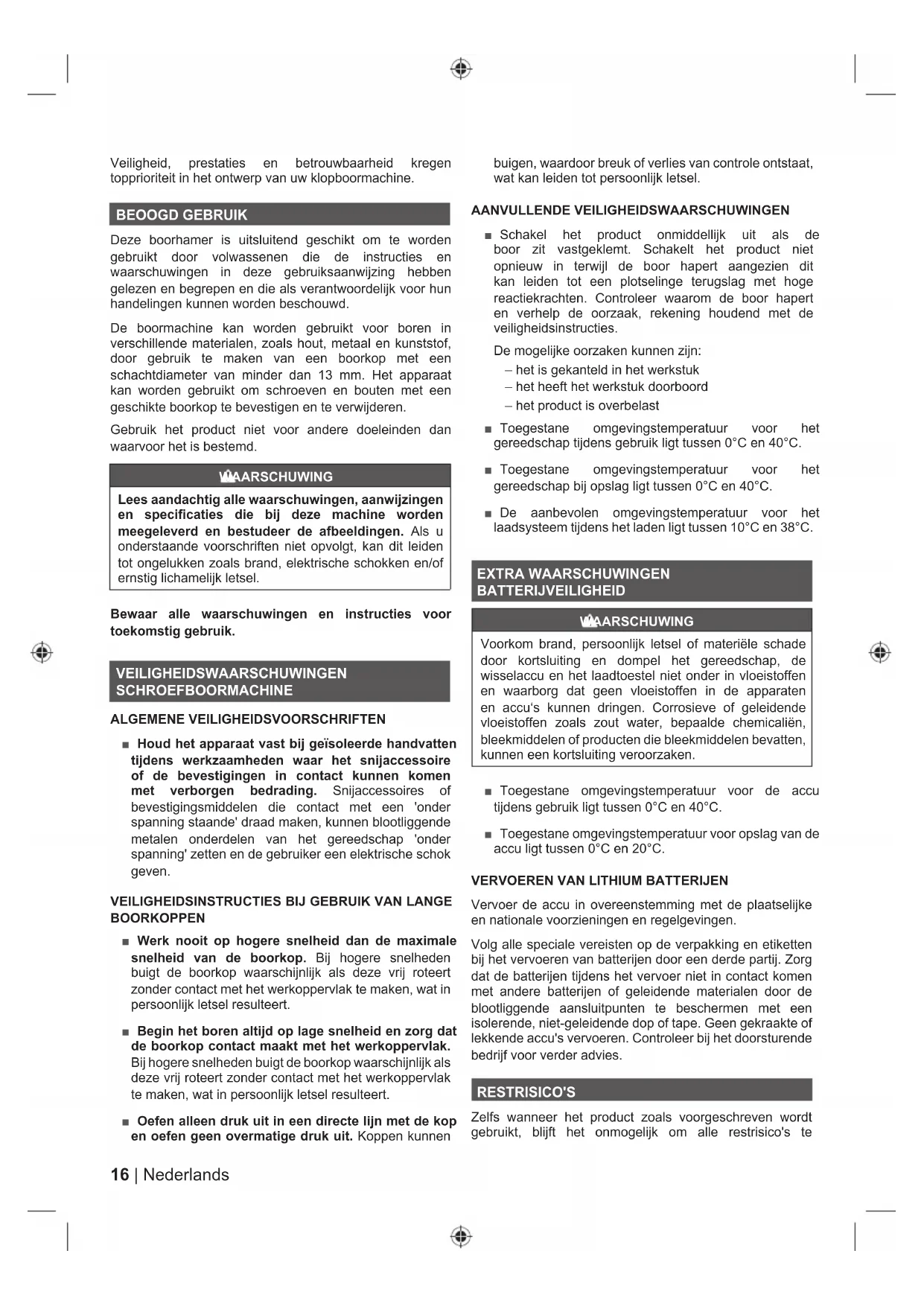 Vervoer de accu in overeenstemming met de plaatselijke en nationale voorzieningen en regelgevingen. Volg alle speciale vereisten op de verpakking en etiketten bij het vervoeren van batterijen door een derde partij. Zorg dat de batterijen tijdens het vervoer niet in contact komen met andere batterijen of geleidende materialen door de blootliggende aansluitpunten te beschermen met een isolerende, niet-geleidende dop of tape. Geen gekraakte of lekkende accu's vervoeren. Controleer bij het doorsturende bedrijf voor verder advies. RESTRISICO'S Zelfs wanneer het product zoals voorgeschreven wordt gebruikt, blijft het onmogelijk om alle restrisico's te17 Nederlands |