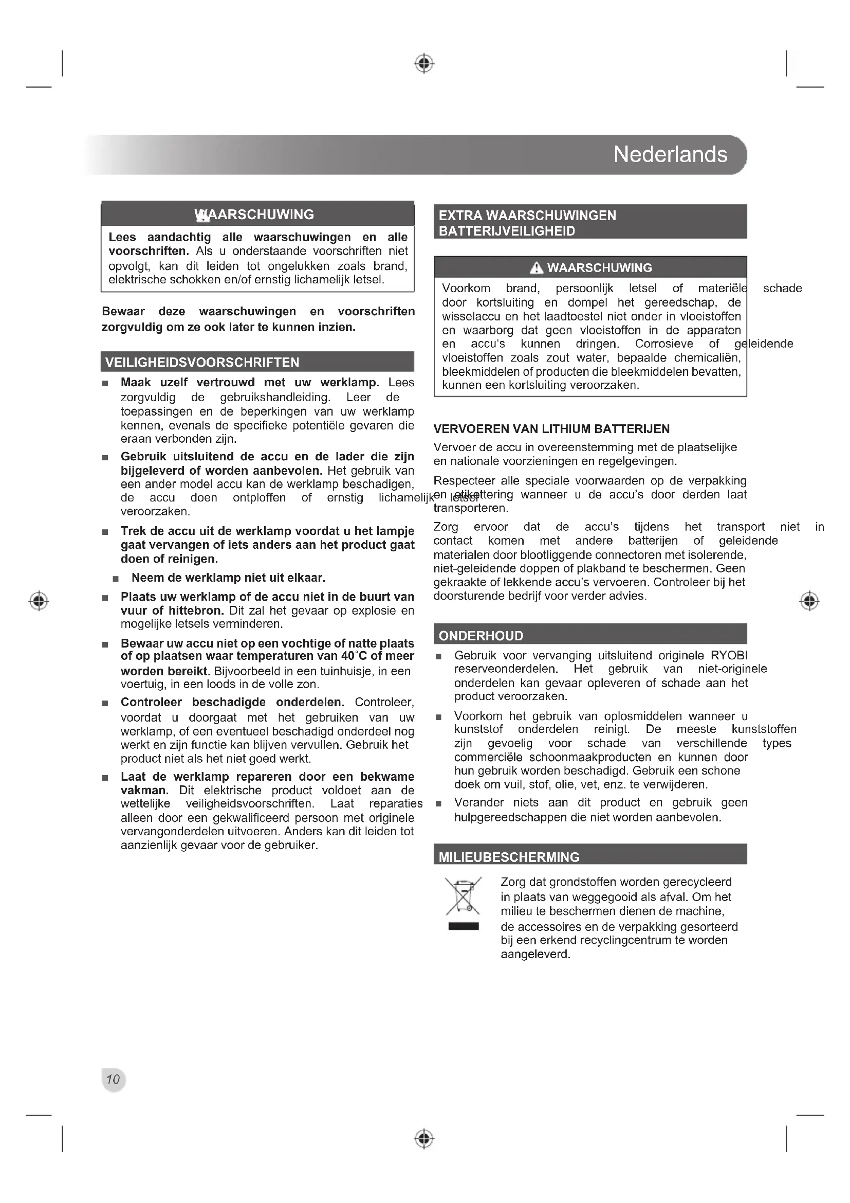 toepassingen en de beperkingen van uw werklamp kennen, evenals de specifieke potentiële gevaren die HUDDQYHUERQGHQ]LMQ Ŷ Gebruik uitsluitend de accu en de lader die zijn bijgeleverd of worden aanbevolen. Het gebruik van een ander model accu kan de werklamp beschadigen, GH DFFX GRHQ RQWSORIIHQ RI HUQVWLJ OLFKDPHOLMN OHWVHO YHURRU]DNHQ Ŷ Trek de accu uit de werklamp voordat u het lampje gaat vervangen of iets anders aan het product gaat doen of reinigen. Ŷ Neem de werklamp niet uit elkaar. Ŷ Plaats uw werklamp of de accu niet in de buurt van vuur of hittebron. Dit zal het gevaar op explosie en PRJHOLMNHOHWVHOVYHUPLQGHUHQ Ŷ Bewaar uw accu niet op een vochtige of natte plaats of op plaatsen waar temperaturen van 40ÛC of meer worden bereikt.%LMYRRUEHHOGLQHHQWXLQKXLVMHLQHHQ YRHUWXLJLQHHQORRGVLQGHYROOH]RQ Ŷ Controleer beschadigde onderdelen. Controleer, voordat u doorgaat met het gebruiken van uw werklamp, of een eventueel beschadigd onderdeel nog