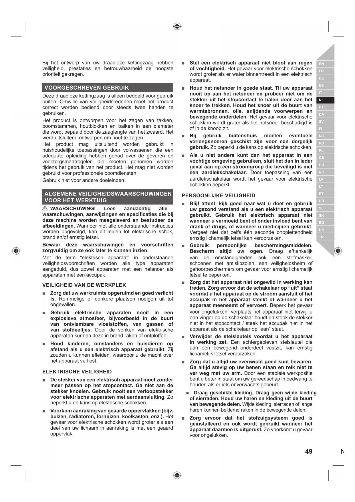 TR■ Zaag niet terwijl uw lichaam zich in lijn met het zwaard en de ketting bevindt. Als u terugslag ondervindt, helpt dit te voorkomen dat de ketting in contact komt met uw hoofd of lichaam. ■ Gebruik geen heen-en-weer-gaande zaagbeweging. Laat de ketting het werk doen. Houd de ketting scherp en duw deze niet door de uitsnede. ■ Oefen geen druk uit op de zaag aan het einde van de zaagsnede. Wees klaar op het gewicht van de kettingzaag op te vangen als deze zich vrij van het hout zaagt. Wanneer u dit niet doet kan dit leiden tot ernstige letsels. ■ Stop het zagen niet in het midden van een zaagbeweging. Laat de zaag draaien tot ze uit de zaagsnede is verwijderd. ■ Schakel altijd de motor uit, gebruik de kettingrem, verwijder de accu en zorg ervoor dat alle bewegende delen volledig tot stilstand zijn gekomen, om het risico op verwonding door contact met bewegende onderdelen te verlagen. ● voor u een blokkering reinigt of weghaalt ● voordat u het product onbewaakt achterlaat ● voor u voorzetstukken installeert of verwijdert ● voor het controleren, onderhouden of werken aan het product. ■ Letsels kunnen worden veroorzaakt of ernstiger worden door verlengd gebruik van een werktuig. Als u een werktuig gedurende langere periodes gebruikt, neem dan regelmatig pauze. ■ Als u het product laat vallen, het een ernstige impact ondergaat of abnormaal begint te trillen, legt u het product onmiddellijk stil en controleert u het op schade of zoekt u naar de oorzaak van de trillingen. Enige schade moet direct worden gerepareerd of vervangen door een bevoegd onderhoudscentrum. ■ Bedien het product alleen bij temperaturen tussen 0 °C en 40 °C. ■ Bewaar het product op een locatie met een omgevingstemperatuur tussen -10 °C en 50 °C. PERSOONLIJKE BESCHERMUITRUSTING Persoonlijke beschermingsmiddelen van goede kwaliteit, zoals worden gebruikt door professionals, helpen het risico op letsel voor de gebruiker te verminderen. De volgende items moeten worden gebruikt wanneer u de kettingzaag bedient: ■ Veiligheidshelm – moet overeenstemmen met EN 397 en CE- gemarkeerd zijn. ■ Gehoorbescherming – moet overeenstemmen met EN 352-1 en CE- gemarkeerd zijn. ■ Oog- en gezichtsbescherming – moet CE-gemarkeerd zijn en overeenstemmen met EN 166 (voor veiligheidsbril) of EN 1731 (voor gezichtsmaskers in gaas) ■ Handschoenen – moet overeenstemmen met EN381-7 en CE- gemarkeerd zijn. ■ Beenbeschermers (chaps) – moeten overeenstemmen met EN391-5 en CE- gemarkeerd zijn en een algemene bescherming bieden. ■ Veiligheidslaarzen kettingzaag – moeten overeenstemmen met EN ISO 20345:2004 en gemarkeerd zijn met een schild dat een kettingzaag afbeeldt om de overeenstemming met EN 381-3 aan te duiden. (Occasionele gebruikers kunnen veiligheidslaarzen met stalen punt met beschermende beenkappen gebruiken die overeenstemmen met EN 381-9 als de bodem vlak is er een maar weinig risico bestaat om te struikelen of in de ondergroei verstrikt te raken) ■ Kettingzaagjassen voor bescherming van het bovenlichaam – moet overeenstemmen met EN 381-11 en CE- gemarkeerd zijn. EXTRA WAARSCHUWINGEN BATTERIJVEILIGHEID ■ Voorkom brand, persoonlijk letsel of materiële schade door kortsluiting en dompel het gereedschap, de wisselaccu en het laadtoestel niet onder in vloeistoffen en waarborg dat geen vloeistoffen in de apparaten en accu‘s kunnen dringen. Corrosieve of geleidende vloeistoffen zoals zout water, bepaalde chemicaliën, bleekmiddelen of producten die bleekmiddelen bevatten, kunnen een kortsluiting veroorzaken. ■ Laad de accu op op een locatie met een omgevingstemperatuur van 10 °C tot 38 °C. ■ Bewaar de accu op een locatie met een omgevingstemperatuur van 0 °C tot 20 °C.