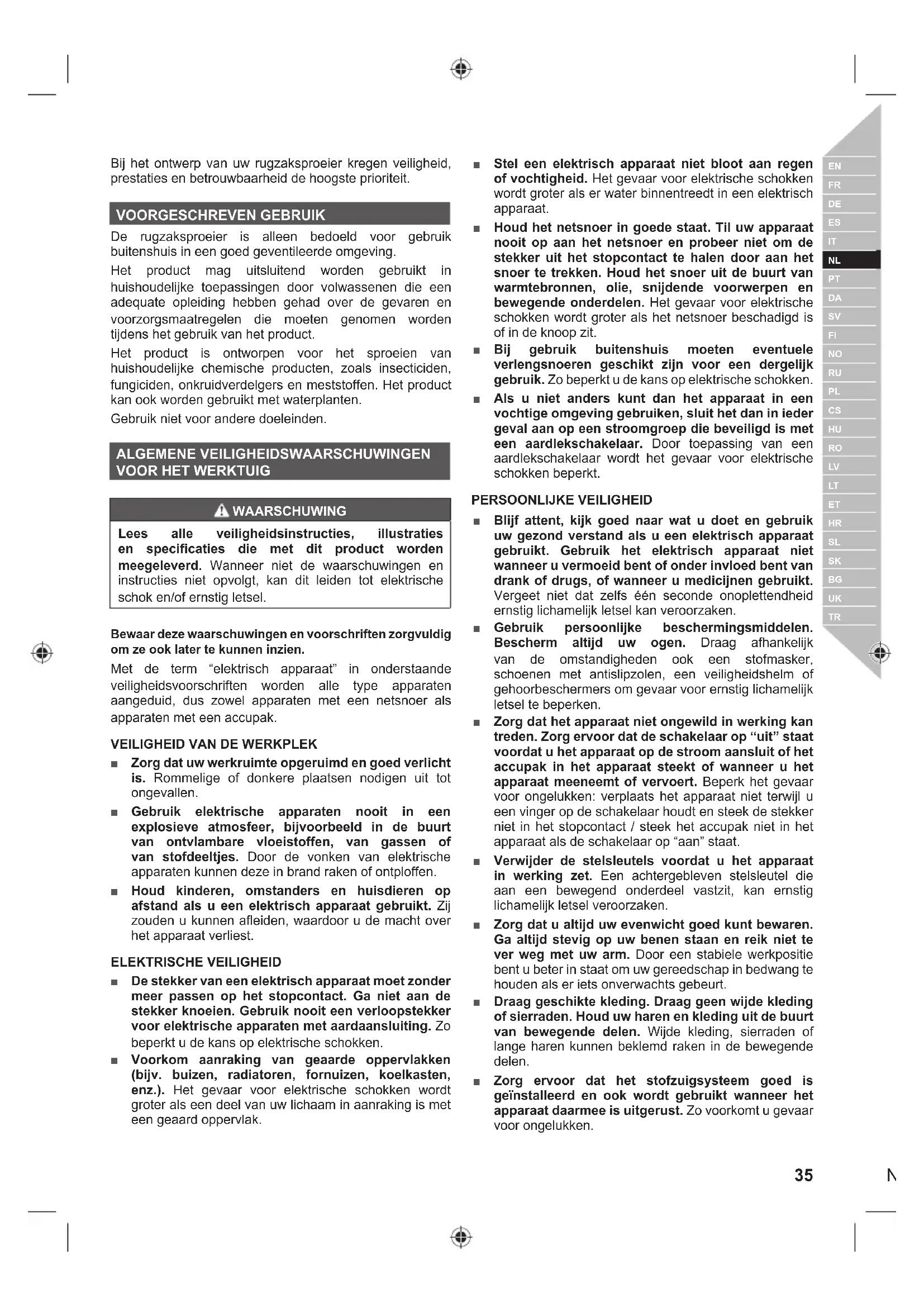 Il coperchio della batteria protegge la batteria dall'esposizione ai liquidi. SCARICO ALLOGGIAMENTO Lo scarico alloggiamento evita i cortociruiti che potrebbero derivare da perdite d'acqua. 34 | ItalianoBij het ontwerp van uw rugzaksproeier kregen veiligheid, prestaties en betrouwbaarheid de hoogste prioriteit. VOORGESCHREVEN GEBRUIK De rugzaksproeier is alleen bedoeld voor gebruik buitenshuis in een goed geventileerde omgeving. Het product mag uitsluitend worden gebruikt in huishoudelijke toepassingen door volwassenen die een adequate opleiding hebben gehad over de gevaren en voorzorgsmaatregelen die moeten genomen worden tijdens het gebruik van het product. Het product is ontworpen voor het sproeien van huishoudelijke chemische producten, zoals insecticiden, fungiciden, onkruidverdelgers en meststoffen. Het product kan ook worden gebruikt met waterplanten. Gebruik niet voor andere doeleinden. ALGEMENE VEILIGHEIDSWAARSCHUWINGEN