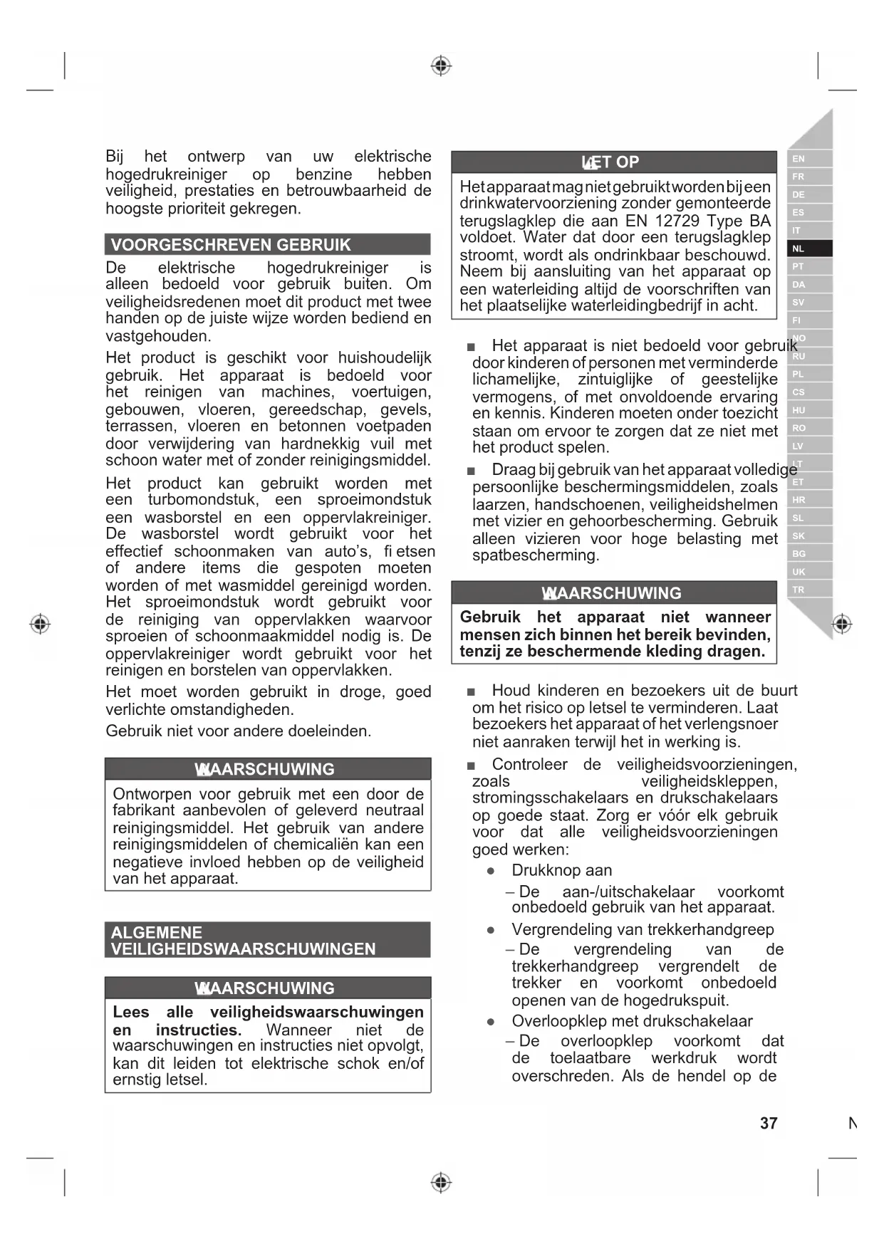 Bij het ontwerp van uw elektrische hogedrukreiniger op benzine hebben veiligheid, prestaties en betrouwbaarheid de hoogste prioriteit gekregen. VOORGESCHREVEN GEBRUIK De elektrische hogedrukreiniger is alleen bedoeld voor gebruik buiten. Om veiligheidsredenen moet dit product met twee handen op de juiste wijze worden bediend en vastgehouden. Het product is geschikt voor huishoudelijk gebruik. Het apparaat is bedoeld voor het reinigen van machines, voertuigen, gebouwen, vloeren, gereedschap, gevels, terrassen, vloeren en betonnen voetpaden door verwijdering van hardnekkig vuil met schoon water met of zonder reinigingsmiddel. Het product kan gebruikt worden met een turbomondstuk, een sproeimondstuk een wasborstel en een oppervlakreiniger. De wasborstel wordt gebruikt voor het effectief schoonmaken van auto’s, fi etsen of andere items die gespoten moeten worden of met wasmiddel gereinigd worden. Het sproeimondstuk wordt gebruikt voor de reiniging van oppervlakken waarvoor sproeien of schoonmaakmiddel nodig is. De oppervlakreiniger wordt gebruikt voor het reinigen en borstelen van oppervlakken. Het moet worden gebruikt in droge, goed verlichte omstandigheden. Gebruik niet voor andere doeleinden. WAARSCHUWING Ontworpen voor gebruik met een door de fabrikant aanbevolen of geleverd neutraal reinigingsmiddel. Het gebruik van andere reinigingsmiddelen of chemicaliën kan een negatieve invloed hebben op de veiligheid van het apparaat. ALGEMENE VEILIGHEIDSWAARSCHUWINGEN WAARSCHUWING Lees alle veiligheidswaarschuwingen en instructies. Wanneer niet de waarschuwingen en instructies niet opvolgt, kan dit leiden tot elektrische schok en/of ernstig letsel. LET OP Het apparaat mag niet gebruikt worden bij een drinkwatervoorziening zonder gemonteerde terugslagklep die aan EN 12729 Type BA voldoet. Water dat door een terugslagklep stroomt, wordt als ondrinkbaar beschouwd. Neem bij aansluiting van het apparaat op een waterleiding altijd de voorschriften van het plaatselijke waterleidingbedrijf in acht. ■ Het apparaat is niet bedoeld voor gebruik door kinderen of personen met verminderde lichamelijke, zintuiglijke of geestelijke vermogens, of met onvoldoende ervaring en kennis. Kinderen moeten onder toezicht staan om ervoor te zorgen dat ze niet met het product spelen. ■ Draag bij gebruik van het apparaat volledige persoonlijke beschermingsmiddelen, zoals laarzen, handschoenen, veiligheidshelmen met vizier en gehoorbescherming. Gebruik alleen vizieren voor hoge belasting met spatbescherming. WAARSCHUWING Gebruik het apparaat niet wanneer mensen zich binnen het bereik bevinden, tenzij ze beschermende kleding dragen. ■ Houd kinderen en bezoekers uit de buurt om het risico op letsel te verminderen. Laat bezoekers het apparaat of het verlengsnoer niet aanraken terwijl het in werking is. ■ Controleer de veiligheidsvoorzieningen, zoals veiligheidskleppen, stromingsschakelaars en drukschakelaars op goede staat. Zorg er vóór elk gebruik voor dat alle veiligheidsvoorzieningen goed werken: ● Drukknop aan – De aan-/uitschakelaar voorkomt onbedoeld gebruik van het apparaat. ● Vergrendeling van trekkerhandgreep – De vergrendeling van de trekkerhandgreep vergrendelt de trekker en voorkomt onbedoeld openen van de hogedrukspuit. ● Overloopklep met drukschakelaar – De overloopklep voorkomt dat de toelaatbare werkdruk wordt overschreden. Als de hendel op de38 | Nederlands trekkerhandgreep wordt losgelaten, schakelt de drukschakelaar de pomp uit en stopt de hogedrukstraal. Als de hendel wordt overgehaald, wordt de pomp weer ingeschakeld. ● Bescherming tegen overbelasting – Een thermische sensor beschermt het product tegen overbelasting. Tijdens oververhitting wordt het product automatisch uitgeschakeld. ■ Gebruik het apparaat niet als belangrijke onderdelen beschadigd zijn, zoals de veiligheidsvoorzieningen, hogedrukslangen of de trekker. ■ Wees voorzichtig bij het openen van de trekker. Houd de handgreep stevig met beide handen vast om letsel te voorkomen bij terugklappen van de trekker. WAARSCHUWING Bij gebruik van een hogedrukreiniger kunnen aerosolen worden gevormd. Inademing van aerosolen kan gevaarlijk zijn voor de gezondheid. WAARSCHUWING Afhankelijk van het gebruik kunnen voor hogedrukreiniging afgeschermde spuitstukken worden gebruikt om de uitstoot van waterhoudende aerosolen te verminderen. Dergelijke stukken kunnen echter niet bij elk gebruik worden ingezet. Indien voor bescherming tegen aerosolen geen afgeschermde spuitstukken kunnen worden gebruikt, kan afhankelijk van de soort reiniging een beademingsmasker uit klasse FFP 2 of gelijkwaardig nodig zijn. ■ Stop het apparaat altijd wanneer u het onbeheerd achterlaat. ■ Bij onjuist gebruik is een hogedrukstraal gevaarlijk. Richt de straal niet op mensen, ingeschakelde elektrische apparaten, of op het apparaat zelf. ■ Om explosiegevaar te vermijden, niet met brandbare vloeistoffen spuiten. ■ Richt de straal niet rechtstreeks op uzelf of anderen om kleding of schoenen te reinigen. ■ Gebruik het apparaat niet voor het reinigen van elektronische apparaten, kleding of schoeisel. ■ Hogedrukslangen, fittingen en koppelingen zijn belangrijk voor de veiligheid van het apparaat. Gebruik alleen door de fabrikant aanbevolen slangen, fittingen en koppelingen. VEILIGHEIDSWAARSCHUWINGEN VOOR ELEKTRICITEIT ■ De stekker moet overeenkomen met de contactdoos Wijzig de stekker nooit. Niet- gewijzigde stekkers en overeenkomstige contactdozen zullen het risico op elektrische schok verminderen. ■ Gebruik het apparaat niet als het netsnoer of andere belangrijke onderdelen, zoals de veiligheidsvoorzieningen, beschadigd zijn. ■ Controleer voorafgaand aan elke gebruik het netsnoer en het verlengsnoer op schade. Als het netsnoer of verlengsnoer beschadigd is, moet dit om gevaar te voorkomen worden vervangen door de fabrikant of diens technische dienst, of personen met vergelijkbare kwalificaties. ■ Houd het stroomsnoer weg van hitte, olie en s