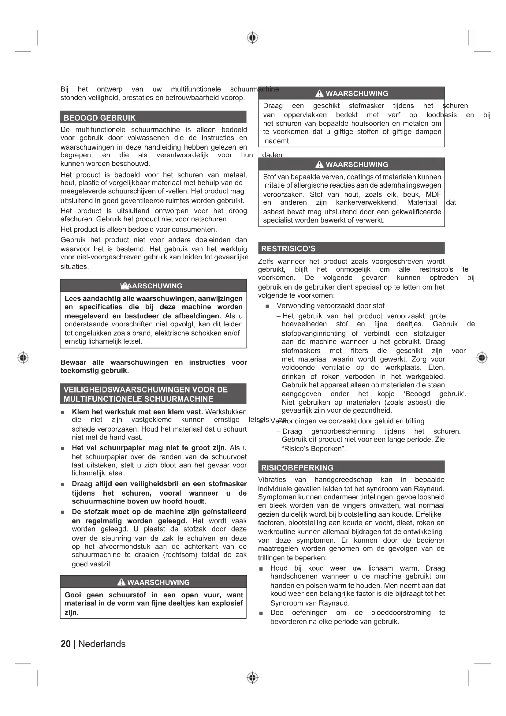ATTENZIONE Indica una situazione potenzialmente pericolosa che, se non evitata, potrà causare lesioni minori o moderate. ATTENZIONE (Senza simbolo di allarme in materia di sicurezza) Indica una situazione che può provocare danni materiali.20 | Nederlands %LM KHW RQWZHUS YDQ XZ PXOWLIXQFWLRQHOH VFKXXUPDFKLQH stonden veiligheid, prestaties en betrouwbaarheid voorop. BEOOGD GEBRUIK De multifunctionele schuurmachine is alleen bedoeld voor gebruik door volwassenen die de instructies en waarschuwingen in deze handleiding hebben gelezen en EHJUHSHQ HQ GLH DOV YHUDQWZRRUGHOLMN YRRU KXQ GDGHQ kunnen worden beschouwd. Het product is bedoeld voor het schuren van metaal, KRXWSODVWLFRIYHUJHOLMNEDDUPDWHULDDOPHWEHKXOSYDQGH PHHJHOHYHUGHVFKXXUVFKLMYHQRIYHOOHQ+HWSURGXFWPDJ uitsluitend in goed geventileerde ruimtes worden gebruikt. Het product is uitsluitend ontworpen voor het droog afschuren. Gebruik het product niet voor natschuren. Het product is alleen bedoeld voor consumenten. Gebruik het product niet voor andere doeleinden dan waarvoor het is bestemd. Het gebruik van het werktuig YRRUQLHWYRRUJHVFKUHYHQJHEUXLNNDQOHLGHQWRWJHYDDUOLMNH situaties. WAARSCHUWING Lees aandachtig alle waarschuwingen, aanwijzingen en specificaties die bij deze machine worden meegeleverd en bestudeer de afbeeldingen. Als u onderstaande voorschriften niet opvolgt, kan dit leiden WRWRQJHOXNNHQ]RDOVEUDQGHOHNWULVFKHVFKRNNHQHQRI HUQVWLJOLFKDPHOLMNOHWVHO Bewaar alle waarschuwingen en instructies voor toekomstig gebruik.