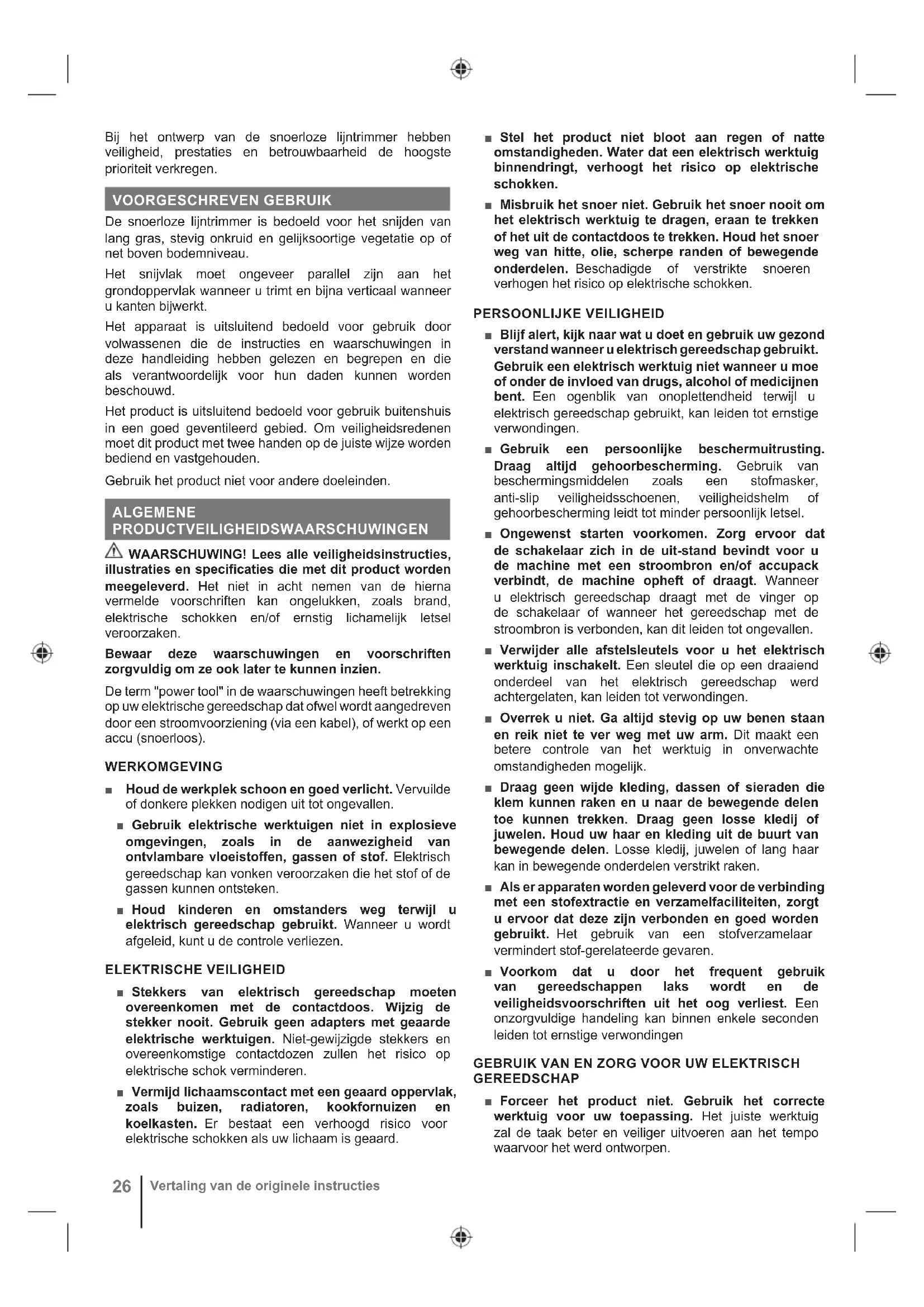 Note Avvertenze Parti o accessori venduti separatamente26 Vertaling van de originele instructies Bij het ontwerp van de snoerloze lijntrimmer hebben veiligheid, prestaties en betrouwbaarheid de hoogste prioriteit verkregen. VOORGESCHREVEN GEBRUIK De snoerloze lijntrimmer is bedoeld voor het snijden van lang gras, stevig onkruid en gelijksoortige vegetatie op of net boven bodemniveau. Het snijvlak moet ongeveer parallel zijn aan het grondoppervlak wanneer u trimt en bijna verticaal wanneer u kanten bijwerkt. Het apparaat is uitsluitend bedoeld voor gebruik door volwassenen die de instructies en waarschuwingen in deze handleiding hebben gelezen en begrepen en die als verantwoordelijk voor hun daden kunnen worden beschouwd. Het product is uitsluitend bedoeld voor gebruik buitenshuis in een goed geventileerd gebied. Om veiligheidsredenen moet dit product met twee handen op de juiste wijze worden bediend en vastgehouden. Gebruik het product niet voor andere doeleinden. ALGEMENE PRODUCTVEILIGHEIDSWAARSCHUWINGEN WAARSCHUWING! Lees alle veiligheidsinstructies, illustraties en specificaties die met dit product worden meegeleverd. Het niet in acht nemen van de hierna vermelde voorschriften kan ongelukken, zoals brand, elektrische schokken en/of ernstig lichamelijk letsel veroorzaken. Bewaar deze waarschuwingen en voorschriften zorgvuldig om ze ook later te kunnen inzien. De term "power tool" in de waarschuwingen heeft betrekking op uw elektrische gereedschap dat ofwel wordt aangedreven door een stroomvoorziening (via een kabel), of werkt op een accu (snoerloos). WERKOMGEVING ■ Houd de werkplek schoon en goed verlicht. Vervuilde of donkere plekken nodigen uit tot ongevallen. ■ Gebruik elektrische werktuigen niet in explosieve omgevingen, zoals in de aanwezigheid van ontvlambare vloeistoffen, gassen of stof. Elektrisch gereedschap kan vonken veroorzaken die het stof of de gassen kunnen ontsteken. ■ Houd kinderen en omstanders weg terwijl u elektrisch gereedschap gebruikt. Wanneer u wordt afgeleid, kunt u de controle verliezen. ELEKTRISCHE VEILIGHEID ■ Stekkers van elektrisch gereedschap moeten overeenkomen met de contactdoos. Wijzig de stekker nooit. Gebruik geen adapters met geaarde elektrische werktuigen. Niet-gewijzigde stekkers en overeenkomstige contactdozen zullen het risico op elektrische schok verminderen. ■ Vermijd lichaamscontact met een geaard oppervlak, zoals buizen, radiatoren, kookfornuizen en koelkasten. Er bestaat een verhoogd risico voor elektrische schokken als uw lichaam is geaard. ■ Stel het product niet bloot aan regen of natte omstandigheden. Water dat een elektrisch werktuig binnendringt, verhoogt het risico op elektrische schokken. ■ Misbruik het snoer niet. Gebruik het snoer nooit om het elektrisch werktuig te dragen, eraan te trekken of het uit de contactdoos te trekken. Houd het snoer weg van hitte, olie, scherpe randen of bewegende onderdelen. Beschadigde of verstrikte snoeren verhogen het risico op elektrische schokken. PERSOONLIJKE VEILIGHEID ■ Blijf alert, kijk naar wat u doet en gebruik uw gezond verstand wanneer u elektrisch gereedschap gebruikt. Gebruik een elektrisch werktuig niet wanneer u moe of onder de invloed van drugs, alcohol of medicijnen bent. Een ogenblik van onoplettendheid terwijl u elektrisch gereedschap gebruikt, kan leiden tot ernstige verwondingen. ■ Gebruik een persoonlijke beschermuitrusting. Draag altijd gehoorbescherming. Gebruik van beschermingsmiddelen zoals een stofmasker, anti-slip veiligheidsschoenen, veiligheidshelm of gehoorbescherming leidt tot minder persoonlijk letsel. ■ Ongewenst starten voorkomen. Zorg ervoor dat de schakelaar zich in de uit-stand bevindt voor u de machine met een stroombron en/of accupack verbindt, de machine opheft of draagt. Wanneer u elektrisch gereedschap draagt met de vinger op de schakelaar of wanneer het gereedschap met de stroombron is verbonden, kan dit leiden tot ongevallen. ■ Verwijder alle afstelsleutels voor u het elektrisch werktuig inschakelt. Een sleutel die op een draaiend onderdeel van het elektrisch gereedschap werd achtergelaten, kan leiden tot verwondingen. ■ Overrek u niet. Ga altijd stevig op uw benen staan en reik niet te ver weg met uw arm. Dit maakt een betere controle van het werktuig in onverwachte omstandigheden mogelijk. ■ Draag geen wijde kleding, dassen of sieraden die klem kunnen raken en u naar de bewegende delen toe kunnen trekken. Draag geen losse kledij of juwelen. Houd uw haar en kleding uit de buurt van bewegende delen. Losse kledij, juwelen of lang haar kan in bewegende onderdelen verstrikt raken. ■ Als er apparaten worden geleverd voor de verbinding met een stofextractie en verzamelfaciliteiten, zorgt u ervoor dat deze zijn verbonden en goed worden gebruikt. Het gebruik van een stofverzamelaar vermindert stof-gerelateerde gevaren. ■ Voorkom dat u door het frequent gebruik van gereedschappen laks wordt en de veiligheidsvoorschriften uit het oog verliest. Een onzorgvuldige handeling kan binnen enkele seconden leiden tot ernstige verwondingen GEBRUIK VAN EN ZORG VOOR UW ELEKTRISCH GEREEDSCHAP ■ Forceer het product niet. Gebruik het correcte werktuig voor uw toepassing. Het juiste werktuig zal de taak beter en veiliger uitvoeren aan het tempo waarvoor het werd ontworpen.NEDERLANDS