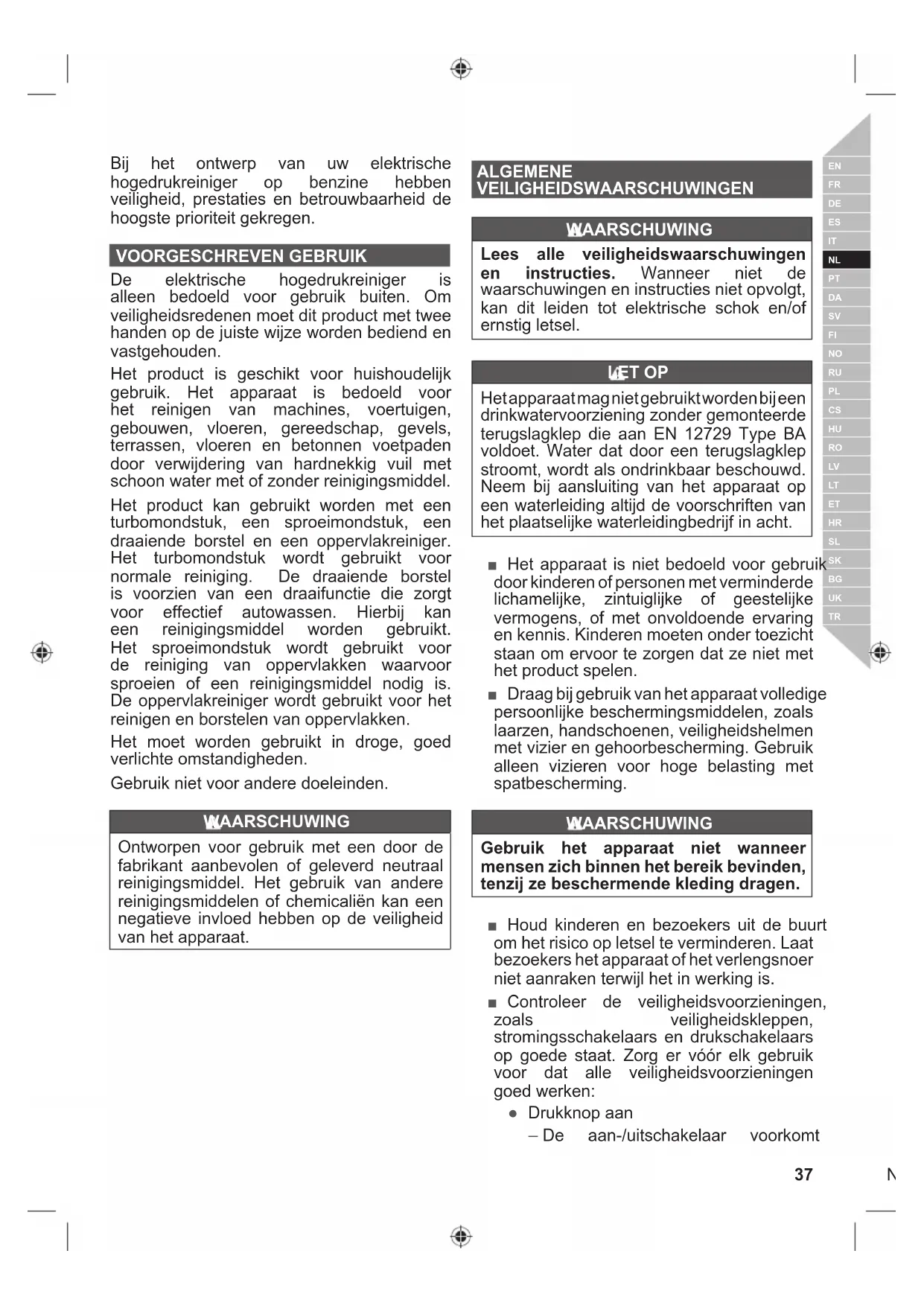 De elektrische hagedrukreiniger is alleen bedoeld voor gebruik buiten. Om veiligheidsredenen moet dit product met twee handen op de juiste wijze worden bediend en vastgehonden.