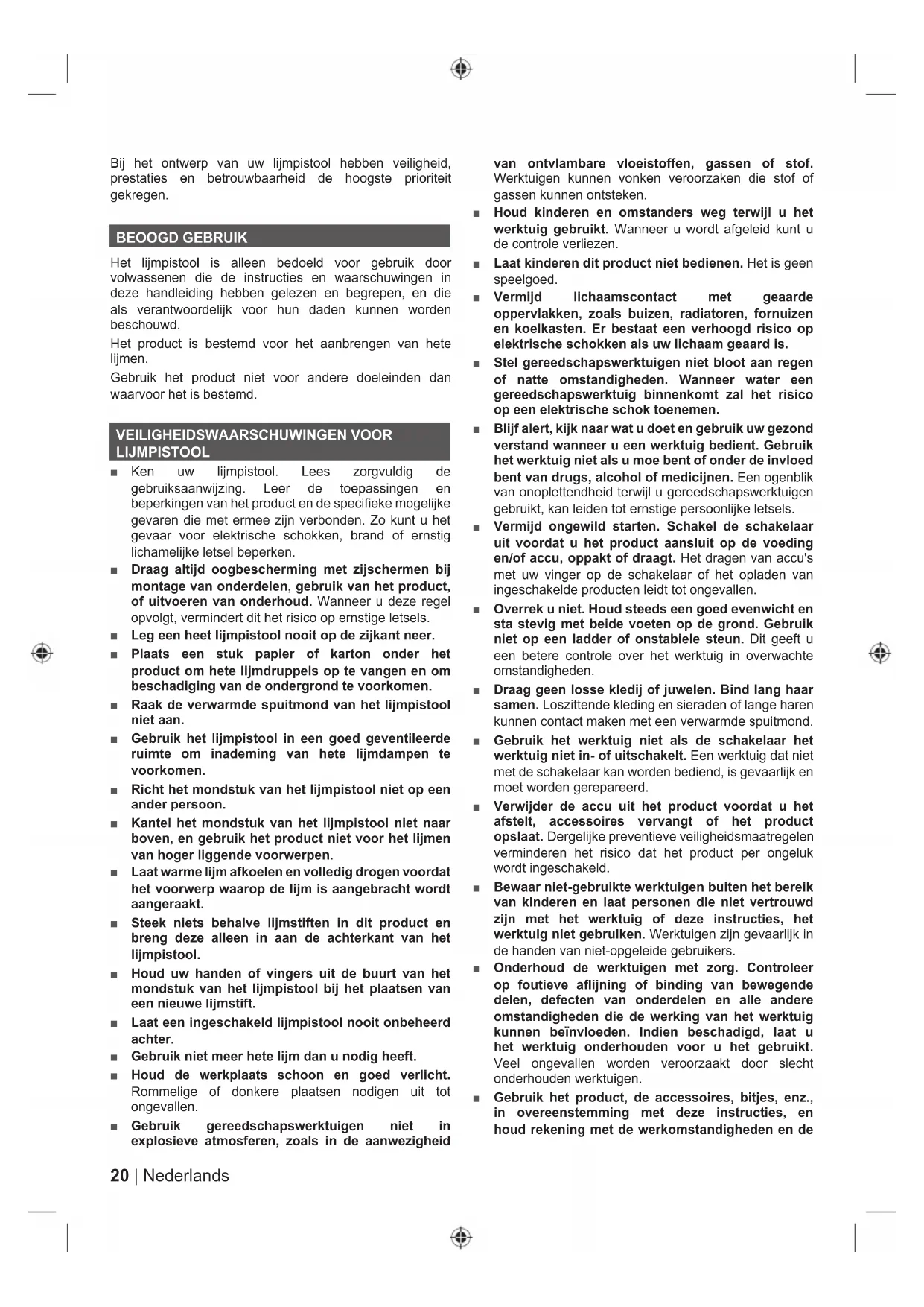 uit te voeren werkzaamheden. Het gebruik van het werktuig voor niet-voorgeschreven gebruik kan leiden tot gevaarlijke situaties. ■ Accuproducten moeten niet met een contactdoos zijn verbonden; daarom zijn ze altijd gebruiksklaar. Let op mogelijke gevaren wanneer u accuproducten niet gebruikt of wanneer u accessoires oplaadt. Zo kunt u het gevaar voor elektrische schokken, brand of ernstig lichamelijke letsel beperken. ■ Plaats geen accuproducten of hun accu's in de buurt van vuur of hitte. Dit zal het gevaar op explosie en mogelijke letsels verminderen. ■ Laat uw werktuig door een gekwalificeerde reparateur onderhouden en gebruik uitsluitend identieke vervangonderdelen. Dit zal ervoor zorgen dat de veiligheid van het gereedschap wordt bewaard. ■ Bewaar deze instructies. Raadpleeg ze regelmatig en gebruik dit om anderen doe dit werktuig mogelijks gebruiken, te instrueren. Als u dit werktuig aan iemand uitleent, leen hem dan deze instructies ook uit. AANVULLENDE VEILIGHEIDSWAARSCHUWINGEN ■ Laat uw vertrouwdheid met werktuigen u niet zorgeloos maken. Vergeet niet dat zelfs één seconde onoplettendheid ernstig lichamelijk letsel kan veroorzaken. ■ Verwijder de accu altijd uit uw gereedschap wanneer u onderdelen monteert, de machine afstelt, schoonmaakt of niet gebruikt. Wanneer u het accupack verwijdert, voorkomt dit accidenteel starten, wat ernstig letsel kan veroorzaken. ■ Gebruik geen accessoires of opzetstukken die niet door de fabrikant van dit product zijn aanbevolen. Bij gebruik van niet aanbevolen onderdelen of accessoires bestaat gevaar voor ernstig lichamelijk letsel. ■ Producten met een accu zijn altijd in bedrijfsklare toestand. Zet de schakelaar in de stand 'uit' ('O') en verwijder de accu wanneer het product niet in gebruik is of wanneer u het bij u draagt. ■ Plaats het lijmpistool altijd zodanig dat het mondstuk met niets in contact kan komen bij het opwarmen of wanneer het niet in gebruik is. Door deze regel op te volgen wordt het risico verminderd op beschadigingen, brandwonden, brand of ernstig lichamelijk letsel. ■ Wees voorzichtig bij het aanbrengen van hete lijm op dun of poreus materiaal. Het onderliggende oppervlak kan beschadigd raken, of er kan lijm op het oppervlak worden afgezet, wat lastig te verwijderen kan zijn. ■ Oefen geen kracht uit op de trekker bij het aanbrengen van warme lijm. Dit kan het lijmpistool beschadigen. Gebruik een proefstuk van het materiaal om te zorgen dat de lijm genoeg is gesmolten en zonder te forceren stroomt. ■ Gebruik uw vingers niet om een voorwerp aan te drukken waarop net hete lijm is aangebracht. Hierdoor kan hete lijm ontsnappen aan de randen of het verbindingsoppervlak opwarmen en mogelijk brandwonden en schade aan omringende objecten veroorzaken. ■ Laat de lijm goed drogen voordat u uw werk verplaatst om zeker te zijn van een goede hechting en om het risico op brandwonden te verminderen. ■ Gebruik bij aanbrengen van lijm op zeer kleine voorwerpen een pincet of tang om te voorkomen dat uw vingers in de buurt komen van het mondstuk. ■ Laat de lijmstift en de spuitmond van het lijmpistool volledig afkoelen voordat u de accu verwijdert.