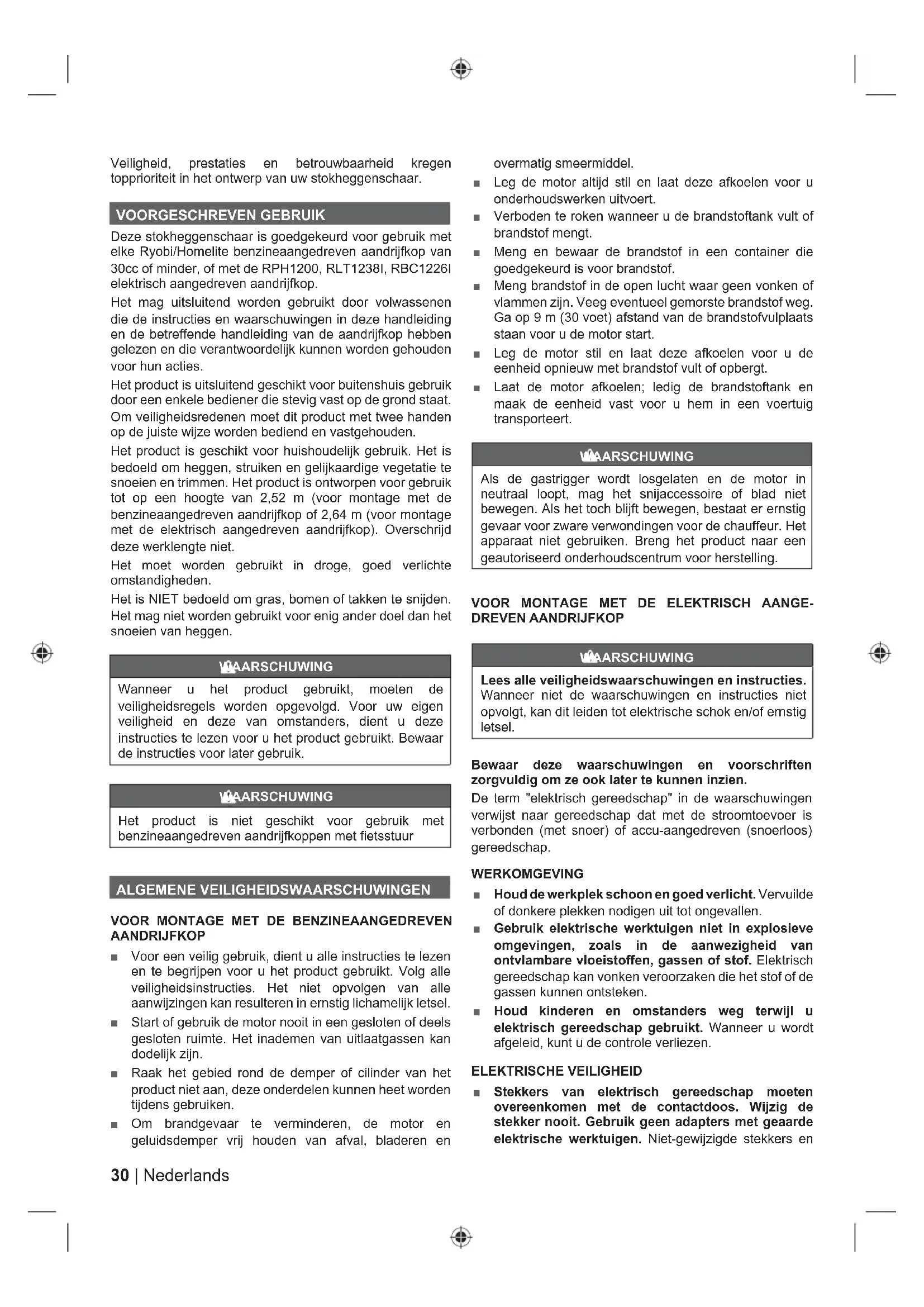 Parti o accessori venduti separatamente Nota: Avvertenze I seguenti simboli indicano i livelli di rischio associati a questo prodotto. PERICOLO Indica una situazione pericolosa che, se non evitata attentamente, potrà causare gravi lesioni alla persona o morte. AVVERTENZA Indica una situazione potenzialmente pericolosa che, se non evitata attentamente, potrà causare gravi lesioni alla persona o morte ATTENZIONE Indica una situazione potenzialmente pericolosa che, se non evitata attentamente, potrà causare lesioni minori o moderate alla persona. ATTENZIONE Senza simbolo di allerta di sicurezza Indica una situazione che potrà risultare in gravi danni a cose.30 | Nederlands Veiligheid, prestaties en betrouwbaarheid kregen topprioriteit in het ontwerp van uw stokheggenschaar. VOORGESCHREVEN GEBRUIK Deze stokheggenschaar is goedgekeurd voor gebruik met elke Ryobi/Homelite benzineaangedreven aandrijfkop van 30cc of minder, of met de RPH1200, RLT1238I, RBC1226I elektrisch aangedreven aandrijfkop. Het mag uitsluitend worden gebruikt door volwassenen die de instructies en waarschuwingen in deze handleiding en de betreffende handleiding van de aandrijfkop hebben gelezen en die verantwoordelijk kunnen worden gehouden voor hun acties. Het product is uitsluitend geschikt voor buitenshuis gebruik door een enkele bediener die stevig vast op de grond staat. Om veiligheidsredenen moet dit product met twee handen op de juiste wijze worden bediend en vastgehouden. Het product is geschikt voor huishoudelijk gebruik. Het is bedoeld om heggen, struiken en gelijkaardige vegetatie te snoeien en trimmen. Het product is ontworpen voor gebruik tot op een hoogte van 2,52 m (voor montage met de benzineaangedreven aandrijfkop of 2,64 m (voor montage met de elektrisch aangedreven aandrijfkop). Overschrijd deze werklengte niet. Het moet worden gebruikt in droge, goed verlichte omstandigheden. Het is NIET bedoeld om gras, bomen of takken te snijden. Het mag niet worden gebruikt voor enig ander doel dan het snoeien van heggen. WAARSCHUWING Wanneer u het product gebruikt, moeten de veiligheidsregels worden opgevolgd. Voor uw eigen veiligheid en deze van omstanders, dient u deze instructies te lezen voor u het product gebruikt. Bewaar de instructies voor later gebruik. WAARSCHUWING Het product is niet geschikt voor gebruik met benzineaangedreven aandrijfkoppen met fietsstuur ALGEMENE VEILIGHEIDSWAARSCHUWINGEN