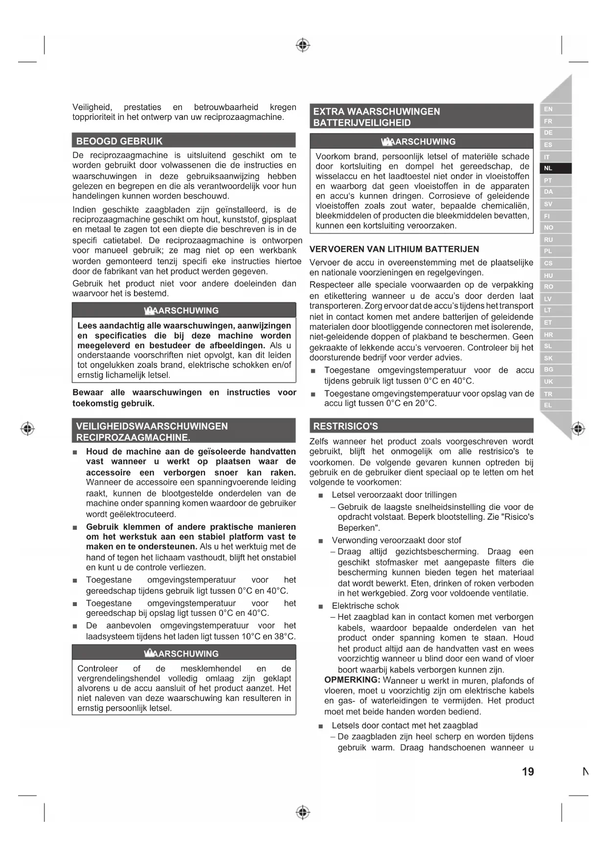 ELI seguenti simboli indicano i livelli di rischio associati a questo prodotto. PERICOLO Indica una situazione immediatamente pericolosa che, se non evitata, potrà causare gravi lesioni o morte. AVVERTENZE Indica una situazione potenzialmente pericolosa che, se non evitata potrà causare gravi lesioni o morte. ATTENZIONE Indica una situazione potenzialmente pericolosa che, se non evitata, potrà causare lesioni minori o moderate. ATTENZIONE (Senza simbolo di allarme in materia di sicurezza) Indica una situazione che può provocare danni materiali. 18 | ItalianoVeiligheid, prestaties en betrouwbaarheid kregen topprioriteit in het ontwerp van uw reciprozaagmachine. BEOOGD GEBRUIK De reciprozaagmachine is uitsluitend geschikt om te worden gebruikt door volwassenen die de instructies en waarschuwingen in deze gebruiksaanwijzing hebben gelezen en begrepen en die als verantwoordelijk voor hun handelingen kunnen worden beschouwd. Indien geschikte zaagbladen zijn geïnstalleerd, is de reciprozaagmachine geschikt om hout, kunststof, gipsplaat en metaal te zagen tot een diepte die beschreven is in de specifi catietabel. De reciprozaagmachine is ontworpen voor manueel gebruik; ze mag niet op een werkbank worden gemonteerd tenzij specifi eke instructies hiertoe door de fabrikant van het product werden gegeven. Gebruik het product niet voor andere doeleinden dan waarvoor het is bestemd. WAARSCHUWING Lees aandachtig alle waarschuwingen, aanwijzingen en specificaties die bij deze machine worden meegeleverd en bestudeer de afbeeldingen. Als u onderstaande voorschriften niet opvolgt, kan dit leiden tot ongelukken zoals brand, elektrische schokken en/of ernstig lichamelijk letsel. Bewaar alle waarschuwingen en instructies voor toekomstig gebruik. VEILIGHEIDSWAARSCHUWINGEN RECIPROZAAGMACHINE. ■ Houd de machine aan de geïsoleerde handvatten vast wanneer u werkt op plaatsen waar de accessoire een verborgen snoer kan raken. Wanneer de accessoire een spanningvoerende leiding raakt, kunnen de blootgestelde onderdelen van de machine onder spanning komen waardoor de gebruiker wordt geëlektrocuteerd. ■ Gebruik klemmen of andere praktische manieren om het werkstuk aan een stabiel platform vast te maken en te ondersteunen. Als u het werktuig met de hand of tegen het lichaam vasthoudt, blijft het onstabiel en kunt u de controle verliezen. ■ Toegestane omgevingstemperatuur voor het gereedschap tijdens gebruik ligt tussen 0°C en 40°C. ■ Toegestane omgevingstemperatuur voor het gereedschap bij opslag ligt tussen 0°C en 40°C. ■ De aanbevolen omgevingstemperatuur voor het laadsysteem tijdens het laden ligt tussen 10°C en 38°C. WAARSCHUWING Controleer of de mesklemhendel en de vergrendelingshendel volledig omlaag zijn geklapt alvorens u de accu aansluit of het product aanzet. Het niet naleven van deze waarschuwing kan resulteren in ernstig persoonlijk letsel. EXTRA WAARSCHUWINGEN BATTERIJVEILIGHEID WAARSCHUWING Voorkom brand, persoonlijk letsel of materiële schade door kortsluiting en dompel het gereedschap, de wisselaccu en het laadtoestel niet onder in vloeistoffen en waarborg dat geen vloeistoffen in de apparaten en accu‘s kunnen dringen. Corrosieve of geleidende vloeistoffen zoals zout water, bepaalde chemicaliën, bleekmiddelen of producten die bleekmiddelen bevatten, kunnen een kortsluiting veroorzaken. VER