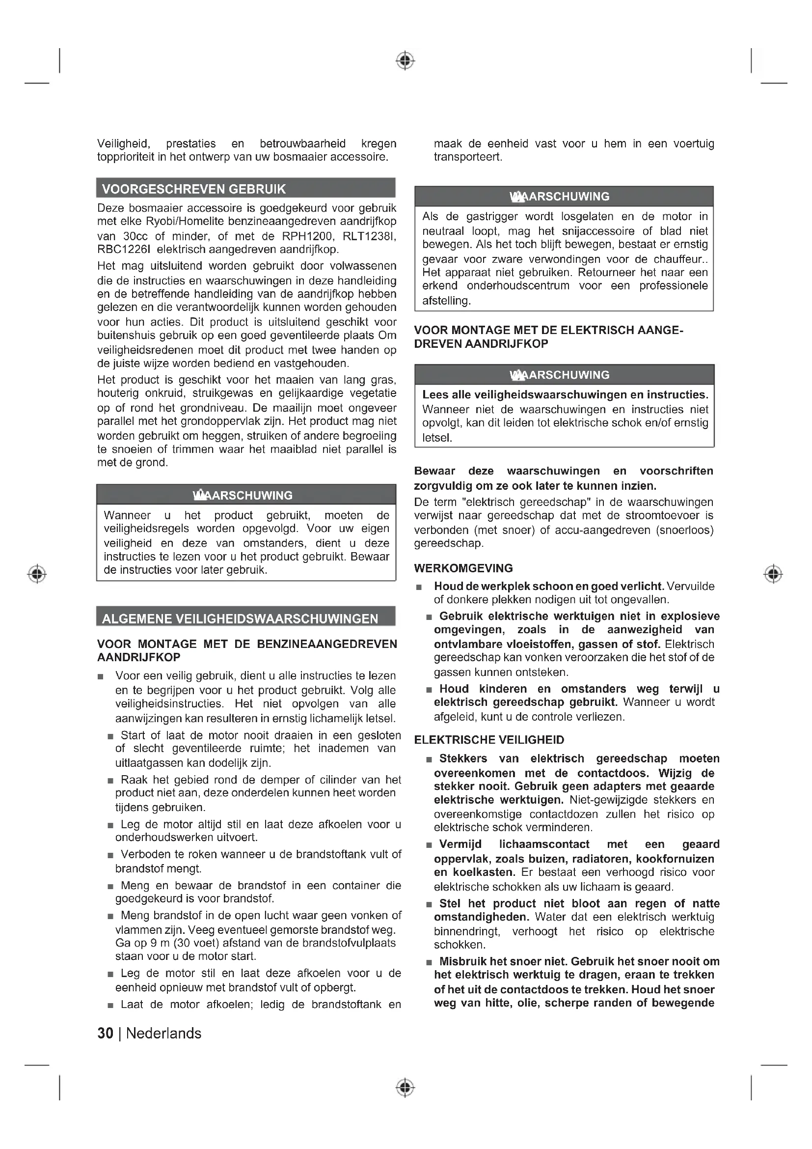 Direzione rotazionale e velocità massima dell'albero per l'accessorio di taglio. I seguenti simboli indicano i livelli di rischio associati a questo prodotto. PERICOLO Indica una situazione pericolosa che, se non evitata attentamente, potrà causare gravi lesioni alla persona o morte. AVVERTENZA Indica una situazione potenzialmente pericolosa che, se non evitata attentamente, potrà causare gravi lesioni alla persona o morte ATTENZIONE Indica una situazione potenzialmente pericolosa che, se non evitata attentamente, potrà causare lesioni minori o moderate alla persona. ATTENZIONE Senza simbolo di allerta di sicurezza Indica una situazione che potrà risultare in gravi danni a cose.30 | Nederlands Veiligheid, prestaties en betrouwbaarheid kregen topprioriteit in het ontwerp van uw bosmaaier accessoire. VOORGESCHREVEN GEBRUIK Deze bosmaaier accessoire is goedgekeurd voor gebruik met elke Ryobi/Homelite benzineaangedreven aandrijfkop van 30cc of minder, of met de RPH1200, RLT1238I, RBC1226I elektrisch aangedreven aandrijfkop. Het mag uitsluitend worden gebruikt door volwassenen die de instructies en waarschuwingen in deze handleiding en de betreffende handleiding van de aandrijfkop hebben gelezen en die verantwoordelijk kunnen worden gehouden voor hun acties. Dit product is uitsluitend geschikt voor buitenshuis gebruik op een goed geventileerde plaats Om veiligheidsredenen moet dit product met twee handen op de juiste wijze worden bediend en vastgehouden. Het product is geschikt voor het maaien van lang gras, houterig onkruid, struikgewas en gelijkaardige vegetatie op of rond het grondniveau. De maailijn moet ongeveer parallel met het grondoppervlak zijn. Het product mag niet worden gebruikt om heggen, struiken of andere begroeiing te snoeien of trimmen waar het maaiblad niet parallel is met de grond. WAARSCHUWING Wanneer u het product gebruikt, moeten de veiligheidsregels worden opgevolgd. Voor uw eigen veiligheid en deze van omstanders, dient u deze instructies te lezen voor u het product gebruikt. Bewaar de instructies voor later gebruik. ALGEMENE VEILIGHEIDSWAARSCHUWINGEN