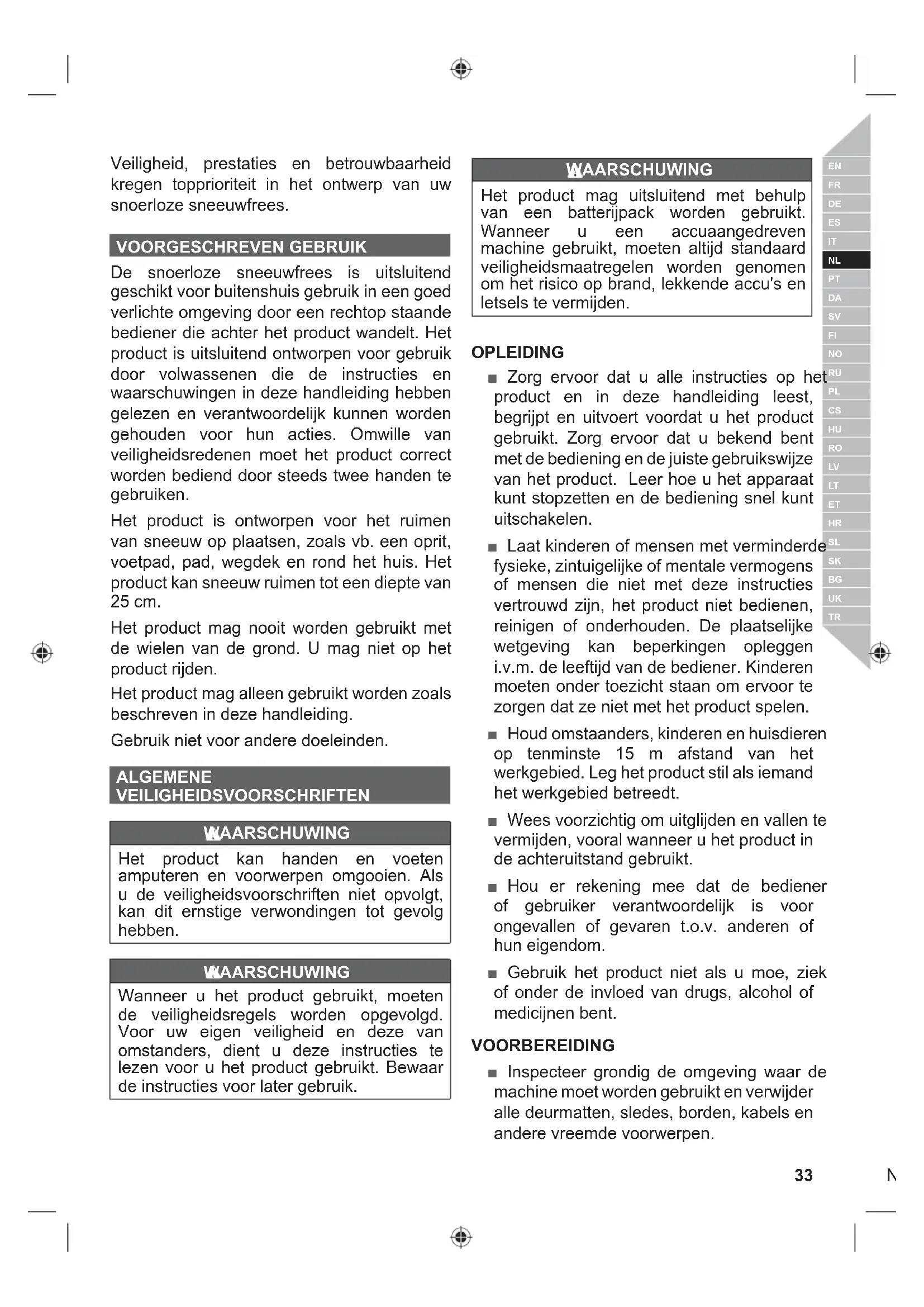 Veiligheid, prestaties en betrouwbaarheid kregen topprioriteit in het ontwerp van uw snoerloze sneeuwfrees. VOORGESCHREVEN GEBRUIK De snoerloze sneeuwfrees is uitsluitend geschikt voor buitenshuis gebruik in een goed verlichte omgeving door een rechtop staande bediener die achter het product wandelt. Het product is uitsluitend ontworpen voor gebruik door volwassenen die de instructies en waarschuwingen in deze handleiding hebben gelezen en verantwoordelijk kunnen worden gehouden voor hun acties. Omwille van veiligheidsredenen moet het product correct worden bediend door steeds twee handen te gebruiken. Het product is ontworpen voor het ruimen van sneeuw op plaatsen, zoals vb. een oprit, voetpad, pad, wegdek en rond het huis. Het product kan sneeuw ruimen tot een diepte van 25 cm. Het product mag nooit worden gebruikt met de wielen van de grond. U mag niet op het product rijden. Het product mag alleen gebruikt worden zoals beschreven in deze handleiding. Gebruik niet voor andere doeleinden. ALGEMENE VEILIGHEIDSVOORSCHRIFTEN WAARSCHUWING Het product kan handen en voeten amputeren en voorwerpen omgooien. Als u de veiligheidsvoorschriften niet opvolgt, kan dit ernstige verwondingen tot gevolg hebben. WAARSCHUWING Wanneer u het product gebruikt, moeten de veiligheidsregels worden opgevolgd. Voor uw eigen veiligheid en deze van omstanders, dient u deze instructies te lezen voor u het product gebruikt. Bewaar de instructies voor later gebruik. WAARSCHUWING Het product mag uitsluitend met behulp van een batterijpack worden gebruikt. Wanneer u een accuaangedreven machine gebruikt, moeten altijd standaard veiligheidsmaatregelen worden genomen om het risico op brand, lekkende accu's en letsels te vermijden. OPLEIDING ■ Zorg ervoor dat u alle instructies op het product en in deze handleiding leest, begrijpt en uitvoert voordat u het product gebruikt. Zorg ervoor dat u bekend bent met de bediening en de juiste gebruikswijze van het product. Leer hoe u het apparaat kunt stopzetten en de bediening snel kunt uitschakelen. ■ Laat kinderen of mensen met verminderde fysieke, zintuigelijke of mentale vermogens of mensen die niet met deze instructies vertrouwd zijn, het product niet bedienen, reinigen of onderhouden. De plaatselijke wetgeving kan beperkingen opleggen i.v.m. de leeftijd van de bediener. Kinderen moeten onder toezicht staan om ervoor te zorgen dat ze niet met het product spelen. ■ Houd omstaanders, kinderen en huisdieren op tenminste 15 m afstand van het werkgebied. Leg het product stil als iemand het werkgebied betreedt. ■ Wees voorzichtig om uitglijden en vallen te vermijden, vooral wanneer u het product in de achteruitstand gebruikt. ■ Hou er rekening mee dat de bediener of gebruiker verantwoordelijk is voor ongevallen of gevaren t.o.v. anderen of hun eigendom. ■ Gebruik het product niet als u moe, ziek of onder de invloed van drugs, alcohol of medicijnen bent. VOORBEREIDING ■ Inspecteer grondig de omgeving waar de machine moet worden gebruikt en verwijder alle deurmatten, sledes, borden, kabels en andere vreemde voorwerpen.34 | Nederlands