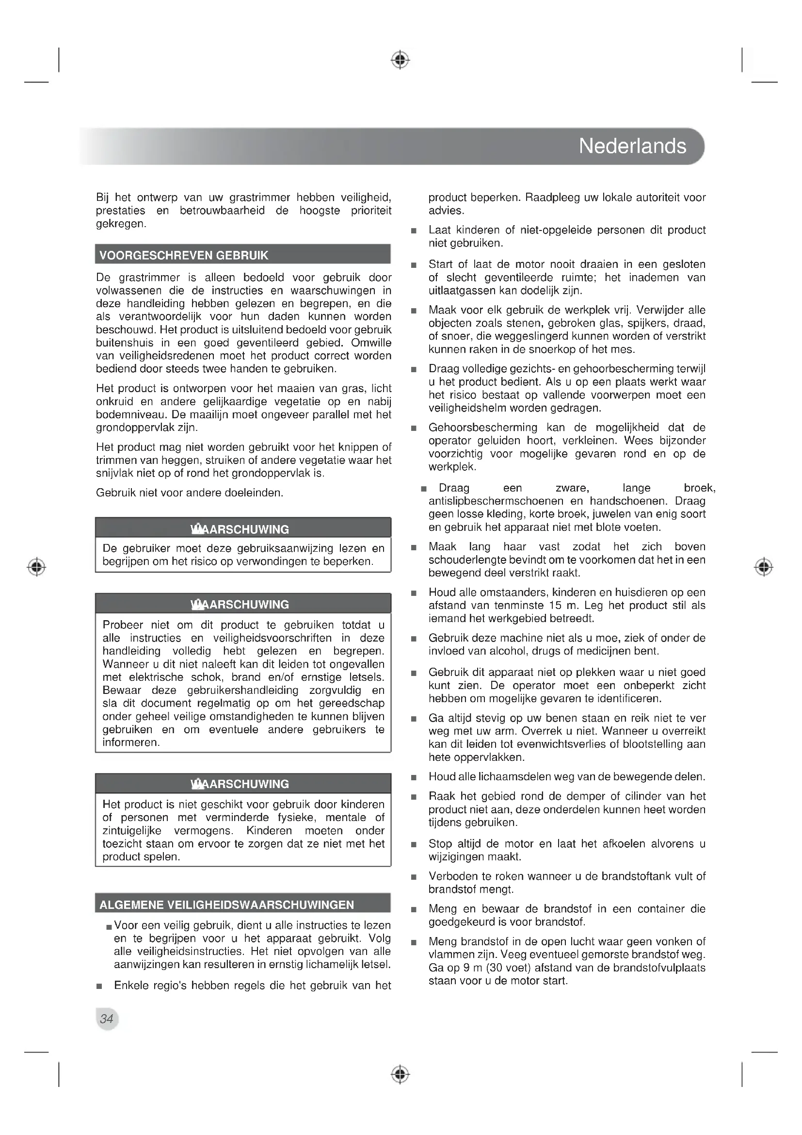 Voor een veilig gebruik, dient u alle instructies te lezen en te begrijpen voor u het apparaat gebruikt. Volg alle veiligheidsinstructies. Het niet opvolgen van alle aanwijzingen kan resulteren in ernstig lichamelijk letsel. Ŷ Enkele regio's hebben regels die het gebruik van het product beperken. Raadpleeg uw lokale autoriteit voor advies. Ŷ Laat kinderen of niet-opgeleide personen dit product niet gebruiken. Ŷ Start of laat de motor nooit draaien in een gesloten of slecht geventileerde ruimte; het inademen van uitlaatgassen kan dodelijk zijn. Ŷ Maak voor elk gebruik de werkplek vrij. Verwijder alle objecten zoals stenen, gebroken glas, spijkers, draad, of snoer, die weggeslingerd kunnen worden of verstrikt kunnen raken in de snoerkop of het mes. Ŷ Draag volledige gezichts- en gehoorbescherming terwijl u het product bedient. Als u op een plaats werkt waar het risico bestaat op vallende voorwerpen moet een veiligheidshelm worden gedragen. Ŷ Gehoorsbescherming kan de mogelijkheid dat de operator geluiden hoort, verkleinen. Wees bijzonder voorzichtig voor mogelijke gevaren rond en op de werkplek. Ŷ Draag een zware, lange broek, antislipbeschermschoenen en handschoenen. Draag geen losse kleding, korte broek, juwelen van enig soort en gebruik het apparaat niet met blote voeten. Ŷ Maak lang haar vast zodat het zich boven schouderlengte bevindt om te voorkomen dat het in een bewegend deel verstrikt raakt. Ŷ Houd alle omstaanders, kinderen en huisdieren op een afstand van tenminste 15 m. Leg het product stil als iemand het werkgebied betreedt. Ŷ Gebruik deze machine niet als u moe, ziek of onder de invloed van alcohol, drugs of medicijnen bent. Ŷ Gebruik dit apparaat niet op plekken waar u niet goed kunt zien. De operator moet een onbeperkt zicht hebben om mogelijke gevaren te identificeren. Ŷ Ga altijd stevig op uw benen staan en reik niet te ver weg met uw arm. Overrek u niet. Wanneer u overreikt kan dit leiden tot evenwichtsverlies of blootstelling aan hete oppervlakken. Ŷ Houd alle lichaamsdelen weg van de bewegende delen. Ŷ Raak het gebied rond de demper of cilinder van het product niet aan, deze onderdelen kunnen heet worden tijdens gebruiken. Ŷ Stop altijd de motor en laat het afkoelen alvorens u wijzigingen maakt. Ŷ Verboden te roken wanneer u de brandstoftank vult of brandstof mengt. Ŷ Meng en bewaar de brandstof in een container die goedgekeurd is voor brandstof. Ŷ Meng brandstof in de open lucht waar geen vonken of vlammen zijn. Veeg eventueel gemorste brandstof weg. Ga op 9 m (30 voet) afstand van de brandstofvulplaats staan voor u de motor start.Nederlands