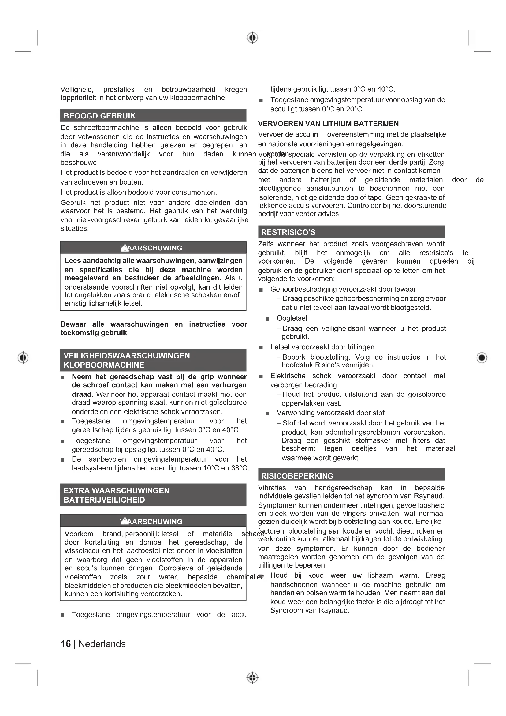 Ŷ Doe oefeningen om de bloeddoorstroming te bevorderen na elke periode van gebruik. Ŷ Neem regelmatig een pauze. Beperk het aantal uren dat u per dag wordt blootgesteld. Wanneer u enige van de symptomen van deze aandoening HUYDDUW VWRS GDQ RQPLGGHOOLMN PHW KHW JHEUXLN YDQ KHW toestel en raadpleeg uw dokter WAARSCHUWING Letsels kunnen optreden of verergeren door langdurig gebruik van een gereedschap. Als u een werktuig gedurende langere periodes gebruikt, neem dan regelmatig pauze.