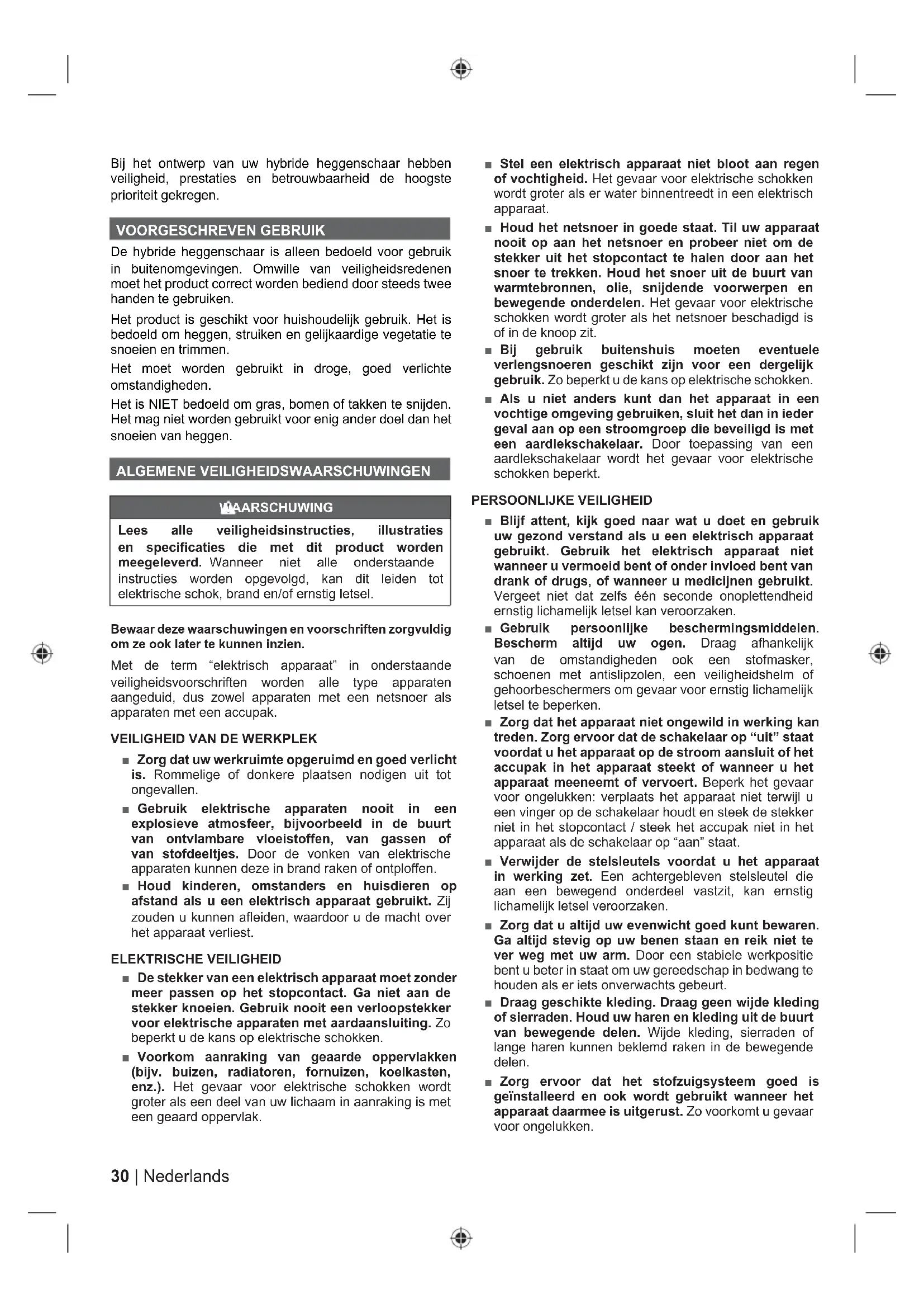 ■ Laad het accupak van uw apparaat alleen op met behulp van het laadapparaat dat door de fabrikant is voorgeschreven. Een lader die voor een bepaald type accu bedoeld is, kan brand veroorzaken als die voor een ander type accu wordt gebruikt. ■ Accugereedschap mag alleen in combinatie met een bepaald type accu worden gebruikt. Het gebruik van andere accu’s kan brand veroorzaken. ■ Houd de accu, wanneer deze niet gebruikt wordt, uit de buurt van metalen voorwerpen zoals paperclips, geldstukken, sleutels, spijkers, schroeven en andere metalen voorwerpen die verbinding tussen de klemmen zouden kunnen maken. Kortsluiting van de klemmen van de accu kan brandwonden of brand veroorzaken. ■ Zorg dat u niet met accuvloeistof in aanraking komt als dit uit de accu is gelekt bij verkeerd gebruik. Mocht dit gebeuren, dan dient u de betreffende plekken overvloedig met helder water te spoelen. Raadpleeg ook een arts als er vloeistof in uw ogen is gekomen. De uit een accu gestoten vloeistof kan irritaties of brandwonden veroorzaken. ■ Gebruik geen accu's of gereedschappen die beschadigd zijn of waaraan wijzigingen zijn doorgevoerd. Beschadigde of aangepaste accu's kunnen zich onvoorspelbaar gedragen, wat kan leiden tot brand, explosie of letsel. ■ Stel accu's of gereedschappen niet bloot aan brand of overmatige temperaturen. Blootstelling aan brand of temperaturen boven 130°C kan een explosie veroorzaken. ■ Volg alle laadinstructies op en laad de accu of het gereedschap niet op buiten het temperatuurbereik dat in de instructies staat vermeld. Het onjuist opladen of opladen buiten het aangegeven temperatuurbereik kan de accu beschadigen en het brandgevaar doen toenemen. ONDERHOUD ■ Eventuele reparaties mogen alleen door een bekwame vakman worden uitgevoerd met gebruik van originele reservedelen. Zo kunt u het elektrisch apparaat veilig blijven gebruiken. ■ Beschadigde accu's mogen nooit zelf worden gerepareerd. Reparatie van accu's mag uitsluitend worden uitgevoerd door de fabrikant of door een bevoegde reparatieservice. VEILIGHEIDSWAARSCHUWINGEN VOOR ELEKTRISCHE HEGGENSCHAAR ■ Houd alle lichaamsdelen weg van het snijblad. Verwijder geen gesnoeid materiaal of houd geen materiaal dat moet worden gesnoeid vast wanneer de snijbladen bewegen. Zorg ervoor dat de schakelaar is uitgeschakeld wanneer u geblokkeerd materiaal vrijmaakt. Een ogenblik van onoplettendheid tijdens het gebruik van het product kan leiden tot ernstige persoonlijke letsels. ■ Houd de heggeschaar aan het handvat vast als het snijblad is stilgevallen. Wanneer u de heggeschaar transporteert of opbergt, dient u altijd de beschermhoes van de snijbladen te bevestigen. Wanneer u de heggeschaar degelijk gebruikt, vermindert de kans op verwondingen door de snijbladen.32 | Nederlands ■ Houd het werktuig uitsluitend aan de geïsoleerde handvatten vast omdat de snijbladen in contact kunnen komen met verborgen kabels of het eigen stroomsnoer. Snijbladen die in contact komen met een kabel "onder spanning" kunnen ervoor zorgen dat blootgestelde metalen onderdelen van het werktuig ook "onder spanning" komen te staan, wat de gebruiker een elektrische schok kan geven.