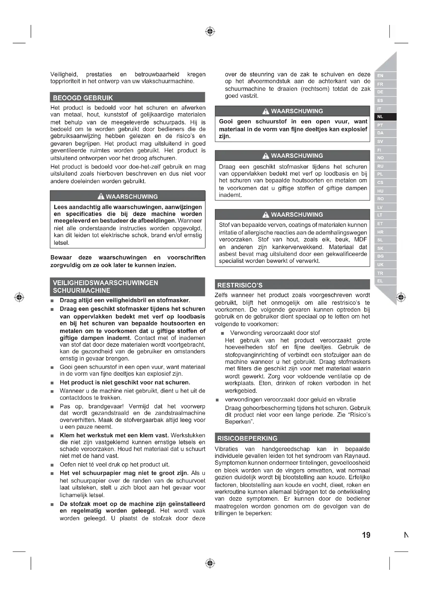 Veiligheid, prestaties en betrouwbaarheid kregen topprioriteit in het ontwerp van uw vlakschuurmachine. BEOOGD GEBRUIK Het product is bedoeld voor het schuren en afwerken van metaal, hout, kunststof of gelijkaardige materialen met behulp van de meegeleverde schuurpads. Hij is bedoeld om te worden gebruikt door bedieners die de gebruiksaanwijzing hebben gelezen en de risico’s en gevaren begrijpen. Het product mag uitsluitend in goed geventileerde ruimtes worden gebruikt. Het product is uitsluitend ontworpen voor het droog afschuren. Het product is bedoeld voor doe-het-zelf gebruik en mag uitsluitend zoals hierboven beschreven en dus niet voor andere doeleinden worden gebruikt. WAARSCHUWING Lees aandachtig alle waarschuwingen, aanwijzingen en specificaties die bij deze machine worden meegeleverd en bestudeer de afbeeldingen. Wanneer niet alle onderstaande instructies worden opgevolgd, kan dit leiden tot elektrische schok, brand en/of ernstig letsel. Bewaar deze waarschuwingen en voorschriften zorgvuldig om ze ook later te kunnen inzien. VEILIGHEIDSWAARSCHUWINGEN SCHUURMACHINE ■ Draag altijd een veiligheidsbril en stofmasker. ■ Draag een geschikt stofmasker tijdens het schuren van oppervlakken bedekt met verf op loodbasis en bij het schuren van bepaalde houtsoorten en metalen om te voorkomen dat u giftige stoffen of giftige dampen inademt. Contact met of inademen van stof dat door deze materialen wordt voortgebracht, kan de gezondheid van de gebruiker en omstanders ernstig in gevaar brengen. ■ Gooi geen schuurstof in een open vuur, want materiaal in de vorm van fijne deeltjes kan explosief zijn. ■ Het product is niet geschikt voor nat schuren. ■ Wanneer u de machine niet gebruikt, dient u het uit de contactdoos te trekken. ■ Pas op, brandgevaar! Vermijd dat het voorwerp dat wordt gezandstraald en de zandstraalmachine oververhitten. Maak de stofvergaarbak altijd leeg voor u een pauze neemt. ■ Klem het werkstuk met een klem vast. Werkstukken die niet zijn vastgeklemd kunnen ernstige letsels en schade veroorzaken. Houd het materiaal dat u schuurt niet met de hand vast. ■ Oefen niet té veel druk op het product uit. ■ Het vel schuurpapier mag niet te groot zijn. Als u het schuurpapier over de randen van de schuurvoet laat uitsteken, stelt u zich bloot aan het gevaar voor lichamelijk letsel. ■ De stofzak moet op de machine zijn geïnstalleerd en regelmatig worden geleegd. Het wordt vaak worden geleegd. U plaatst de stofzak door deze over de steunring van de zak te schuiven en deze op het afvoermondstuk aan de achterkant van de schuurmachine te draaien (rechtsom) totdat de zak goed vastzit. WAARSCHUWING Gooi geen schuurstof in een open vuur, want materiaal in de vorm van fijne deeltjes kan explosief zijn. WAARSCHUWING Draag een geschikt stofmasker tijdens het schuren van oppervlakken bedekt met verf op loodbasis en bij het schuren van bepaalde houtsoorten en metalen om te voorkomen dat u giftige stoffen of giftige dampen inademt. WAARSCHUWING Stof van bepaalde verven, coatings of materialen kunnen irritatie of allergische reacties aan de ademhalingswegen veroorzaken. Stof van hout, zoals eik, beuk, MDF en anderen zijn kankerverwekkend. Materiaal dat asbest bevat mag uitsluitend door een gekwalificeerde specialist worden bewerkt of verwerkt. RESTRISICO’S Zelfs wanneer het product zoals voorgeschreven wordt gebruikt, blijft het onmogelijk om alle restrisico’s te voorkomen. De volgende gevaren kunnen optreden bij gebruik en de gebruiker dient speciaal op te letten om het volgende te voorkomen: ■ Verwonding veroorzaakt door stof Het gebruik van het product veroorzaakt grote hoeveelheden stof en fijne deeltjes. Gebruik de stofopvanginrichting of verbindt een stofzuiger aan de machine wanneer u het gebruikt. Draag stofmaskers met filters die geschikt zijn voor met materiaal waarin wordt gewerkt. Zorg voor voldoende ventilatie op de werkplaats. Eten, drinken of roken verboden in het werkgebied. ■ verwondingen veroorzaakt door geluid en vibratie Draag gehoorbescherming tijdens het schuren. Gebruik dit product niet voor een lange periode. Zie “Risico’s Beperken”. RISICOBEPERKING Vibraties van handgereedschap kan in bepaalde individuele gevallen leiden tot het syndroom van Raynaud. Symptomen kunnen ondermeer tintelingen, gevoelloosheid en bleek worden van de vingers omvatten, wat normaal gezien duidelijk wordt bij blootstelling aan koude. Erfelijke factoren, blootstelling aan koude en vocht, dieet, roken en werkroutine kunnen allemaal bijdragen tot de ontwikkeling van deze symptomen. Er kunnen door de bediener maatregelen worden genomen om de gevolgen van de trillingen te beperken:20 | Nederlands ■ Houd bij koud weer uw lichaam warm. Draag handschoenen wanneer u de machine gebruikt om handen en polsen warm te houden. Men neemt aan dat koud weer een belangrijke factor is die bijdraagt tot het Syndroom van Raynaud. ■ Doe oefeningen om de bloeddoorstroming te bevorderen na elke periode van gebruik. ■ Neem regelmatig een pauze. Beperk het aantal uren dat u per dag wordt blootgesteld. Wanneer u enige van de symptomen van deze aandoening ervaart, stop dan onmiddellijk met het gebruik van het toestel en raadpleeg uw dokter WAARSCHUWING Letsels kunnen optreden of verergeren door langdurig gebruik van een gereedschap. Als u een werktuig gedurende langere periodes gebruikt, neem dan regelmatig pauze.
