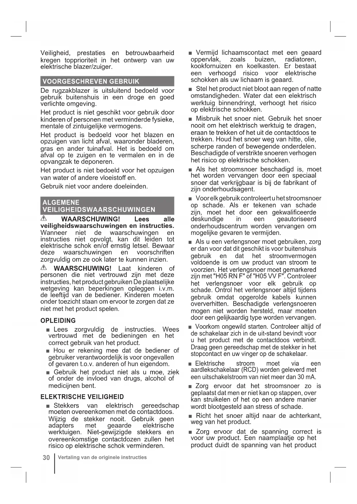 TRVeiligheid, prestaties en betrouwbaarheid kregen topprioriteit in het ontwerp van uw elektrische blazer/zuiger. VOORGESCHREVEN GEBRUIK De rugzakblazer is uitsluitend bedoeld voor gebruik buitenshuis in een droge en goed verlichte omgeving. Het product is niet geschikt voor gebruik door kinderen of personen met verminderde fysieke, mentale of zintuigelijke vermogens. Het product is bedoeld voor het blazen en opzuigen van licht afval, waaronder bladeren, gras en ander tuinafval. Het is bedoeld om afval op te zuigen en te vermalen en in de opvangzak te deponeren. Het product is niet bedoeld voor het opzuigen van water of andere vloeistoff en. Gebruik niet voor andere doeleinden. ALGEMENE VEILIGHEIDSWAARSCHUWINGEN WAARSCHUWING! Lees alle veiligheidswaarschuwingen en instructies. Wanneer niet de waarschuwingen en instructies niet opvolgt, kan dit leiden tot elektrische schok en/of ernstig letsel. Bewaar deze waarschuwingen en voorschriften zorgvuldig om ze ook later te kunnen inzien. WAARSCHUWING! Laat kinderen of personen die niet vertrouwd zijn met deze instructies, het product gebruiken De plaatselijke wetgeving kan beperkingen opleggen i.v.m. de leeftijd van de bediener. Kinderen moeten onder toezicht staan om ervoor te zorgen dat ze niet met het product spelen. OPLEIDING ■ Lees zorgvuldig de instructies. Wees vertrouwd met de bedieningen en het correct gebruik van het product. ■ Hou er rekening mee dat de bediener of gebruiker verantwoordelijk is voor ongevallen of gevaren t.o.v. anderen of hun eigendom. ■ Gebruik het product niet als u moe, ziek of onder de invloed van drugs, alcohol of medicijnen bent. ELEKTRISCHE VEILIGHEID ■ Stekkers van elektrisch gereedschap moeten overeenkomen met de contactdoos. Wijzig de stekker nooit. Gebruik geen adapters met geaarde elektrische werktuigen. Niet-gewijzigde stekkers en overeenkomstige contactdozen zullen het risico op elektrische schok verminderen. ■ Vermijd lichaamscontact met een geaard oppervlak, zoals buizen, radiatoren, kookfornuizen en koelkasten. Er bestaat een verhoogd risico voor elektrische schokken als uw lichaam is geaard. ■ Stel het product niet bloot aan regen of natte omstandigheden. Water dat een elektrisch werktuig binnendringt, verhoogt het risico op elektrische schokken. ■ Misbruik het snoer niet. Gebruik het snoer nooit om het elektrisch werktuig te dragen, eraan te trekken of het uit de contactdoos te trekken. Houd het snoer weg van hitte, olie, scherpe randen of bewegende onderdelen. Beschadigde of verstrikte snoeren verhogen het risico op elektrische schokken. ■ Als het stroomsnoer beschadigd is, moet het worden vervangen door een speciaal snoer dat verkrijgbaar is bij de fabrikant of zijn onderhoudsagent. ■ Voor elk gebruik controleert u het stroomsnoer op schade. Als er tekenen van schade zijn, moet het door een gekwalificeerde deskundige in een geautoriseerd onderhoudscentrum worden vervangen om mogelijke gevaren te vermijden. ■ Als u een verlengsnoer moet gebruiken, zorg er dan voor dat dit geschikt is voor buitenshuis gebruik en dat het stroomvermogen voldoende is om uw product van stroom te voorzien. Het verlengsnoer moet gemarkered zijn met "H05 RN F" of "H05 VV F". Controleer het verlengsnoer voor elk gebruik op schade. Ontrol het verlengsnoer altijd tijdens gebruik omdat opgerolde kabels kunnen oververhitten. Beschadigde verlengsnoeren mogen niet worden hersteld, maar moeten door een gelijkaardig type worden vervangen. ■ Voorkom ongewild starten. Controleer altijd of de schakelaar zich in de uit-stand bevindt voor u het product met de contactdoos verbindt. Draag geen gereedschap met de stekker in het stopcontact en uw vinger op de schakelaar. ■ Elektrische stroom moet via een aardlekschakelaar (RCD) worden geleverd met een uitschakelstroom van niet meer dan 30 mA. ■ Zorg ervoor dat het stroomsnoer zo is geplaatst dat men er niet kan op stappen, over kan struikelen of het op een andere manier wordt blootgesteld aan stress of schade. ■ Richt het snoer altijd naar de achterkant, weg van het product. ■ Zorg ervoor dat de spanning correct is voor uw product. Een naamplaatje op het product duidt de spanning van het product