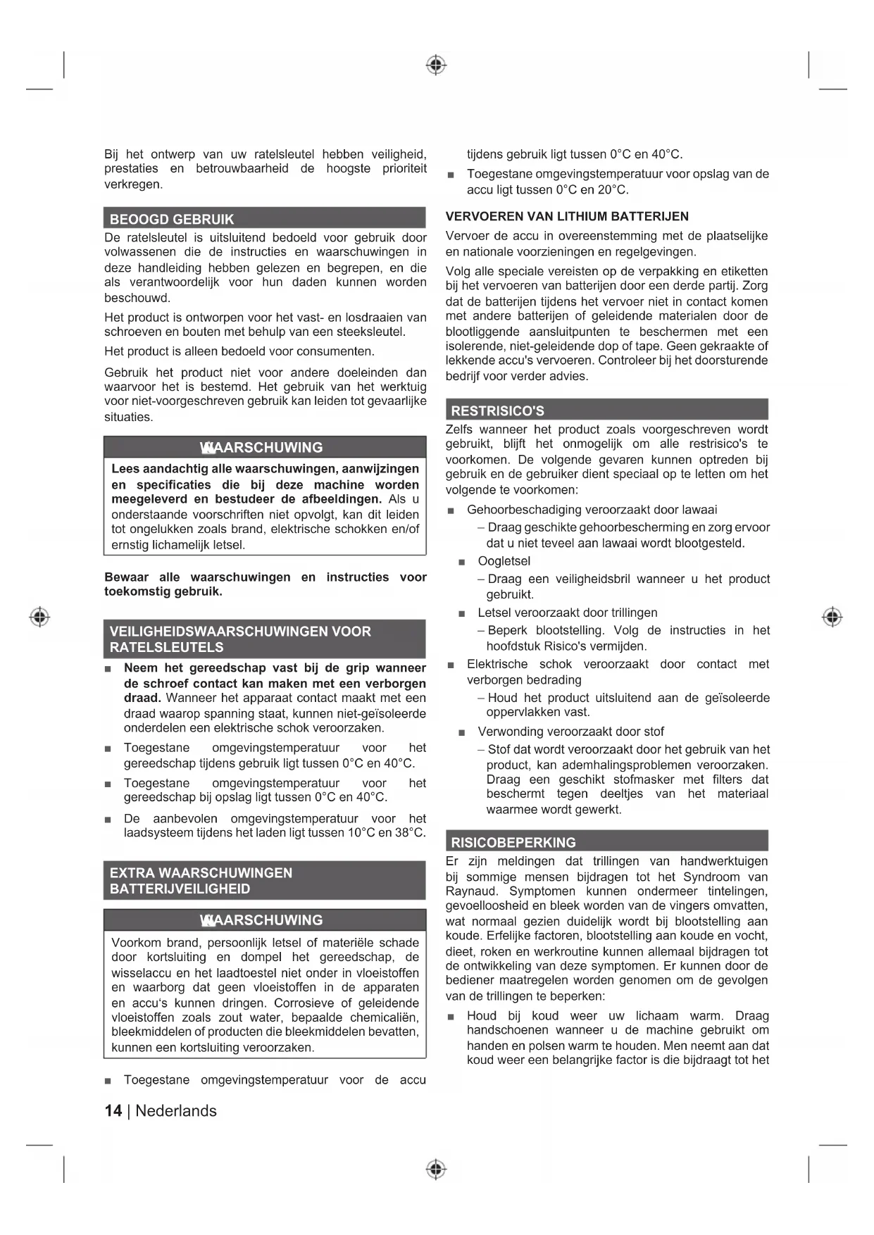 ELBij het ontwerp van uw ratelsleutel hebben veiligheid, prestaties en betrouwbaarheid de hoogste prioriteit verkregen. BEOOGD GEBRUIK De ratelsleutel is uitsluitend bedoeld voor gebruik door volwassenen die de instructies en waarschuwingen in deze handleiding hebben gelezen en begrepen, en die als verantwoordelijk voor hun daden kunnen worden beschouwd. Het product is ontworpen voor het vast- en losdraaien van schroeven en bouten met behulp van een steeksleutel. Het product is alleen bedoeld voor consumenten. Gebruik het product niet voor andere doeleinden dan waarvoor het is bestemd. Het gebruik van het werktuig voor niet-voorgeschreven gebruik kan leiden tot gevaarlijke situaties. WAARSCHUWING Lees aandachtig alle waarschuwingen, aanwijzingen en specificaties die bij deze machine worden meegeleverd en bestudeer de afbeeldingen. Als u onderstaande voorschriften niet opvolgt, kan dit leiden tot ongelukken zoals brand, elektrische schokken en/of ernstig lichamelijk letsel. Bewaar alle waarschuwingen en instructies voor toekomstig gebruik. VEILIGHEIDSWAARSCHUWINGEN VOOR RATELSLEUTELS ■ Neem het gereedschap vast bij de grip wanneer de schroef contact kan maken met een verborgen draad. Wanneer het apparaat contact maakt met een draad waarop spanning staat, kunnen niet-geïsoleerde onderdelen een elektrische schok veroorzaken. ■ Toegestane omgevingstemperatuur voor het gereedschap tijdens gebruik ligt tussen 0°C en 40°C. ■ Toegestane omgevingstemperatuur voor het gereedschap bij opslag ligt tussen 0°C en 40°C. ■ De aanbevolen omgevingstemperatuur voor het laadsysteem tijdens het laden ligt tussen 10°C en 38°C. EXTRA WAARSCHUWINGEN BATTERIJVEILIGHEID WAARSCHUWING Voorkom brand, persoonlijk letsel of materiële schade door kortsluiting en dompel het gereedschap, de wisselaccu en het laadtoestel niet onder in vloeistoffen en waarborg dat geen vloeistoffen in de apparaten en accu‘s kunnen dringen. Corrosieve of geleidende vloeistoffen zoals zout water, bepaalde chemicaliën, bleekmiddelen of producten die bleekmiddelen bevatten, kunnen een kortsluiting veroorzaken. ■ Toegestane omgevingstemperatuur voor de accu tijdens gebruik ligt tussen 0°C en 40°C. ■ Toegestane omgevingstemperatuur voor opslag van de accu ligt tussen 0°C en 20°C.