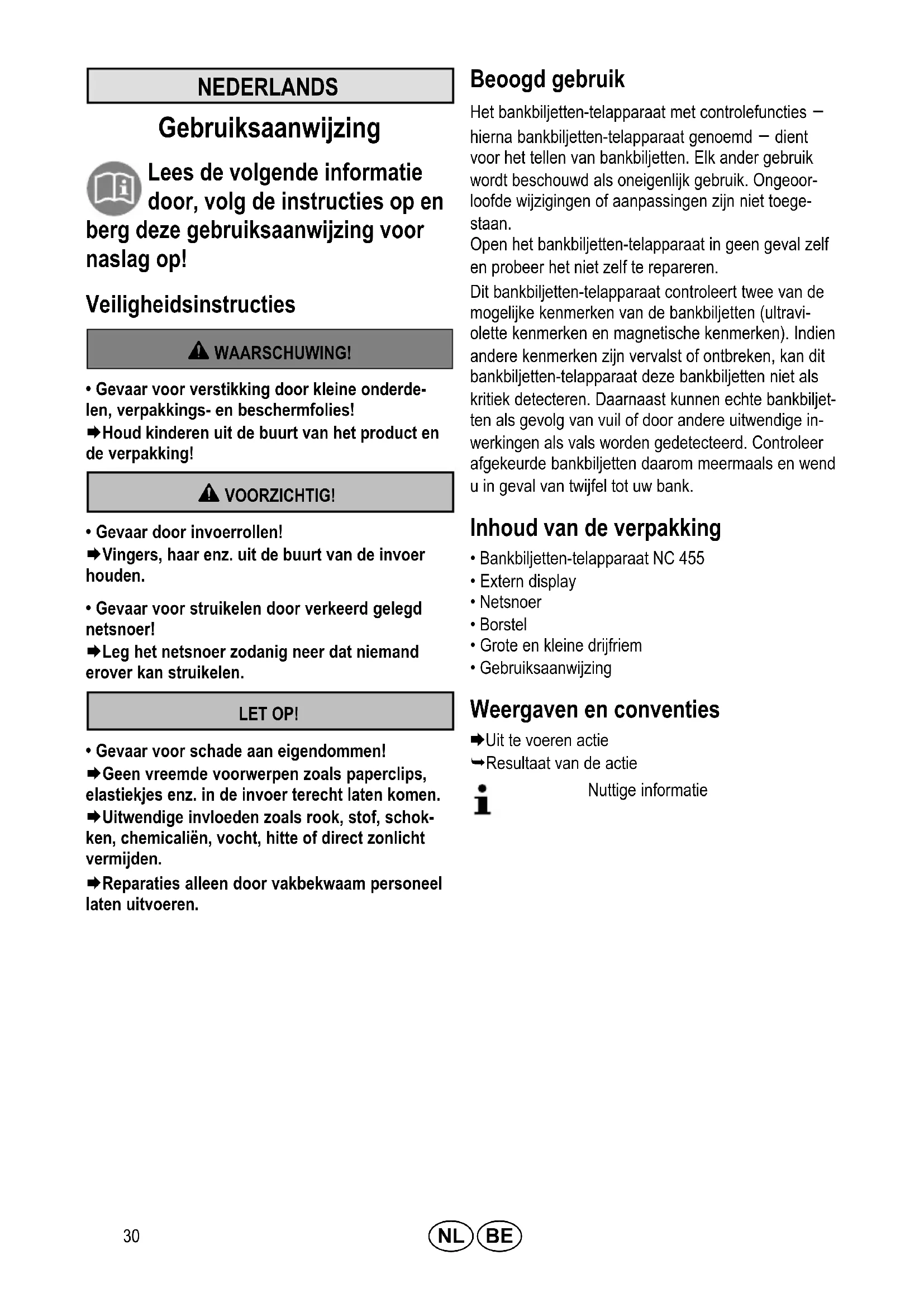- Gevaar voor schade aan eigendommen! Æ Geen vreemde voorwerpen zoals paperclips, elastiekjes enz. in de invoer terecht laten komen. Æ Uitwendige invloeden zoals rook, stof, schok ken, chemicaliën, vocht, hitte of direct zonlicht vermijden. Æ Reparaties alleen door vakbekwaam personeel laten uitvoeren. Beoogd gebruik Het bankbiljetten-telapparaat met controlefuncties – hierna bankbiljetten-telapparaat genoemd – dient voor het tellen van bankbiljetten. Elk ander gebruik wordt beschouwd als oneigenlijk gebruik. Ongeoor loofde wijzigingen of aanpassingen zijn niet toege staan. Open het bankbiljetten-telapparaat in geen geval zelf en probeer het niet zelf te repareren. Dit bankbiljetten-telapparaat controleert twee van de mogelijke kenmerken van de bankbiljetten (ultravi olette kenmerken en magnetische kenmerken). Indien andere kenmerken zijn vervalst of ontbreken, kan dit bankbiljetten-telapparaat deze bankbiljetten niet als kritiek detecteren. Daarnaast kunnen echte bankbiljet ten als gevolg van vuil of door andere uitwendige in werkingen als vals worden gedetecteerd. Controleer afgekeurde bankbiljetten daarom meermaals en wend u in geval van twijfel tot uw bank. Inhoud van de verpakking