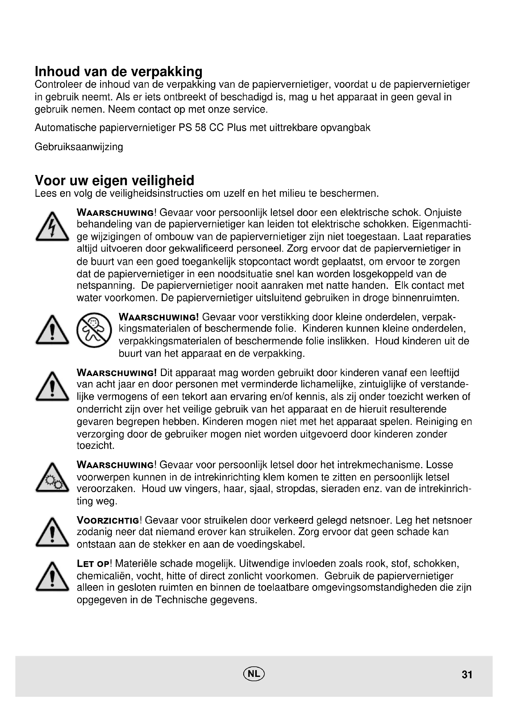 Dichiarazione di conformità Il marchio CE sull’apparecchio attesta la conformità del prodotto. La dichiarazione di conformità è disponibile su www.go-europe.com. Dichiarazione di conformità del livello di protezione ai sensi di DIN 66399-2 Si dichiara che durante la distruzione di documenti il dispositivo soddisfa il livello di protezione P-2 ai sensi di DIN 66399-2. Garanzia Caro cliente, ci congratuliamo con Lei per aver scelto questo apparecchio. In caso di difetti la preghiamo di ritornare l‘apparecchio, completo di imballo originale e scontrino di acquisto, al punto vendita dove è stato eettuato l‘acquisto.31 Inhoud van de verpakking Controleer de inhoud van de verpakking van de papiervernietiger, voordat u de papiervernietiger in gebruik neemt. Als er iets ontbreekt of beschadigd is, mag u het apparaat in geen geval in gebruik nemen. Neem contact op met onze service. Automatische papiervernietiger PS 58 CC Plus met uittrekbare opvangbak Gebruiksaanwijzing Voor uw eigen veiligheid Lees en volg de veiligheidsinstructies om uzelf en het milieu te beschermen. Waarschuwing! Gevaar voor persoonlijk letsel door een elektrische schok. Onjuiste behandeling van de papiervernietiger kan leiden tot elektrische schokken. Eigenmachti- ge wijzigingen of ombouw van de papiervernietiger zijn niet toegestaan. Laat reparaties altijd uitvoeren door gekwaliceerd personeel. Zorg ervoor dat de papiervernietiger in de buurt van een goed toegankelijk stopcontact wordt geplaatst, om ervoor te zorgen dat de papiervernietiger in een noodsituatie snel kan worden losgekoppeld van de netspanning. De papiervernietiger nooit aanraken met natte handen. Elk contact met water voorkomen. De papiervernietiger uitsluitend gebruiken in droge binnenruimten. Waarschuwing! Gevaar voor verstikking door kleine onderdelen, verpak- kingsmaterialen of beschermende folie. Kinderen kunnen kleine onderdelen, verpakkingsmaterialen of beschermende folie inslikken. Houd kinderen uit de buurt van het apparaat en de verpakking. Waarschuwing! Dit apparaat mag worden gebruikt door kinderen vanaf een leeftijd van acht jaar en door personen met verminderde lichamelijke, zintuiglijke of verstande- lijke vermogens of een tekort aan ervaring en/of kennis, als zij onder toezicht werken of onderricht zijn over het veilige gebruik van het apparaat en de hieruit resulterende gevaren begrepen hebben. Kinderen mogen niet met het apparaat spelen. Reiniging en verzorging door de gebruiker mogen niet worden uitgevoerd door kinderen zonder toezicht. Waarschuwing! Gevaar voor persoonlijk letsel door het intrekmechanisme. Losse voorwerpen kunnen in de intrekinrichting klem komen te zitten en persoonlijk letsel veroorzaken. Houd uw vingers, haar, sjaal, stropdas, sieraden enz. van de intrekinrich- ting weg. Voorzichtig! Gevaar voor struikelen door verkeerd gelegd netsnoer. Leg het netsnoer zodanig neer dat niemand erover kan struikelen. Zorg ervoor dat geen schade kan ontstaan aan de stekker en aan de voedingskabel. Let op! Materiële schade mogelijk. Uitwendige invloeden zoals rook, stof, schokken, chemicaliën, vocht, hitte of direct zonlicht voorkomen. Gebruik de papiervernietiger alleen in gesloten ruimten en binnen de toelaatbare omgevingsomstandigheden die zijn opgegeven in de Technische gegevens. n32 Overzicht De volgende afbeeldingen tonen uw papiervernietiger in detail.
