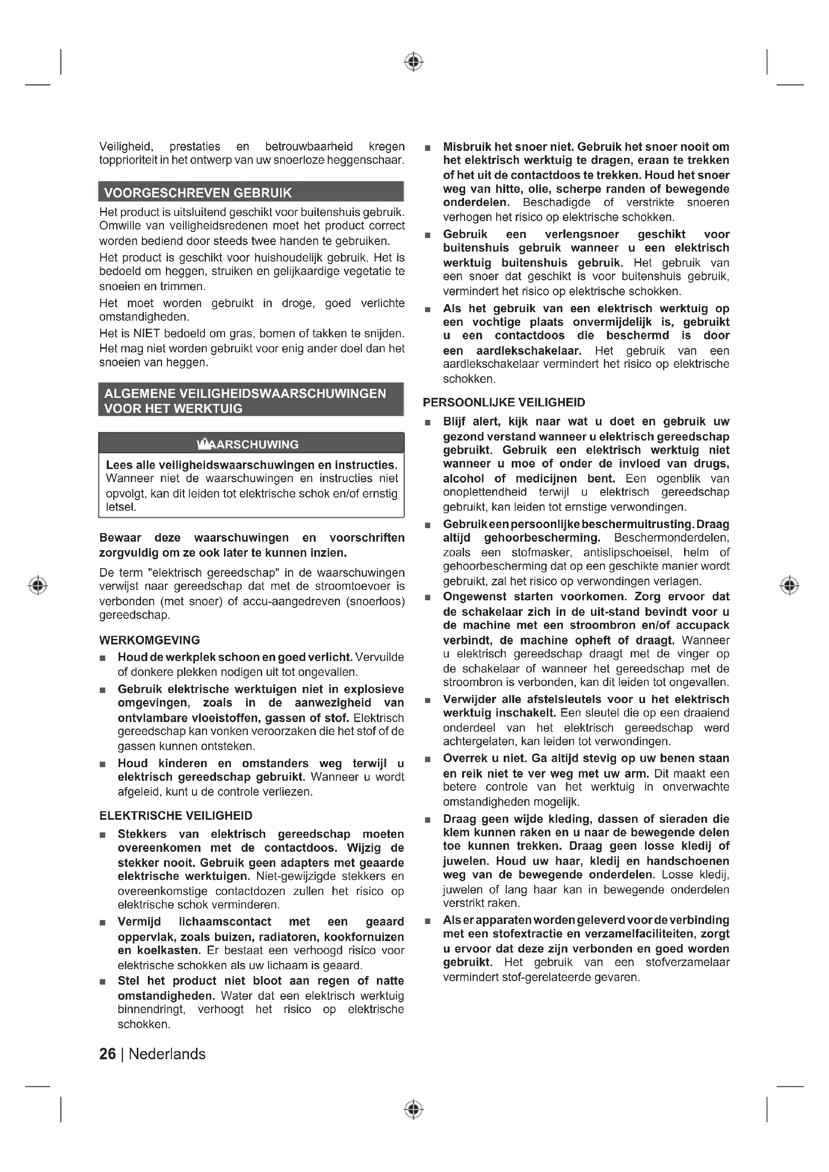 DREVEN WERKTUIG ■ Herlaad enkel met de oplader die door de fabrikant is gespecificeerd. Een oplader die voor een type accupack is geschikt kan een brandgevaar betekenen wanneer het met een ander accupack wordt gebruikt. ■ Gebruik elektrisch gereedschap uitsluitend met de specifiek toegewezen accupacks. Het gebruik van andere accupacks kan leiden tot risico's op letsels en brand. ■ Wanneer het accupack niet wordt gebruikt, moet u het weg houden van andere metalen objecten, zoals papierclips, munten, sleutels, spijkers, schroeven of andere kleine metalen voorwerpen die een verbinding kan maken van een terminal naar een andere. De batterijterminals kortsluiten kan leiden tot vonken, brandwonden of brand. ■ In oneigenlijke omstandigheden, kan een vloeistof uit de accu lekken; vermijd contact hiermee. Als per ongeluk contact voorkomt, spoelt u met water. Als de vloeistof in contact komt met de ogen, dient u bijkomend medische hulp te raadplegen. Vloeistof die uit de accu lekt, kan irritatie of brandwonden veroorzaken. ONDERHOUD ■ Laat uw elektrisch gereedschap onderhouden door een gekwalificeerd onderhoudspersoon en gebruik hierbij uitsluitend identieke vervangonderdelen. Dit zal ervoor zorgen dat de veiligheid van het werktuig wordt behouden. VEILIGHEIDSWAARSCHUWINGEN VOOR HAAGTRIMMER ■ Houd alle lichaamsdelen weg van het snijblad. Verwijder geen gesnoeid materiaal of houd geen materiaal dat moet worden gesnoeid vast wanneer de snijbladen bewegen. Zorg ervoor dat de schakelaar is uitgeschakeld wanneer u geblokkeerd materiaal vrijmaakt. Een ogenblik van onoplettendheid tijdens het gebruik van het product kan leiden tot ernstige persoonlijke letsels. ■ Houd de heggeschaar aan het handvat vast als het snijblad is stilgevallen. Wanneer u de heggeschaar transporteert of opbergt, dient u altijd de beschermhoes van de snijbladen te bevestigen. Wanneer u de heggeschaar degelijk gebruikt, vermindert de kans op verwondingen door de snijbladen. ■ Houd het werktuig uitsluitend aan de geïsoleerde handvatten vast omdat de snijbladen in contact kunnen komen met verborgen kabels of het eigen stroomsnoer. Snijbladen die in contact komen met een kabel "onder spanning" kunnen ervoor zorgen dat blootgestelde metalen onderdelen van het werktuig ook "onder spanning" komen te staan, wat de gebruiker een elektrische schok kan geven. BIJKOMENDE VEILIGHEIDSVOORSCHRIFTEN ■ Maak voor elk gebruik de werkplek vrij. Verwijder alle voorwerpen, zoals snoeren, lampen, draad of kabels die in het zaagmechanisme verstrikt kunnen raken of weggeworpen worden. ■ Controleer de haag op vreemde voorwerpen, zoals draadomheiningen. ■ Gebruik de heggenschaar nooit in de buurt van stroomkabels, afsluitingen, palen, gebouwen of andere niet-verplaatsbare voorwerpen. ■ Pas op voor weggeslingerde voorwerpen; houd alle omstaanders, kinderen en huisdieren op tenminste 15 m afstand van het werkgebied. ■ Gebruik dit apparaat niet op plekken waar u niet goed kunt zien. De gebruiker heeft een duidelijk overzicht nodig van het werkgebied om mogelijke gevaren te identificeren. ■ Controleer de machine voor elk gebruik. Controleer op losse binders. Zorg ervoor dat alle beschermers en handvatten goed en veilig zijn vastgemaakt. Vervang28 | Nederlands alle beschadigde onderdelen voor gebruik. Controleer het accupack op lekken. ■ Wijzig de machine op geen enkele manier. ■ Laat kinderen of niet-opgeleide personen dit product niet gebruiken. ■ Draag volledige gezichts- en gehoorbescherming terwijl u het product bedient. Als u op een plaats werkt waar het risico bestaat op vallende voorwerpen moet een veiligheidshelm worden gedragen. ■ Maak lang haar vast boven schouderhoogte om te voorkomen dat het verstrikt raakt in de bewegende delen. ■ Gebruik het product niet wanneer u moe, ziek of onder de invloed bent van alcohol, drugs of medicijnen. ■ Bewaar steeds een stevige houvast en goed evenwicht. Overrek u niet. Wanneer u overreikt kan dit leiden tot evenwichtsverlies of blootstelling aan hete oppervlakken. ■ Voor u de machine start, dient u ervoor te zorgen dat zaagbladen niet in contact kunnen komen met andere voorwerpen. ■ Draag de haagtrimmer tijdens het gebruik altijd stevig met beide handen op de twee handgrepen en controleer of de gebruikspositie vielig en stevig is. De fabrikant raadt het gebruik van een ladder niet aan. Gebruik een verlengaccessoire voor hoger trimwerk. ■ zaagbladen zijn scherp. Draag zware antislip beschermhandschoenen als u het zaagblad hanteert. Plaats uw hand of vingers niet tussen de snijbladen of in een positie waar ze gekneld kunnen raken of snijwonden kunnen oplopen. Raak het snijblad nooit aan of voer geen onderhoudswerken uit tenzij het batterijpack verwijderd is. ■ Schakel de machine uit en verwijder het batterijpack voor: ● werkpositie van het snijmechanisme afstellen ● blokkering schoon- of vrijmaken ● het product onbeheerd achterlaten ● ontroleren, onderhoud of werken aan het product ■ Forceer de heggenschaar niet door dicht struikgewas. Dit kan ervoor zorgen dat het snijblad vast raakt en vertraagt. Als de snijbladen vertragen, vermindert u het tempo. ■ Probeer geen twijgen of takken te snoeien die dikker zijn dan 26 mm of die te groot zijn voor het snijblad. Gebruik een handzaag of snoeizaag om grote stammen te snoeien. ■ Het gebruik van gehoorbescherming vermindert de mogelijkheid om waarschuwingen (verbaal of alarmen) te horen. De gebruiker moet extra aandacht hebben voor wat er op de werkplaats gebeurt. ■ Uw heggenschaar is uitgerust met twee snoeisnelheden: ● Instelling 1 (hoge snelheid) - Gebruik deze instelling als standaardmodus voor uw heggenschaar. In de hoge snelheidsinstelling snoeit het maaiblad aan de maximumsnelheid, wat u toelaat om snel en nauwkeurig te snoeien. Deze snelheid is het meest geschikt voor het regelmatig onderhoud van uw haag. ● Instelling 2 (hoog koppel) - Gebruik deze instelling om dikke of dichte heggen te snoeien. De