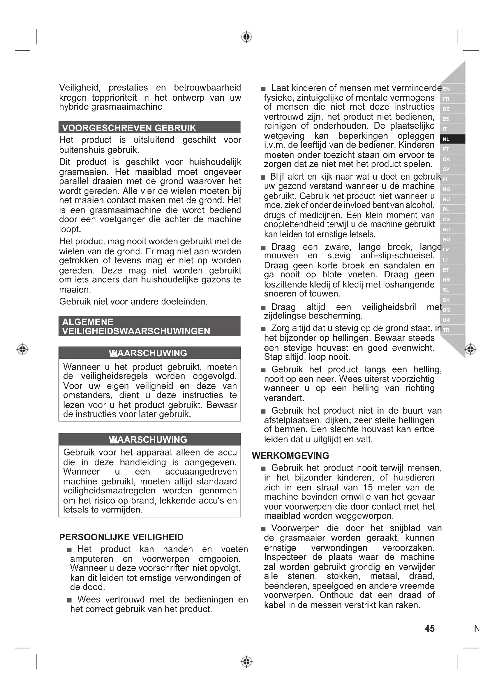 Parti o accessori venduti separatamente Note Avvertenze Le parole e i messaggi di avvertimento spiegano i livelli di rischio associato con il prodotto. PERICOLO Indica una situazione pericolosa che, se non evitata attentamente, potrà causare gravi lesioni alla persona o morte. AVVERTENZA Indica una situazione potenzialmente pericolosa che, se non evitata attentamente, potrà causare gravi lesioni alla persona o morte ATTENZIONE Indica una situazione potenzialmente pericolosa che, se non evitata attentamente, potrà causare lesioni minori o moderate alla persona. ATTENZIONE (senza simbolo di allarme in materia di sicurezza) Indica una situazione che può provocare danni materiali. 44 | ItalianoVeiligheid, prestaties en betrouwbaarheid kregen topprioriteit in het ontwerp van uw hybride grasmaaimachine VOORGESCHREVEN GEBRUIK Het product is uitsluitend geschikt voor buitenshuis gebruik. Dit product is geschikt voor huishoudelijk grasmaaien. Het maaiblad moet ongeveer parallel draaien met de grond waarover het wordt gereden. Alle vier de wielen moeten bij het maaien contact maken met de grond. Het is een grasmaaimachine die wordt bediend door een voetganger die achter de machine loopt. Het product mag nooit worden gebruikt met de wielen van de grond. Er mag niet aan worden getrokken of tevens mag er niet op worden gereden. Deze mag niet worden gebruikt om iets anders dan huishoudelijke gazons te maaien. Gebruik niet voor andere doeleinden. ALGEMENE VEILIGHEIDSWAARSCHUWINGEN WAARSCHUWING Wanneer u het product gebruikt, moeten de veiligheidsregels worden opgevolgd. Voor uw eigen veiligheid en deze van omstanders, dient u deze instructies te lezen voor u het product gebruikt. Bewaar de instructies voor later gebruik. WAARSCHUWING Gebruik voor het apparaat alleen de accu die in deze handleiding is aangegeven. Wanneer u een accuaangedreven machine gebruikt, moeten altijd standaard veiligheidsmaatregelen worden genomen om het risico op brand, lekkende accu's en letsels te vermijden. PERSOONLIJKE VEILIGHEID ■ Het product kan handen en voeten amputeren en voorwerpen omgooien. Wanneer u deze voorschriften niet opvolgt, kan dit leiden tot ernstige verwondingen of de dood. ■ Wees vertrouwd met de bedieningen en het correct gebruik van het product. ■ Laat kinderen of mensen met verminderde fysieke, zintuigelijke of mentale vermogens of mensen die niet met deze instructies vertrouwd zijn, het product niet bedienen, reinigen of onderhouden. De plaatselijke wetgeving kan beperkingen opleggen i.v.m. de leeftijd van de bediener. Kinderen moeten onder toezicht staan om ervoor te zorgen dat ze niet met het product spelen. ■ Blijf alert en kijk naar wat u doet en gebruik uw gezond verstand wanneer u de machine gebruikt. Gebruik het product niet wanneer u moe, ziek of onder de invloed bent van alcohol, drugs of medicijnen. Een klein moment van onoplettendheid terwijl u de machine gebruikt kan leiden tot ernstige letsels. ■ Draag een zware, lange broek, lange mouwen en stevig anti-slip-schoeisel. Draag geen korte broek en sandalen en ga nooit op blote voeten. Draag geen loszittende kledij of kledij met loshangende snoeren of touwen. ■ Draag altijd een veiligheidsbril met zijdelingse bescherming. ■ Zorg altijd dat u stevig op de grond staat, in het bijzonder op hellingen. Bewaar steeds een stevige houvast en goed evenwicht. Stap altijd, loop nooit. ■ Gebruik het product langs een helling, nooit op een neer. Wees uiterst voorzichtig wanneer u op een helling van richting verandert. ■ Gebruik het product niet in de buurt van afstelplaatsen, dijken, zeer steile hellingen of bermen. Een slechte houvast kan ertoe leiden dat u uitglijdt en valt. WERKOMGEVING ■ Gebruik het product nooit terwijl mensen, in het bijzonder kinderen, of huisdieren zich in een straal van 15 meter van de machine bevinden omwille van het gevaar voor voorwerpen die door contact met het maaiblad worden weggeworpen. ■ Voorwerpen die door het snijblad van de grasmaaier worden geraakt, kunnen ernstige verwondingen veroorzaken. Inspecteer de plaats waar de machine zal worden gebruikt grondig en verwijder alle stenen, stokken, metaal, draad, beenderen, speelgoed en andere vreemde voorwerpen. Onthoud dat een draad of kabel in de messen verstrikt kan raken. 45 Nederlands |