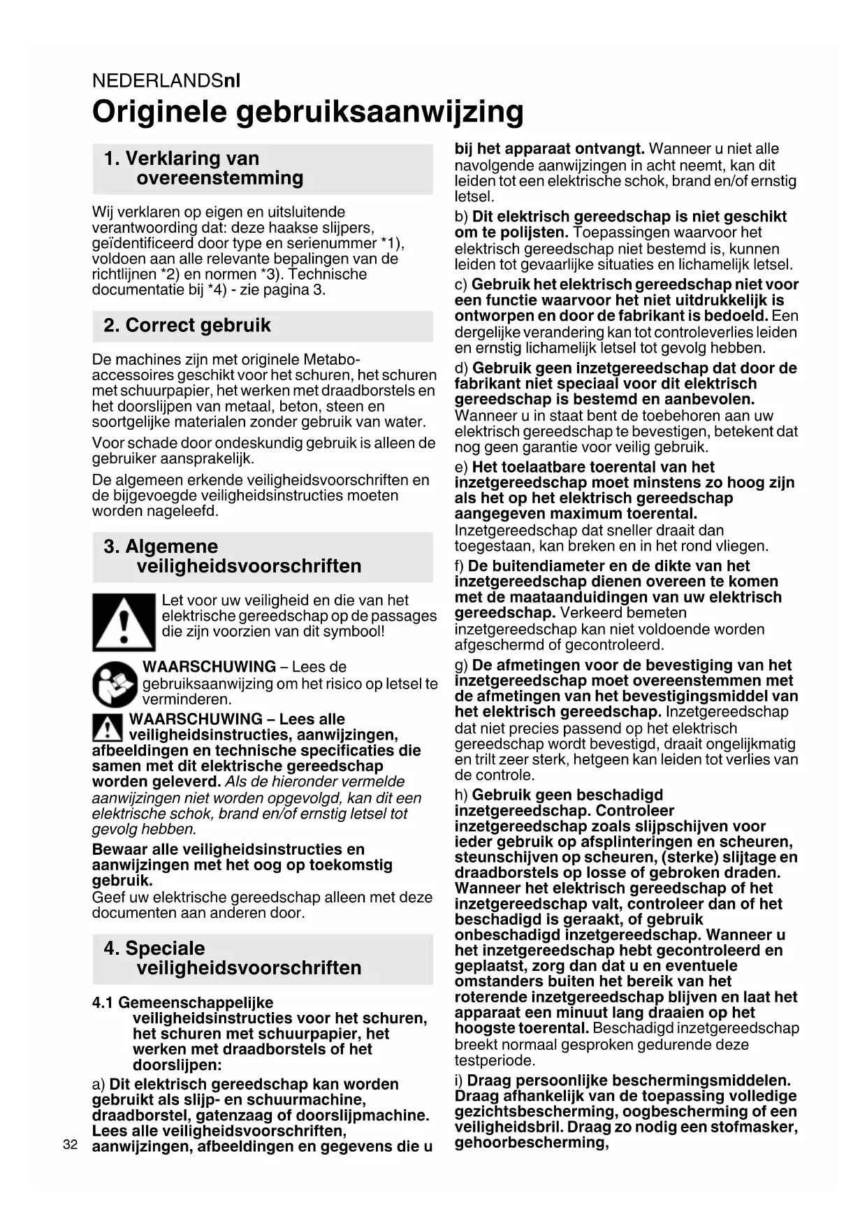 Originele gebruiksaanwijzing Wij verklaren op eigen en uitsluitende verantwoording dat: deze haakse slijpers, geïdentificeerd door type en serienummer *1), voldoen aan alle relevante bepalingen van de richtlijnen *2) en normen *3). Technische documentatie bij *4) - zie pagina 3. De machines zijn met originele Metabo- accessoires geschikt voor het schuren, het schuren met schuurpapier, het werken met draadborstels en het doorslijpen van metaal, beton, steen en soortgelijke materialen zonder gebruik van water. Voor schade door ondeskundig gebruik is alleen de gebruiker aansprakelijk. De algemeen erkende veiligheidsvoorschriften en de bijgevoegde veiligheidsinstructies moeten worden nageleefd. Let voor uw veiligheid en die van het elektrische gereedschap op de passages die zijn voorzien van dit symbool! WAARSCHUWING – Lees de gebruiksaanwijzing om het risico op letsel te verminderen. WAARSCHUWING – Lees alle veiligheidsinstructies, aanwijzingen, afbeeldingen en technische specificaties die samen met dit elektrische gereedschap worden geleverd. Als de hieronder vermelde aanwijzingen niet worden opgevolgd, kan dit een elektrische schok, brand en/of ernstig letsel tot gevolg hebben. Bewaar alle veiligheidsinstructies en aanwijzingen met het oog op toekomstig gebruik. Geef uw elektrische gereedschap alleen met deze documenten aan anderen door.