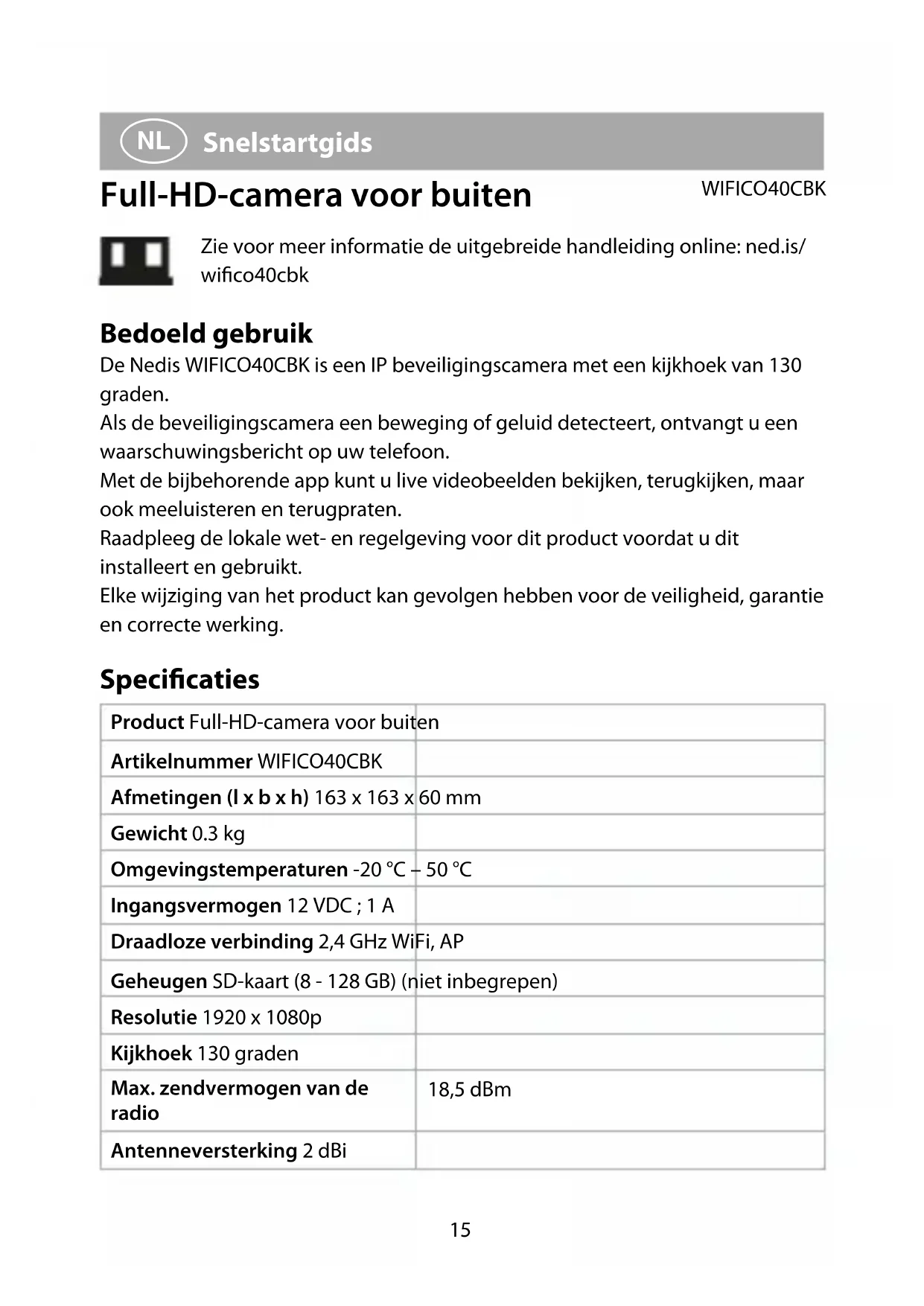 Snelstartgids Full-HD-camera voor buiten WIFICO40CBK Zie voor meer informatie de uitgebreide handleiding online: ned.is/ wico40cbk Bedoeld gebruik De Nedis WIFICO40CBK is een IP beveiligingscamera met een kijkhoek van 130 graden. Als de beveiligingscamera een beweging of geluid detecteert, ontvangt u een waarschuwingsbericht op uw telefoon. Met de bijbehorende app kunt u live videobeelden bekijken, terugkijken, maar ook meeluisteren en terugpraten. Raadpleeg de lokale wet- en regelgeving voor dit product voordat u dit installeert en gebruikt. Elke wijziging van het product kan gevolgen hebben voor de veiligheid, garantie en correcte werking. Specicaties Product Full-HD-camera voor buiten Artikelnummer WIFICO40CBK Afmetingen (l x b x h) 163 x 163 x 60 mm Gewicht 0.3 kg Omgevingstemperaturen -20 °C – 50 °C Ingangsvermogen 12 VDC ; 1 A Draadloze verbinding 2,4 GHz WiFi, AP Geheugen SD-kaart (8 - 128 GB) (niet inbegrepen) Resolutie 1920 x 1080p Kijkhoek 130 graden Max. zendvermogen van de radio 18,5 dBm Antenneversterking 2 dBi16 Frequentiebereik 2412 - 2472 MHz Waterdicht IP65 Belangrijkste onderdelen (afbeelding A) 1 Stroomadapter 2 Microfoon 3 Cameralens 4 Statusindicatie LED 5 Wi-Fi-antenne 6 Reset knop 7 Micro SD-kaartsleuf 8 Luidspreker Veiligheidsvoorschriften