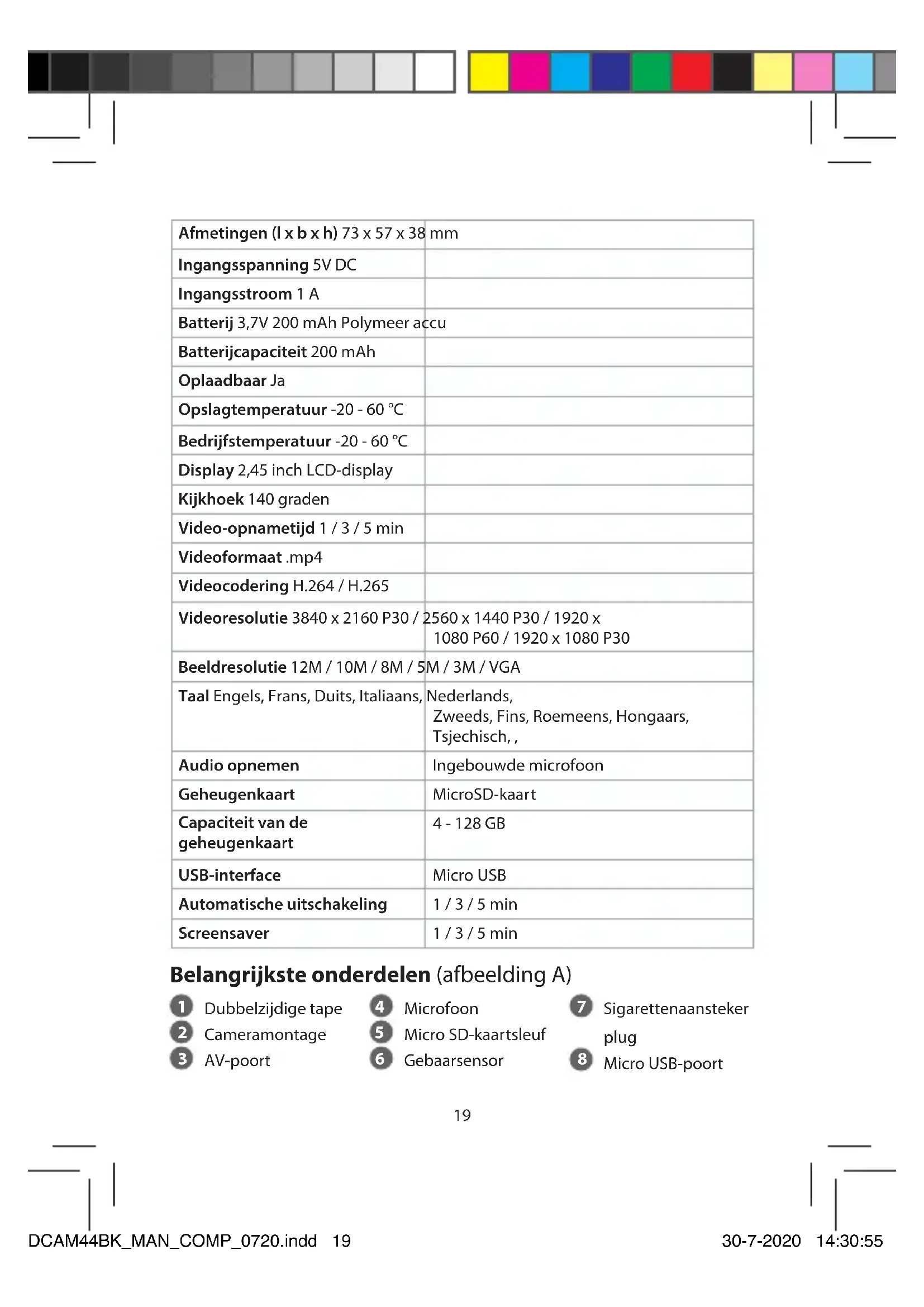 Snelstartgids Dashboardcamera DCAM44BK Zie voor meer informatie de uitgebreide handleiding online: ned.is/dcam44bk Bedoeld gebruik De DCAM44BK is een dashboardcamera die op de voorruit van uw voertuig kan worden gemonteerd.Dit product is bedoeld voor het maken van foto's, het opnemen van video's en het afspelen van opnames en is uitgerust met een parkeermodus en een g-sensor.Het product is niet bedoeld voor professioneel gebruik.Elke wijziging van het product kan gevolgen hebben voor de veiligheid, garantie en correcte werking. Specicaties Product DashboardcameraArtikelnummer DCAM44BKDCAM44BK_MAN_COMP_0720.indd 18 30-7-2020 14:30:5519 Afmetingen (l x b x h) 73 x 57 x 38 mm Ingangsspanning 5V DC Ingangsstroom 1 A Batterij 3,7V 200 mAh Polymeer accu Batterijcapaciteit 200 mAh Oplaadbaar Ja Opslagtemperatuur -20 - 60 °C Bedrijfstemperatuur -20 - 60 °C Display 2,45 inch LCD-display Kijkhoek 140 graden Video-opnametijd 1 / 3 / 5 min Videoformaat .mp4 Videocodering H.264 / H.265 Videoresolutie 3840 x 2160 P30 / 2560 x 1440 P30 / 1920 x 1080 P60 / 1920 x 1080 P30 Beeldresolutie 12M / 10M / 8M / 5M / 3M / VGA Taal Engels, Frans, Duits, Italiaans, Nederlands, Zweeds, Fins, Roemeens, Hongaars, Tsjechisch, , Audio opnemen Ingebouwde microfoon Geheugenkaart MicroSD-kaart Capaciteit van de geheugenkaart