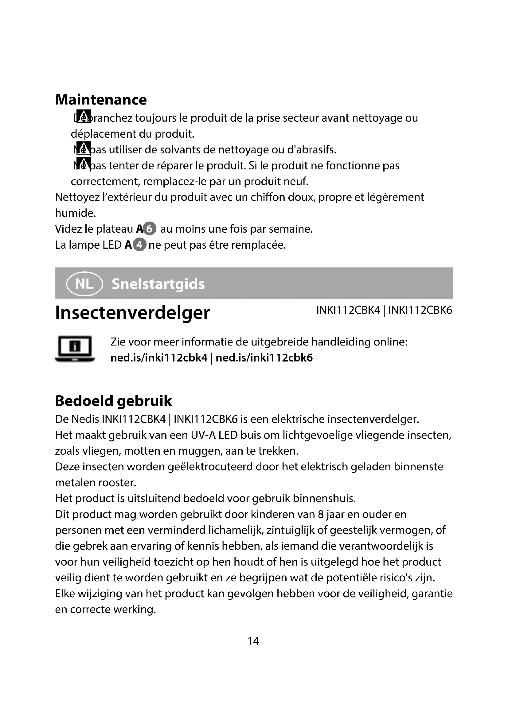 Snelstartgids Insectenverdelger INKI112CBK4 | INKI112CBK6Zie voor meer informatie de uitgebreide handleiding online: ned.is/inki112cbk4 | ned.is/inki112cbk6 Bedoeld gebruik De Nedis INKI112CBK4 | INKI112CBK6 is een elektrische insectenverdelger.Het maakt gebruik van een UV-A LED buis om lichtgevoelige vliegende insecten, zoals vliegen, motten en muggen, aan te trekken.Deze insecten worden geëlektrocuteerd door het elektrisch geladen binnenste metalen rooster.Het product is uitsluitend bedoeld voor gebruik binnenshuis.Dit product mag worden gebruikt door kinderen van 8 jaar en ouder en personen met een verminderd lichamelijk, zintuiglijk of geestelijk vermogen, of die gebrek aan ervaring of kennis hebben, als iemand die verantwoordelijk is voor hun veiligheid toezicht op hen houdt of hen is uitgelegd hoe het product veilig dient te worden gebruikt en ze begrijpen wat de potentiële risico's zijn.Elke wijziging van het product kan gevolgen hebben voor de veiligheid, garantie en correcte werking.15 Belangrijkste onderdelen (afbeelding A) 1 Kettingring 2 Behuizing 3 Metalen rooster 4 UV-A LED lamp 5 Stroomkabel 6 Opvangbak Veiligheidsvoorschriften